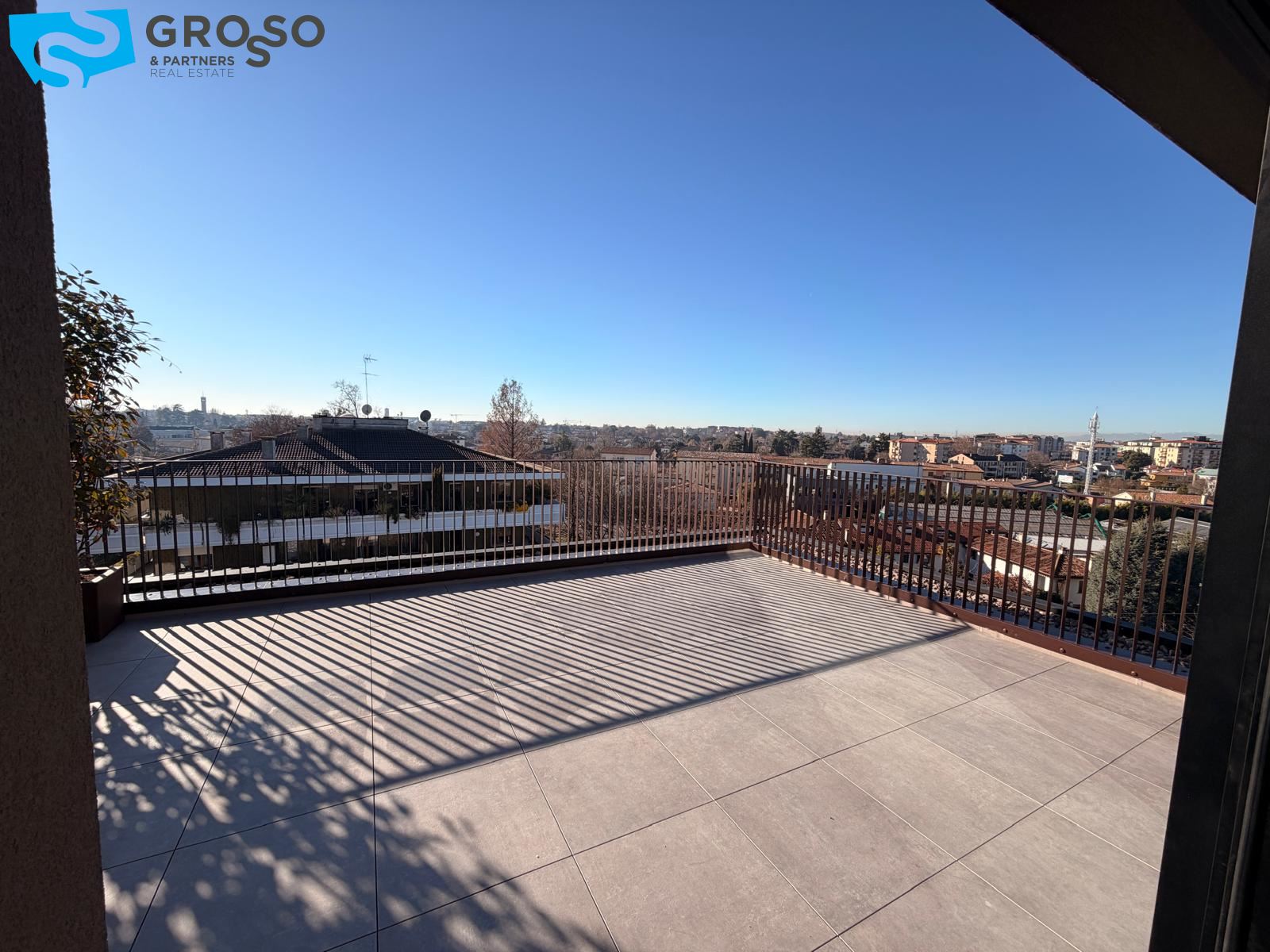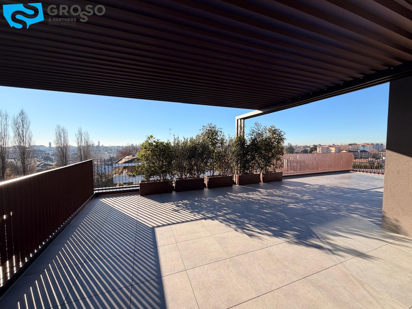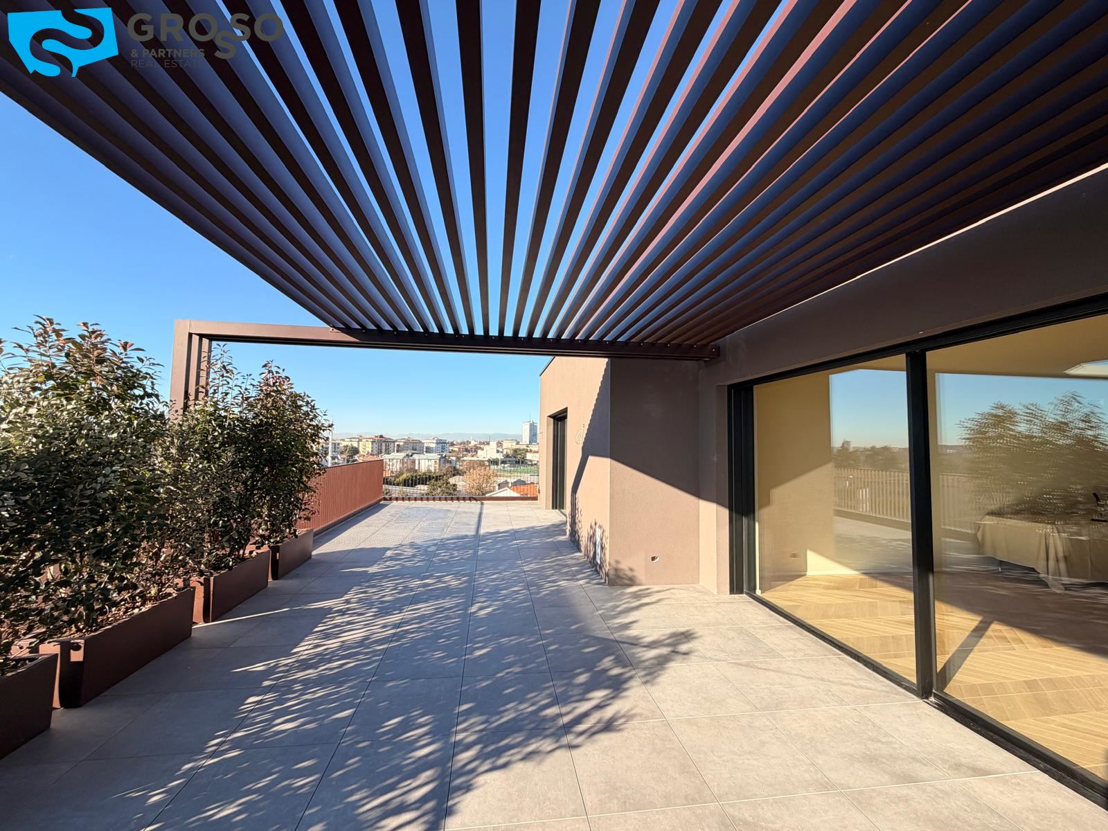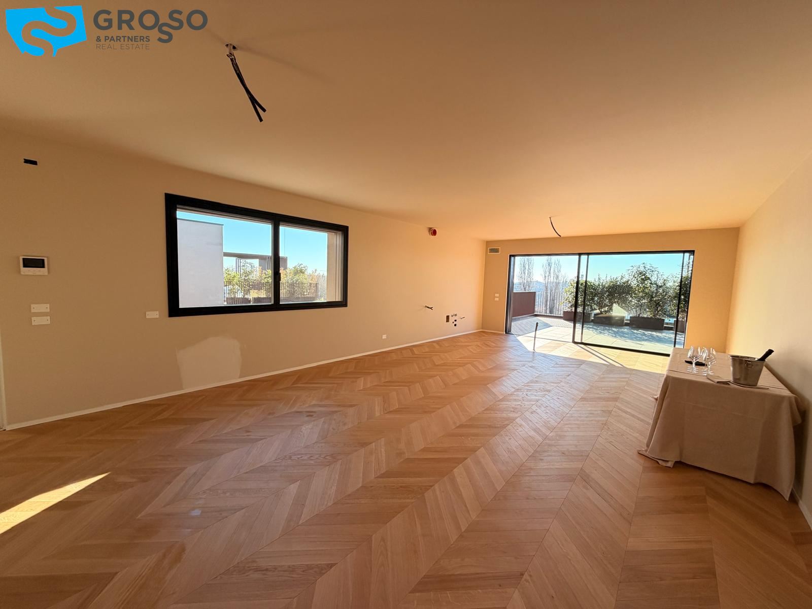 L'attico si compone di un ampio salotto con angolo cottura, tre camere, di cui due matrimoniali e una singola, e tre bagni. Completa l'immobile un'ampia terrazza abitabile, un garage doppio e un posto auto di proprietà.