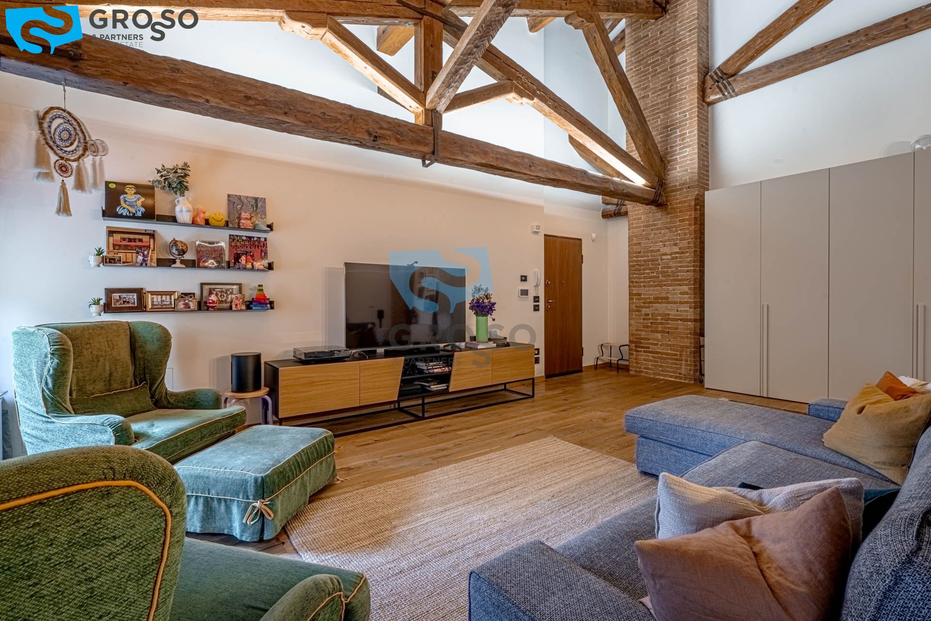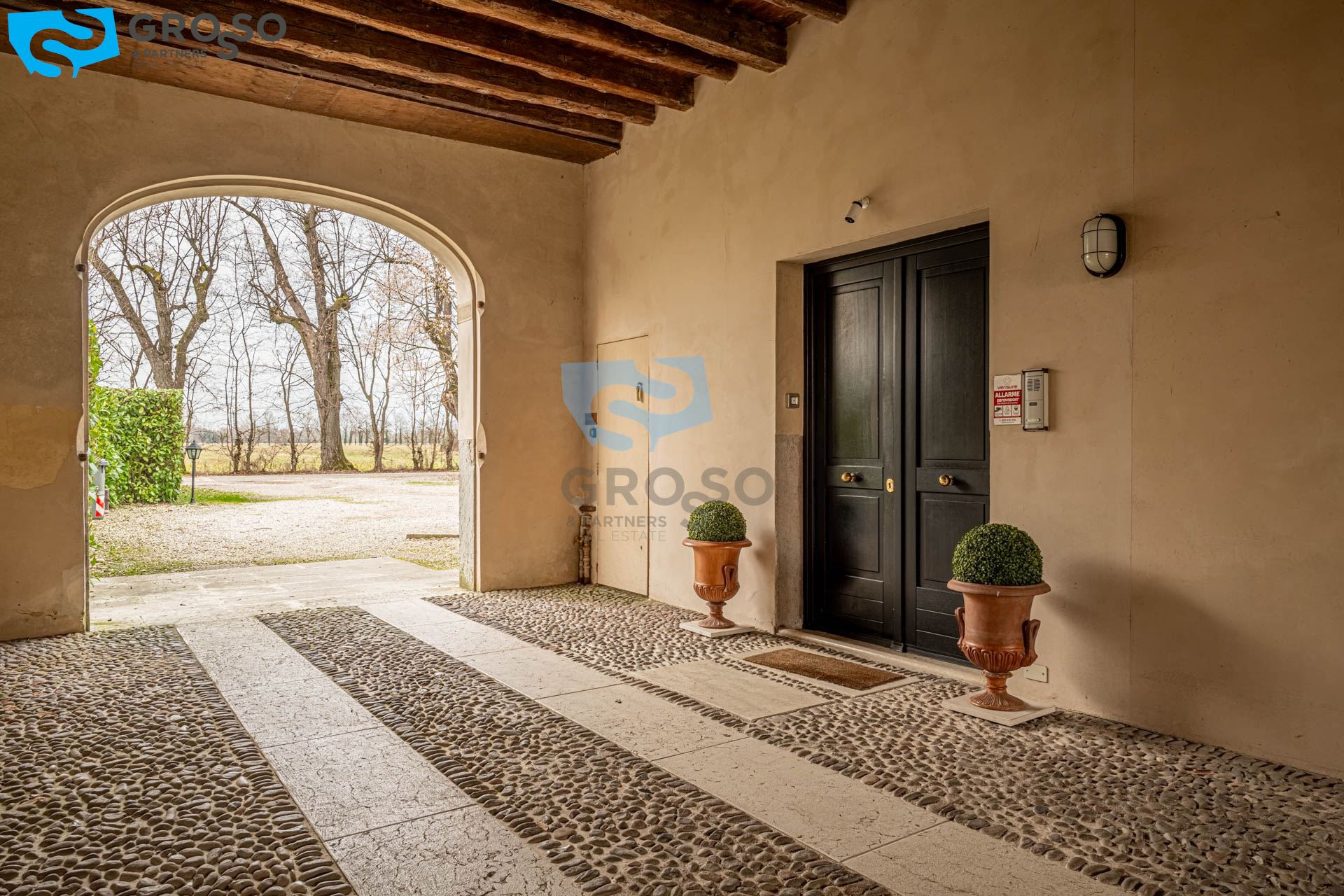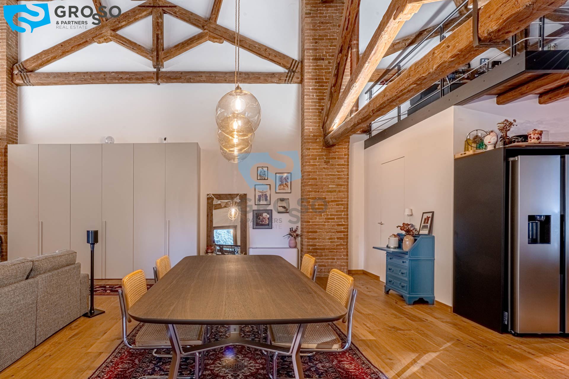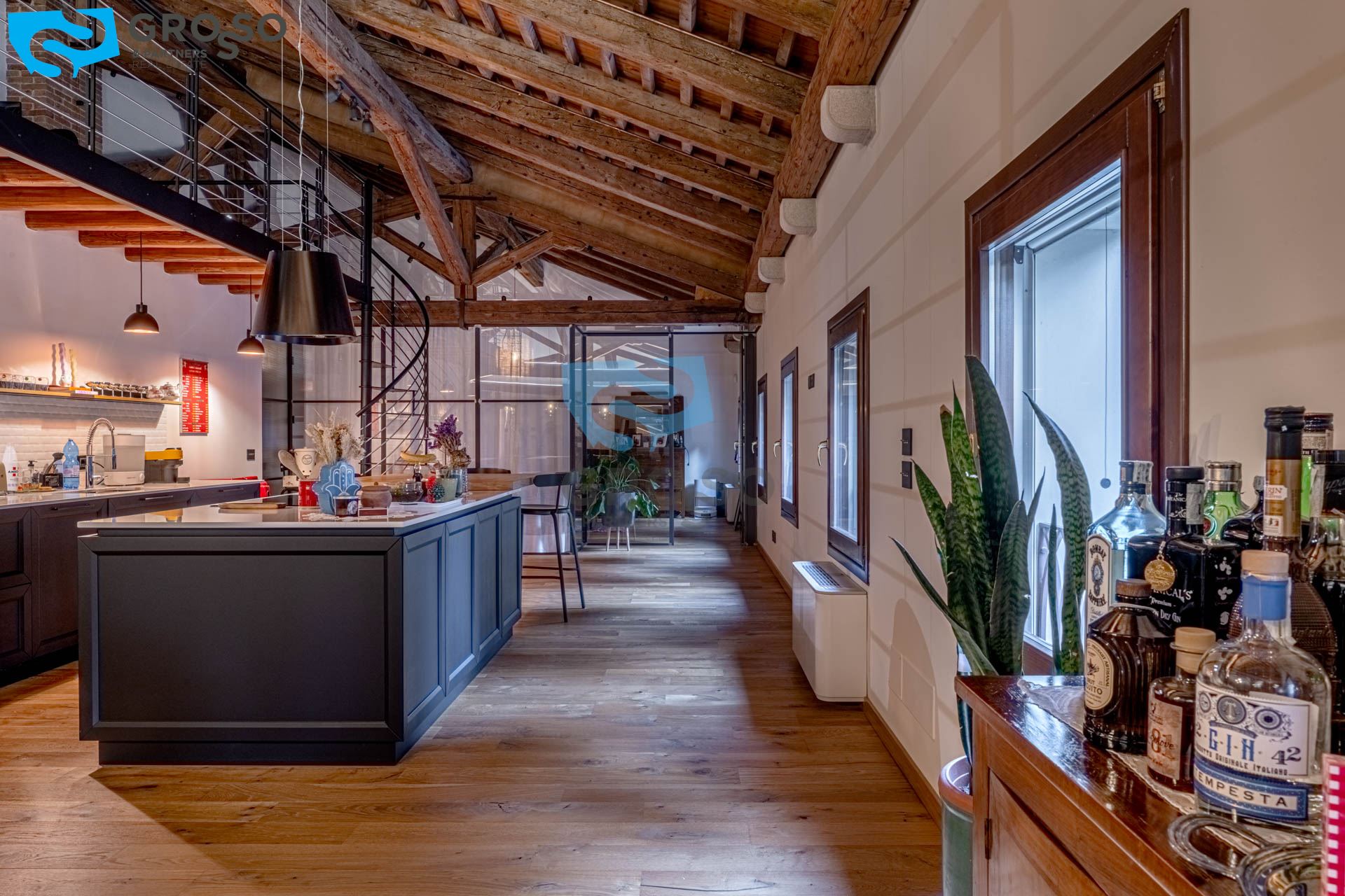 L'appartamento si sviluppa su una superficie calpestabile di 165 mq calpestabili, al primo piano della bellissima barchessa del '700. L'ingresso è sulla scenografica zona giorno open space con salotto e cucina a vista, bagno completo. Una parete vetrata divide la zona living dalla camera matrimoniale con cabina armadio e secondo bagno. Completa l'immobile il soppalco mansardato che può essere adibito a seconda cameretta o studio. Al piano terra troviamo un magazzino e due comodi posti auto scoperti. Riscaldamento autonomo a pavimento e aria condizionata.