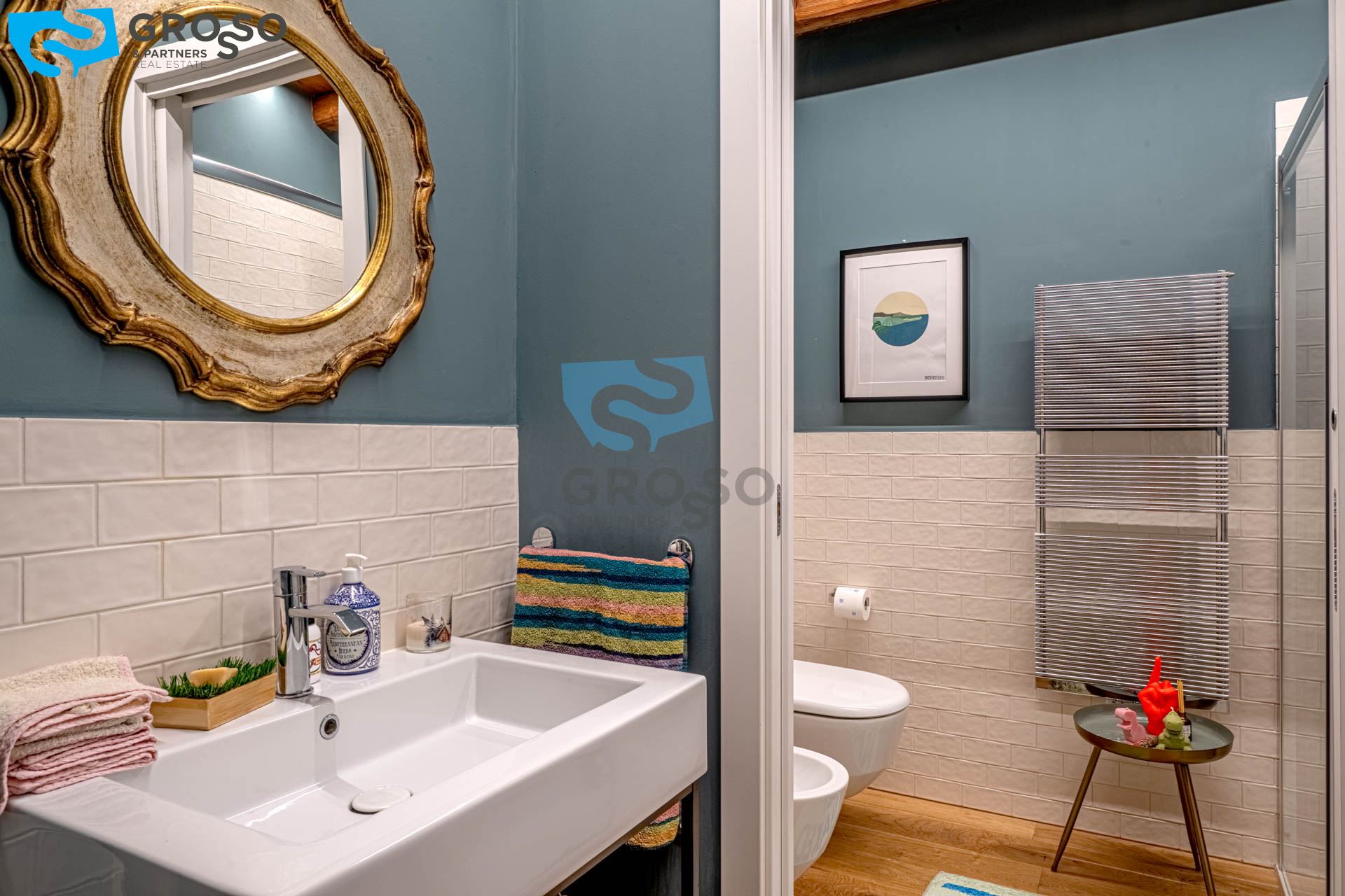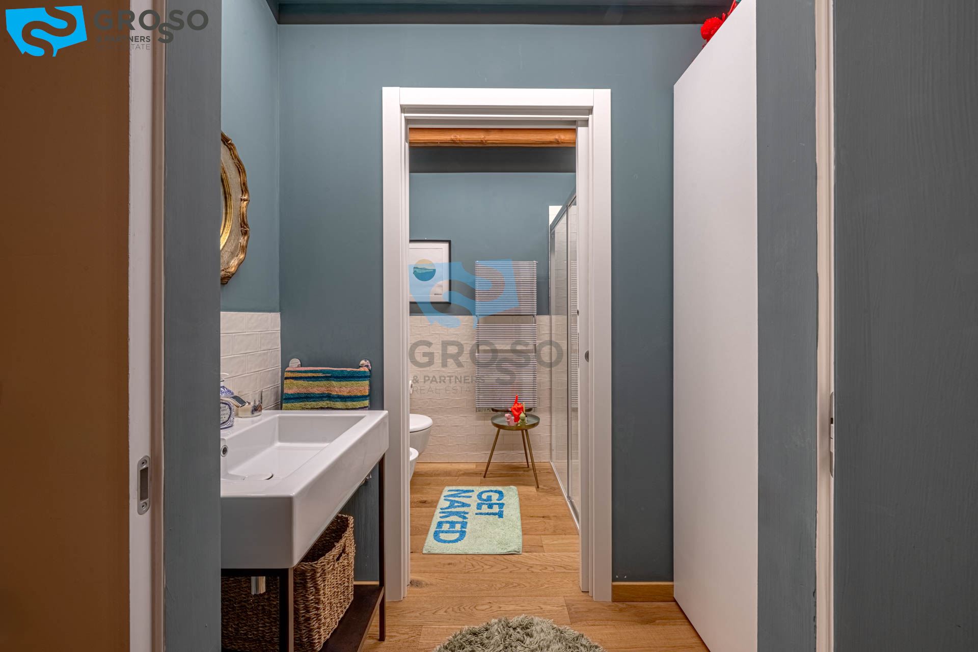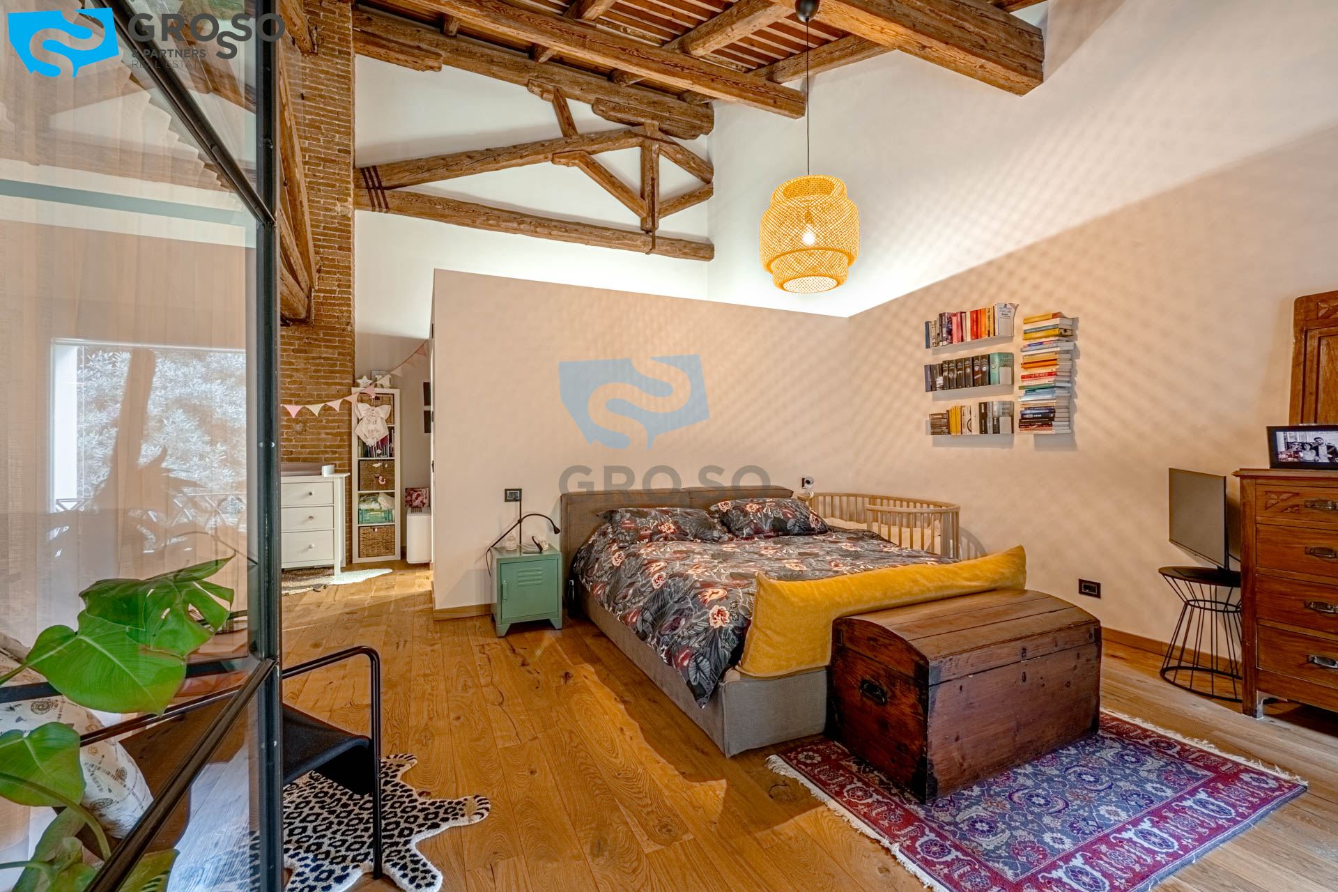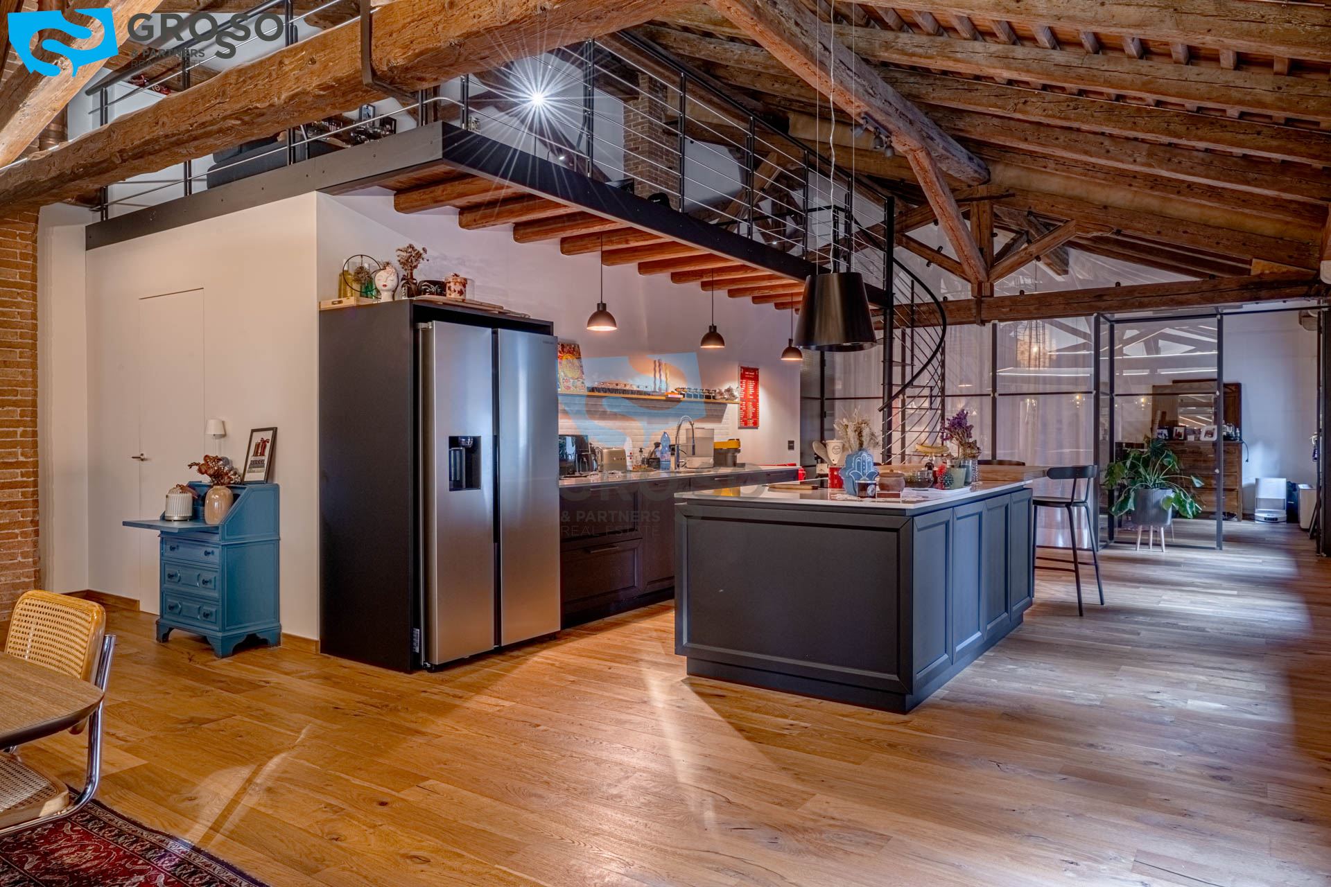 L'appartamento si sviluppa su una superficie calpestabile di 165 mq calpestabili, al primo piano della bellissima barchessa del '700. L'ingresso è sulla scenografica zona giorno open space con salotto e cucina a vista, bagno completo. Una parete vetrata divide la zona living dalla camera matrimoniale con cabina armadio e secondo bagno. Completa l'immobile il soppalco mansardato che può essere adibito a seconda cameretta o studio. Al piano terra troviamo un magazzino e due comodi posti auto scoperti. Riscaldamento autonomo a pavimento e aria condizionata.
