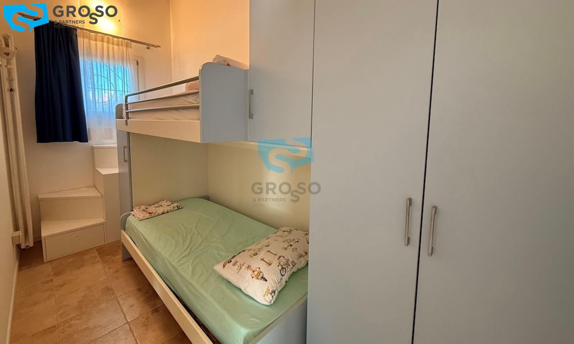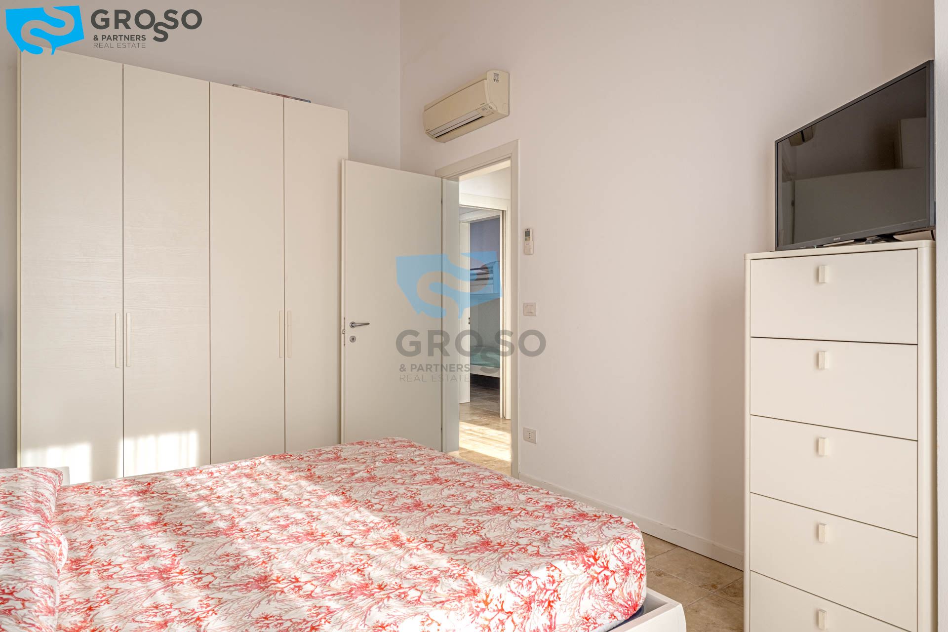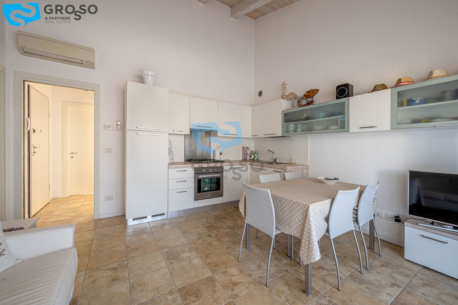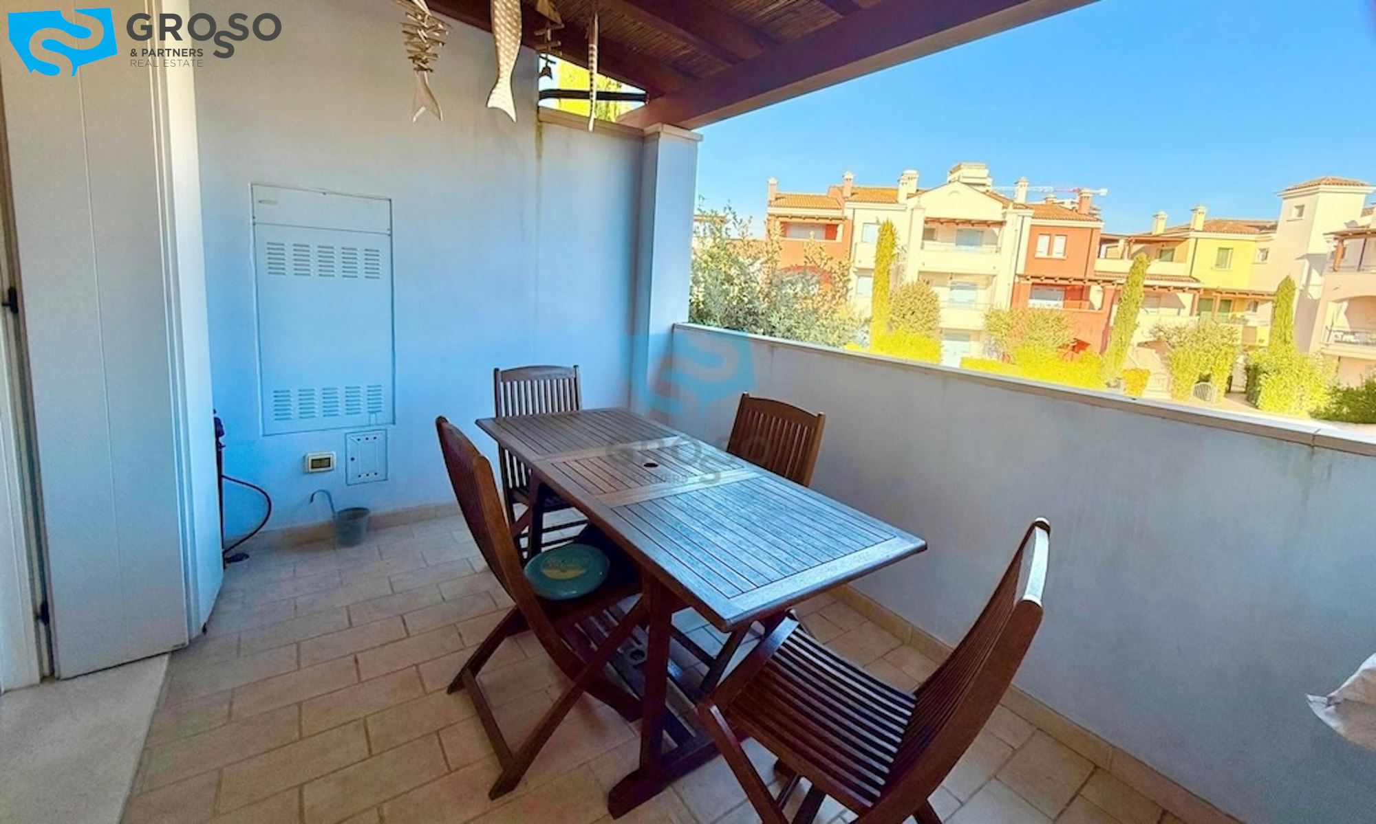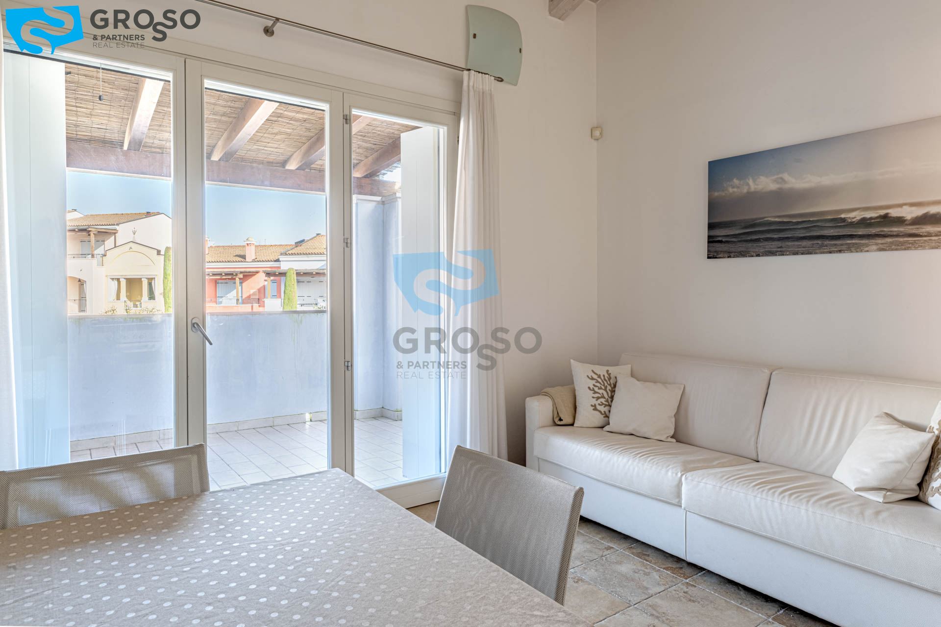L' immobile è composto da un ampio soggiorno con angolo cottura, perfettamente integrato nella zona living e con accesso diretto alla terrazza coperta, spazio ideale per pranzi e cene all'aperto con affaccio sulla splendida piscina condominiale. La zona notte comprende una camera matrimoniale, una cameretta e un bagno finestrato dotato di tutti i comfort.