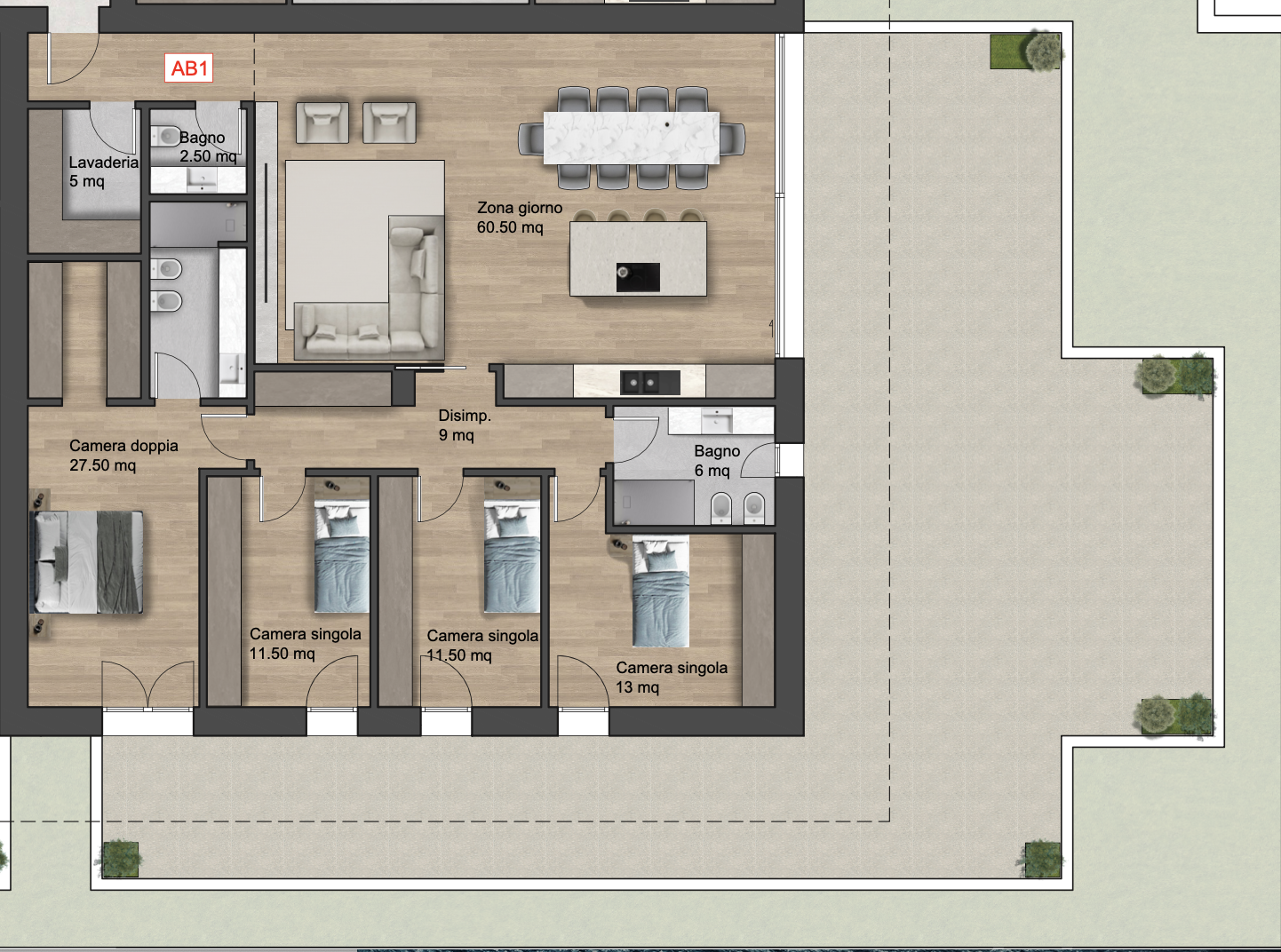 Nel cuore di Treviso, tra Via Monterumici e Viale Montegrappa, nasce MONTEGRAPPA 27, un progetto residenziale che reinventa il modo di vivere in città, unendo design contemporaneo, natura e comfort quotidiano. Gli edifici ospitano le residenze Amaranth e Belle, rispettivamente di 18 e 16 unità, progettate per offrire privacy, luce naturale e spazi funzionali. Linee eleganti, volumi armonici e dettagli raffinati creano ambienti in equilibrio tra estetica e praticità. Protagoniste del progetto sono le ampie terrazze, concepite come estensioni degli ambienti interni grazie alle grandi vetrate. Spazi da vivere ogni giorno, dove il verde diventa parte integrante di uno stile di vita autentico e sostenibile. Gli interni, luminosi e ben distribuiti, offrono un perfetto equilibrio tra estetica e funzionalità. Questo appartamento è composto da un soggiorno con angolo cottura, una camera matrimoniale con bagno privato, tre camere singole, un bagno di servizio, un uletiore bagnetto e una lavanderia. Sia dal soggiorno sia dalle camere si accede direttamente alla terrazza, creando un collegamento fluido tra interno ed esterno e valorizzando la luce naturale in tutti gli ambienti. Sono inoltre presenti un ampio box auto e un posto auto, entrambi inclusi nel prezzo di vendita.