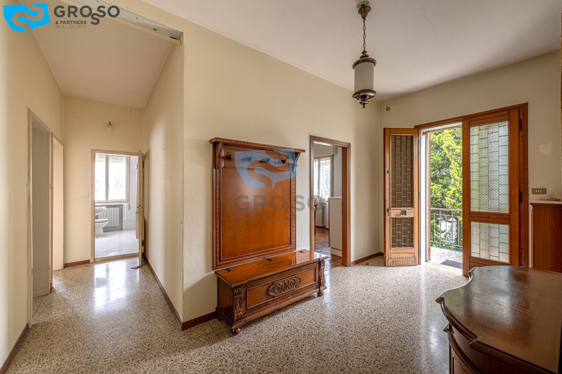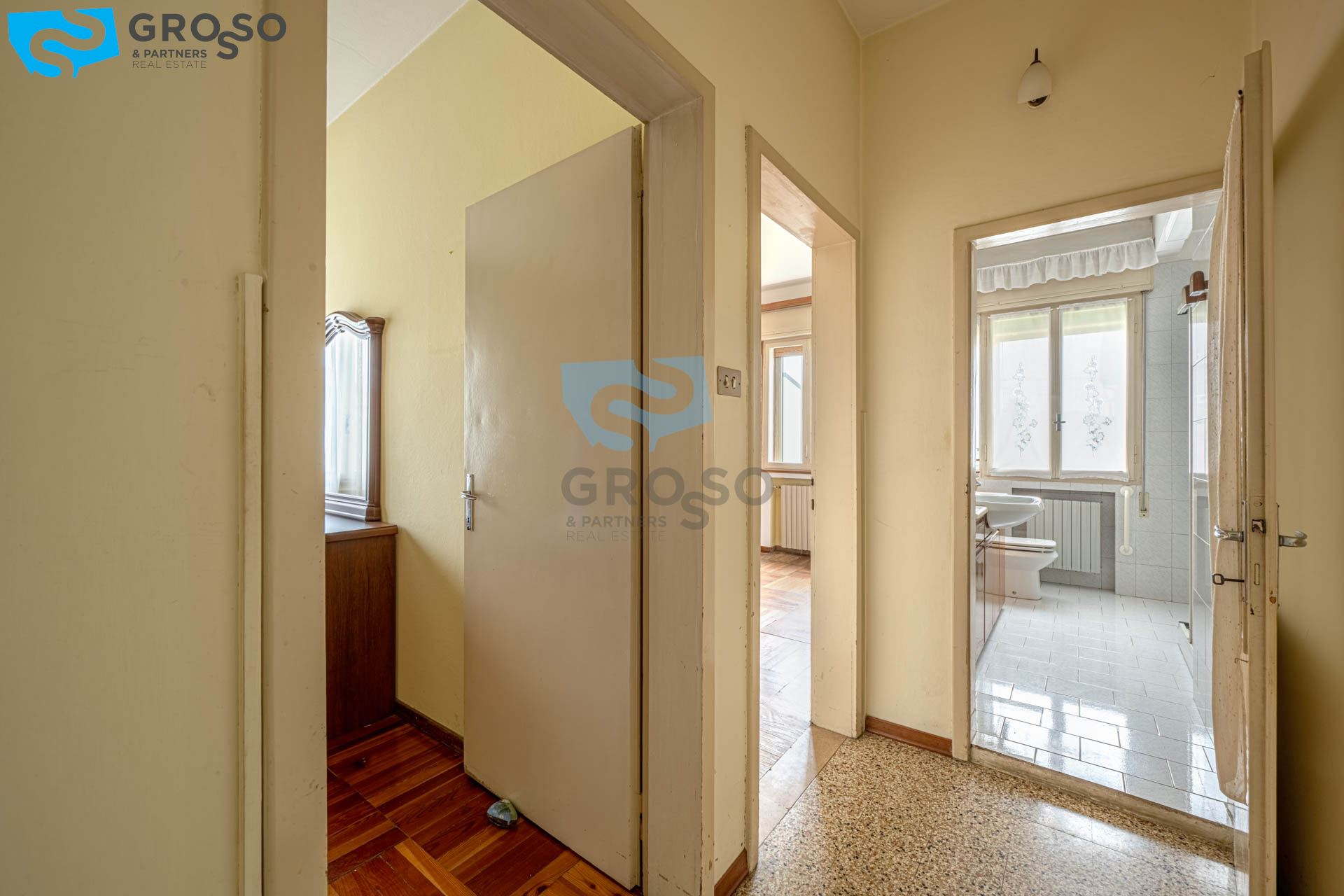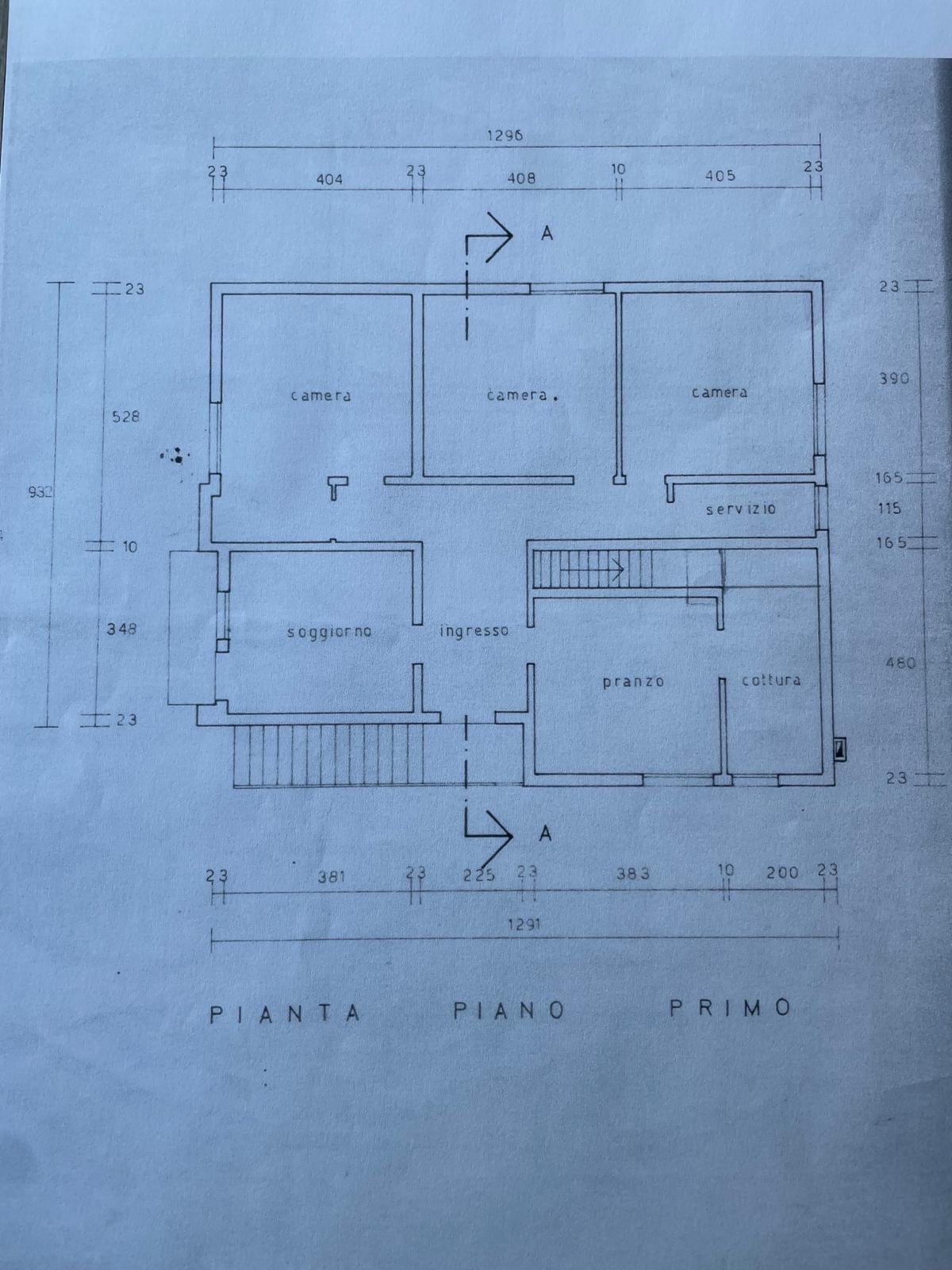 Il primo piano, luminoso e ben distribuito, è composto da ingresso, soggiorno, cucinotto separato, sala da pranzo, tre spaziose camere matrimoniali e un bagno.