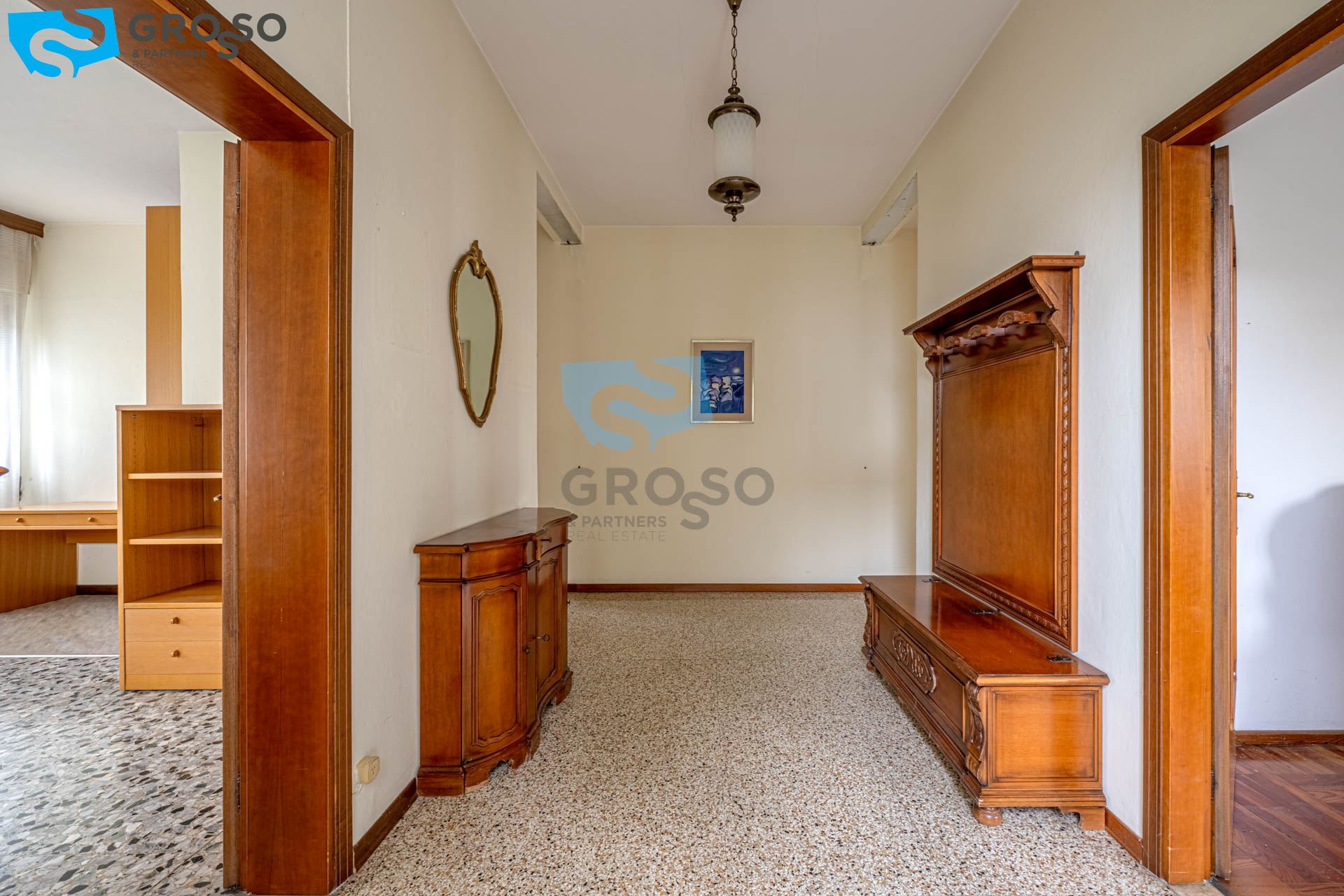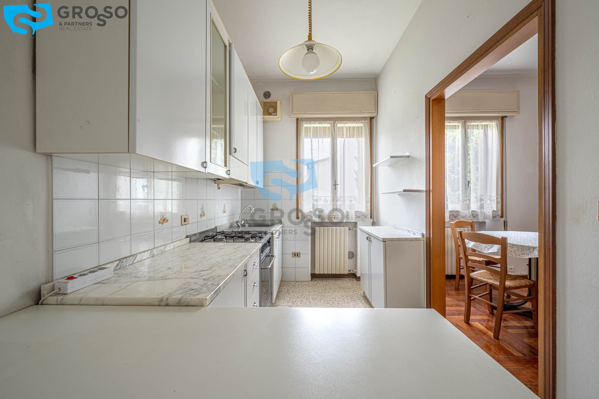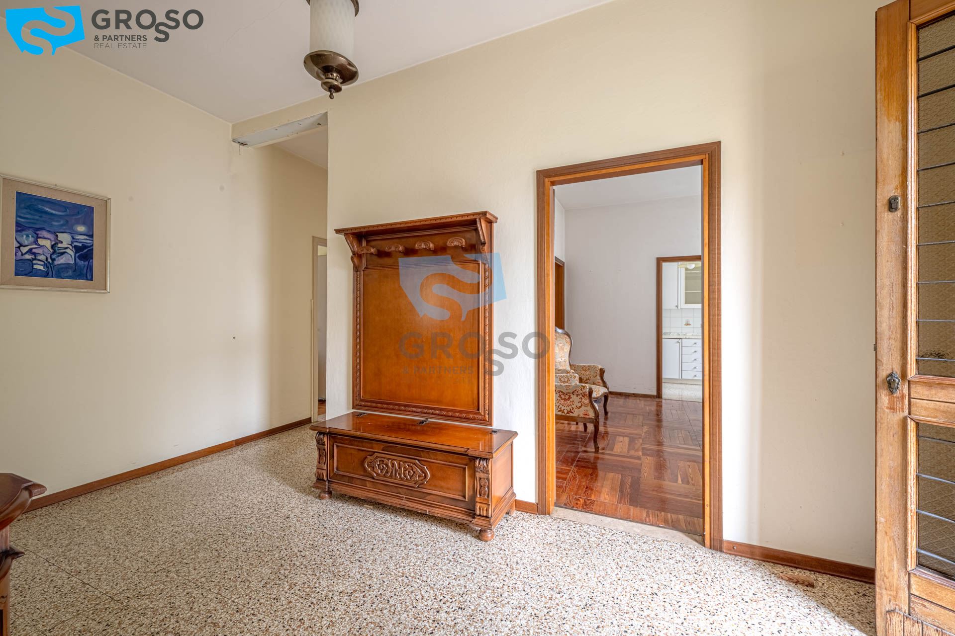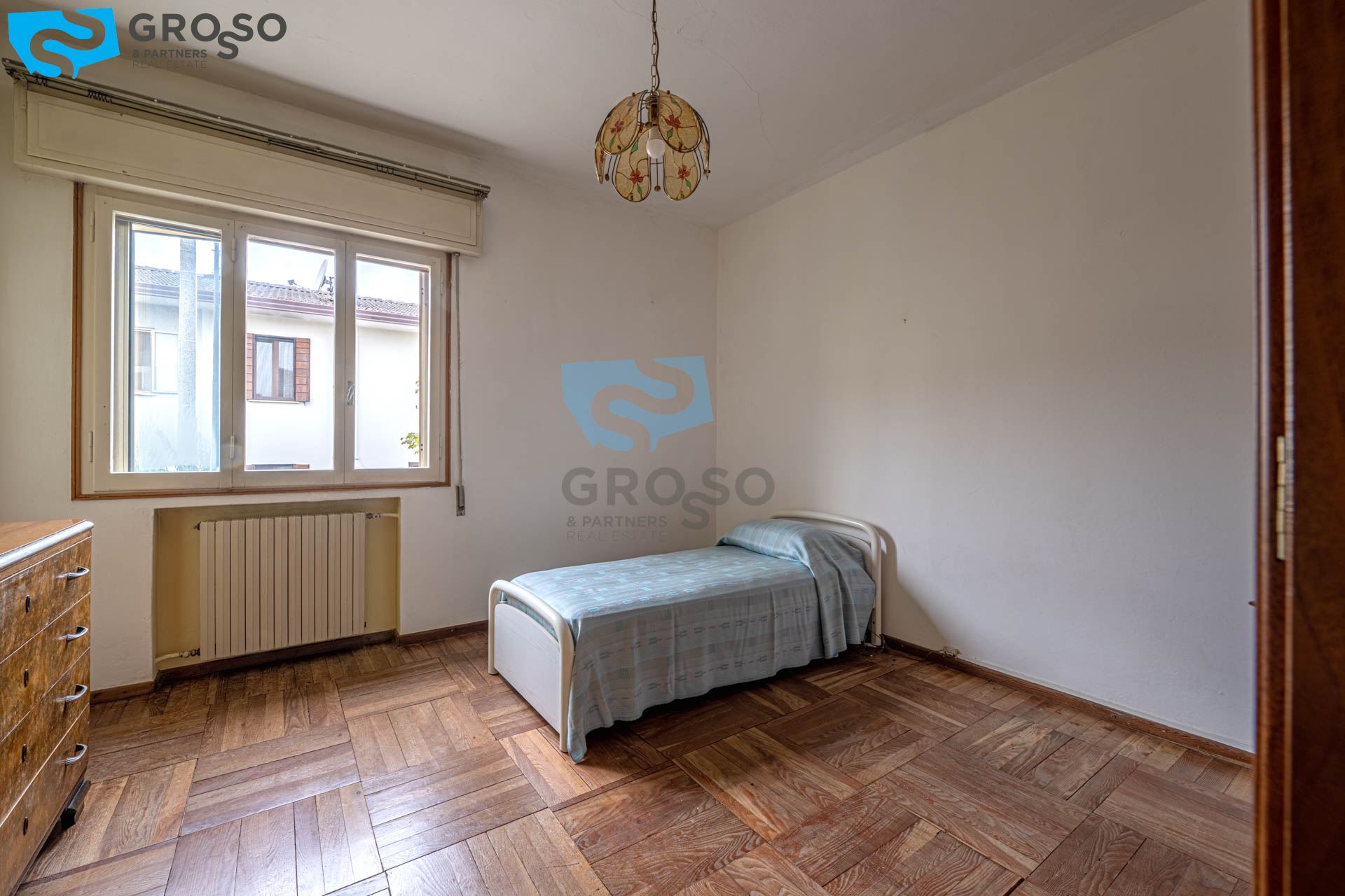 Il primo piano, luminoso e ben distribuito, è composto da ingresso, soggiorno, cucinotto separato, sala da pranzo, tre spaziose camere matrimoniali e un bagno.