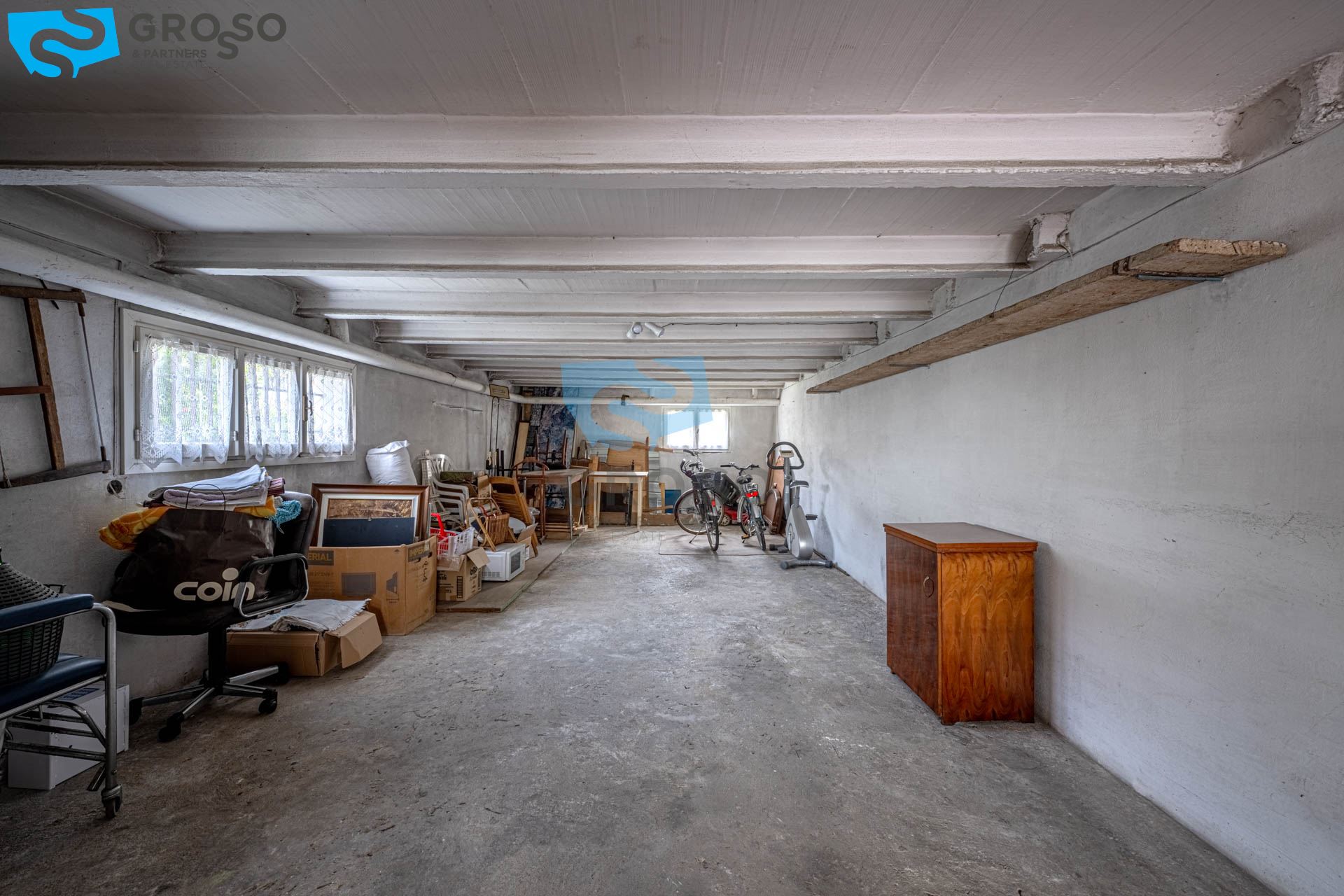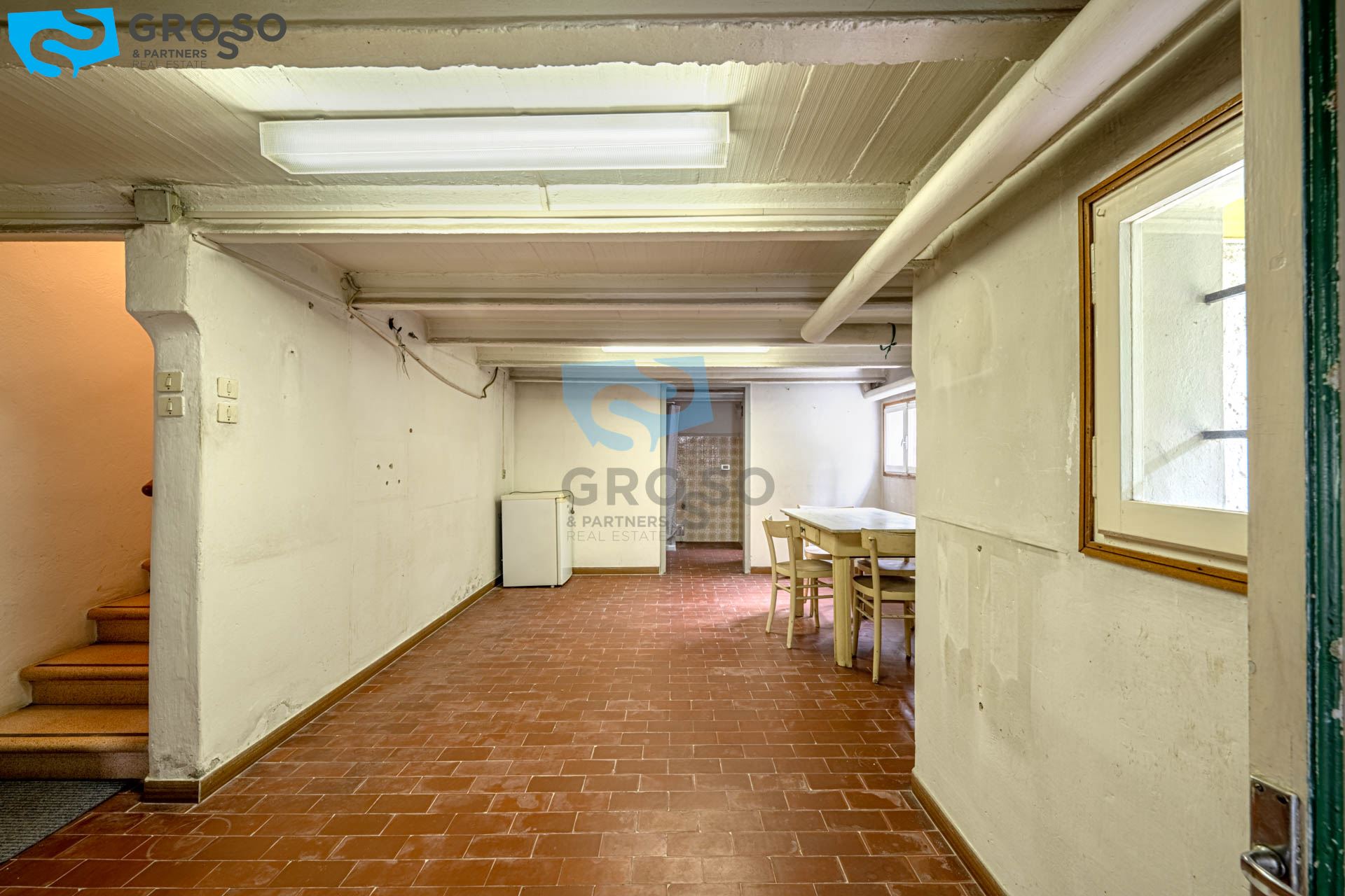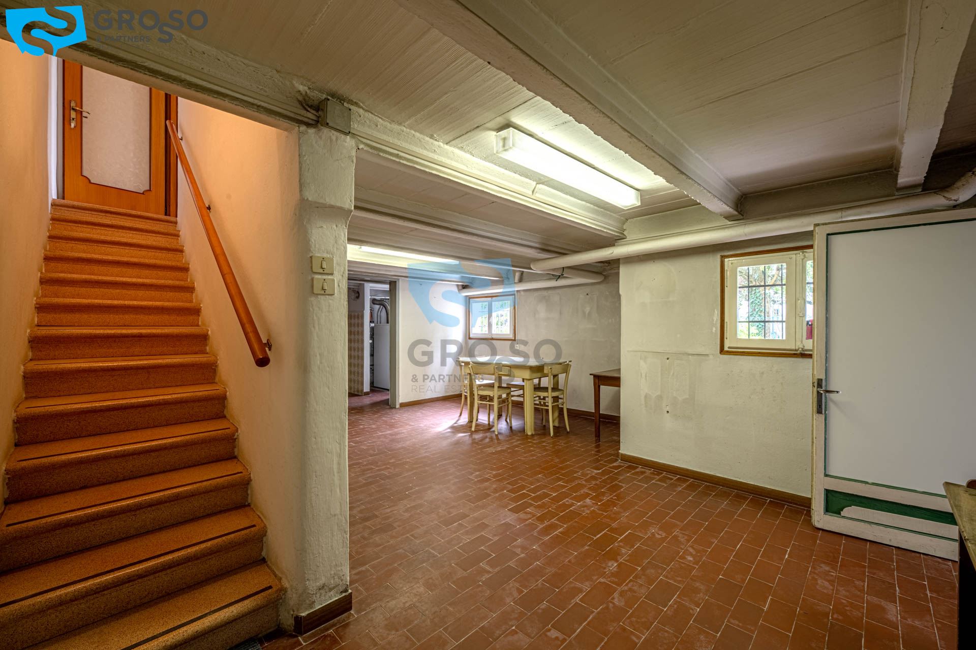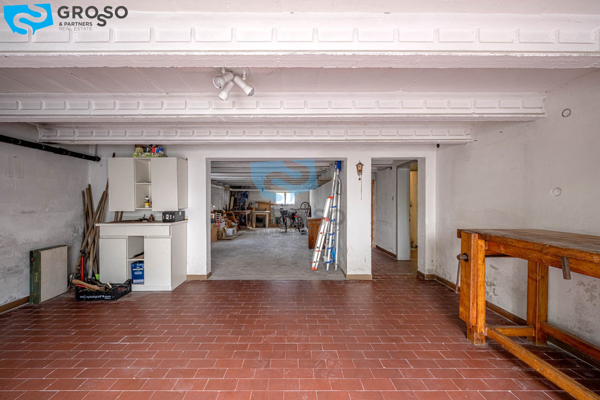 Al piano terra si trovano vari locali di servizio, tra cui magazzini, ripostigli, lavanderia, cantina e un ampio garage.