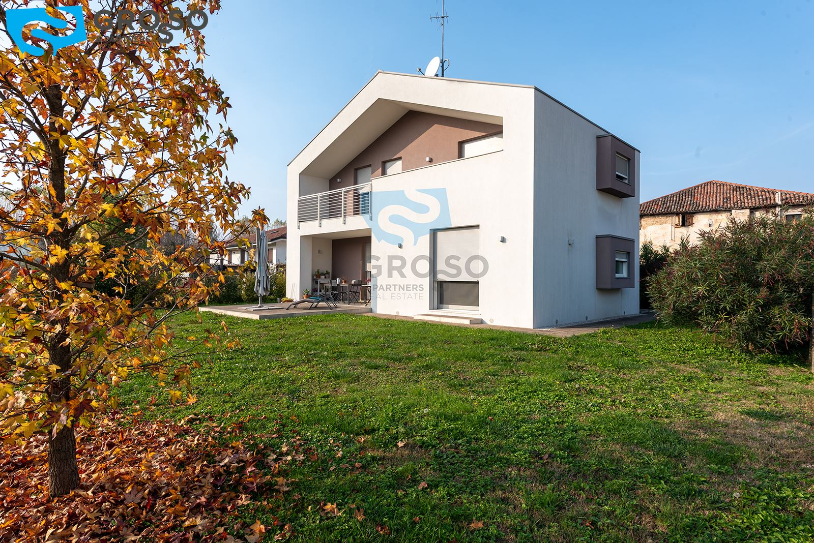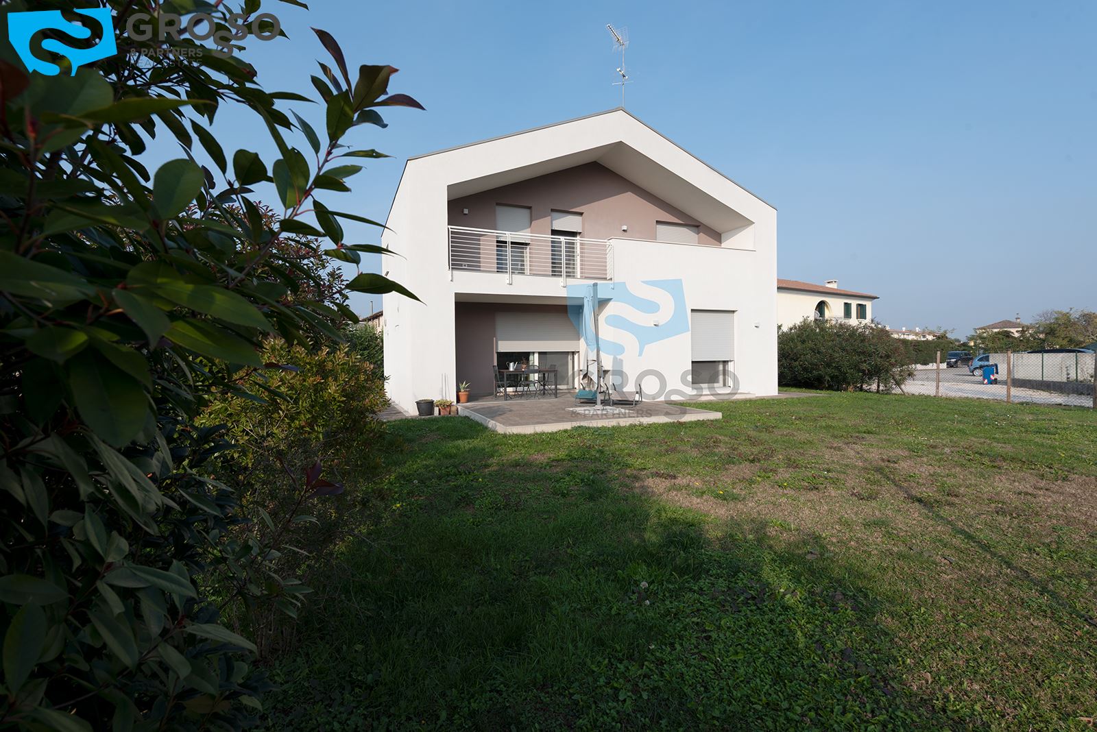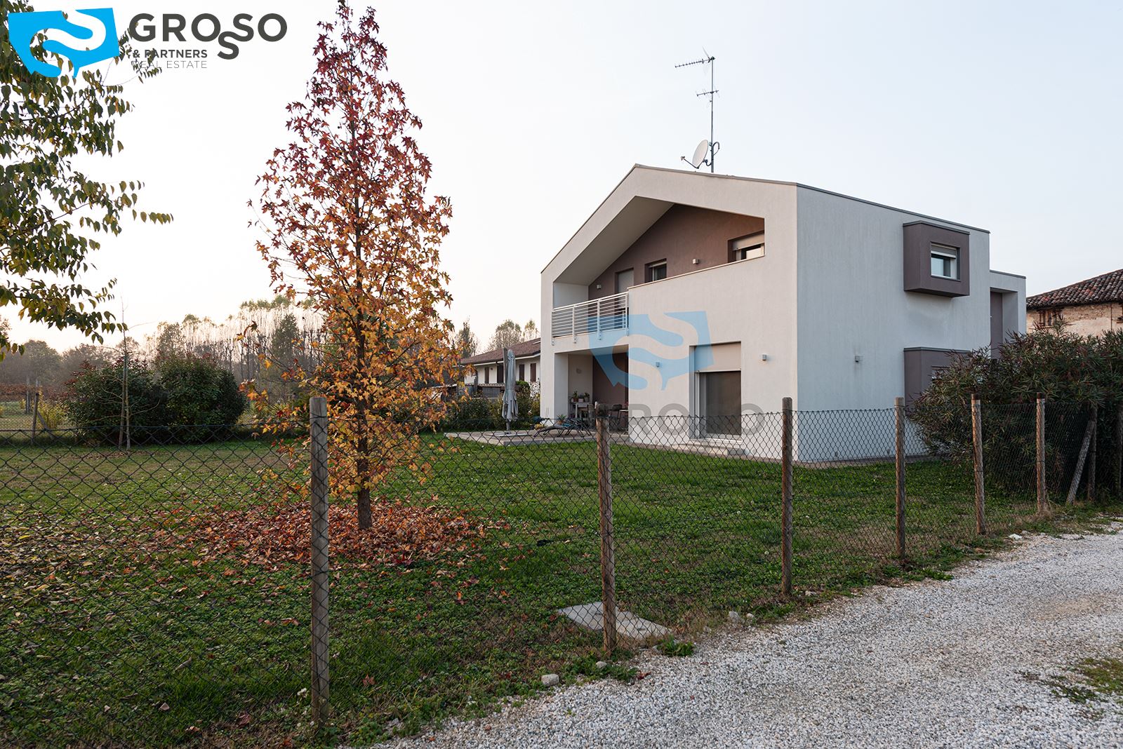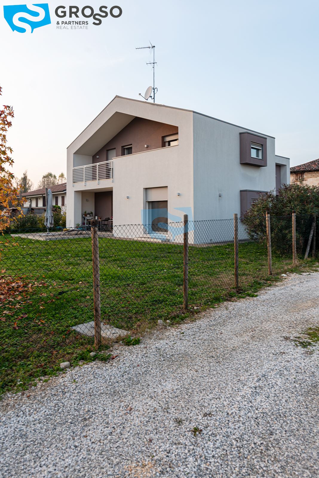 A Ponzano Veneto, in una tranquilla zona residenziale immersa nel verde, proponiamo in vendita una casa indipendente edificata nel 2016, caratterizzata da spazi moderni, ottime finiture e un ampio scoperto privato di 813 mq. L'abitazione si sviluppa su due livelli fuori terra e offre ambienti luminosi e ben distribuiti, ideali per chi desidera comfort, privacy e qualità costruttiva. Al piano terra l'ingresso conduce a un accogliente soggiorno con zona pranzo, collegato alla cucina abitabile separata dalla quale si accede al portico esterno, perfetto per pranzi e cene all'aperto durante la bella stagione. Sullo stesso livello si trovano un bagno per gli ospiti con doccia, la centrale termica e il garage comunicante, oltre a due posti auto esterni che completano la praticità degli spazi. La zona notte, situata al piano primo, comprende una camera matrimoniale e tre camere singole, tutte servite da una loggia che si sviluppa lungo l'intero perimetro, regalando continuità tra ambienti interni ed esterni e piacevoli affacci sul giardino. Il piano è completato da un bagno con doccia e da un comodo magazzino utilizzabile anche come stanza armadio. L'immobile è dotato di riscaldamento autonomo a pavimento, aria condizionata e impianto fotovoltaico da 2,9 kW, garanzie di efficienza energetica e contenimento dei consumi. Una soluzione recente, indipendente e subito abitabile, ideale per chi cerca una casa moderna circondata da un ampio spazio esterno in un contesto residenziale riservato e ben servito.