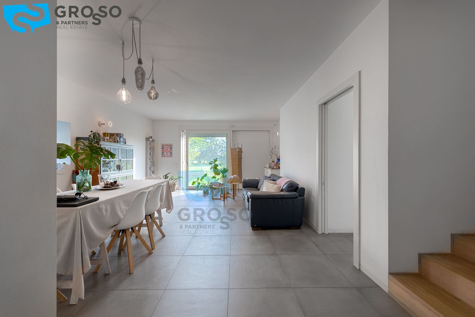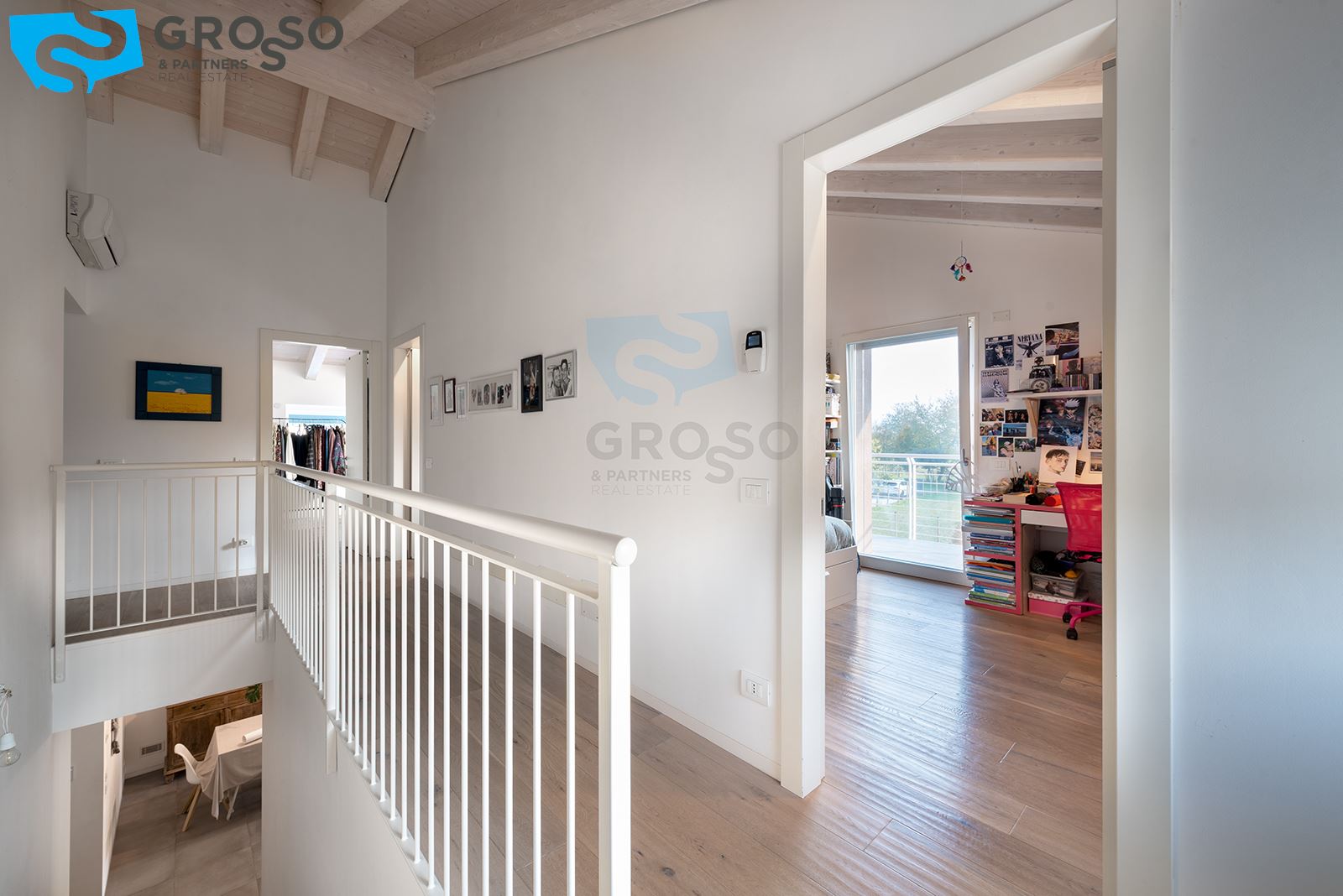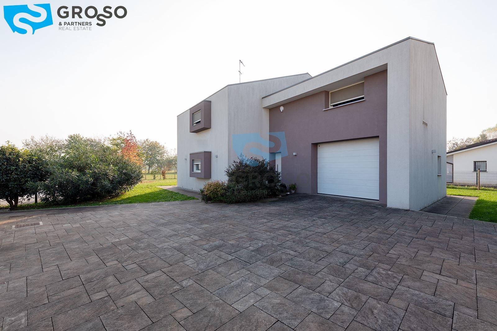 A Ponzano Veneto, in una tranquilla zona residenziale immersa nel verde, proponiamo in vendita una casa indipendente edificata nel 2016, caratterizzata da spazi moderni, ottime finiture e un ampio scoperto privato di 813 mq. L'abitazione si sviluppa su due livelli fuori terra e offre ambienti luminosi e ben distribuiti, ideali per chi desidera comfort, privacy e qualità costruttiva. Al piano terra l'ingresso conduce a un accogliente soggiorno con zona pranzo, collegato alla cucina abitabile separata dalla quale si accede al portico esterno, perfetto per pranzi e cene all'aperto durante la bella stagione. Sullo stesso livello si trovano un bagno per gli ospiti con doccia, la centrale termica e il garage comunicante, oltre a due posti auto esterni che completano la praticità degli spazi. La zona notte, situata al piano primo, comprende una camera matrimoniale e tre camere singole, tutte servite da una loggia che si sviluppa lungo l'intero perimetro, regalando continuità tra ambienti interni ed esterni e piacevoli affacci sul giardino. Il piano è completato da un bagno con doccia e da un comodo magazzino utilizzabile anche come stanza armadio. L'immobile è dotato di riscaldamento autonomo a pavimento, aria condizionata e impianto fotovoltaico da 2,9 kW, garanzie di efficienza energetica e contenimento dei consumi. Una soluzione recente, indipendente e subito abitabile, ideale per chi cerca una casa moderna circondata da un ampio spazio esterno in un contesto residenziale riservato e ben servito.