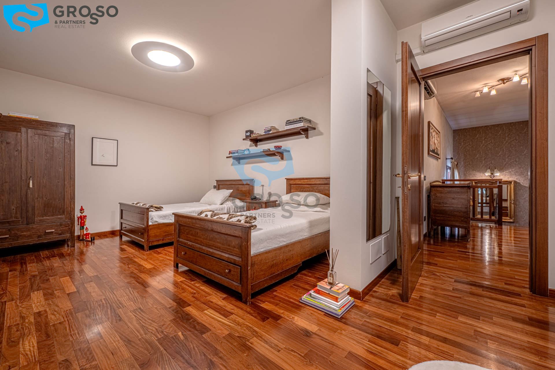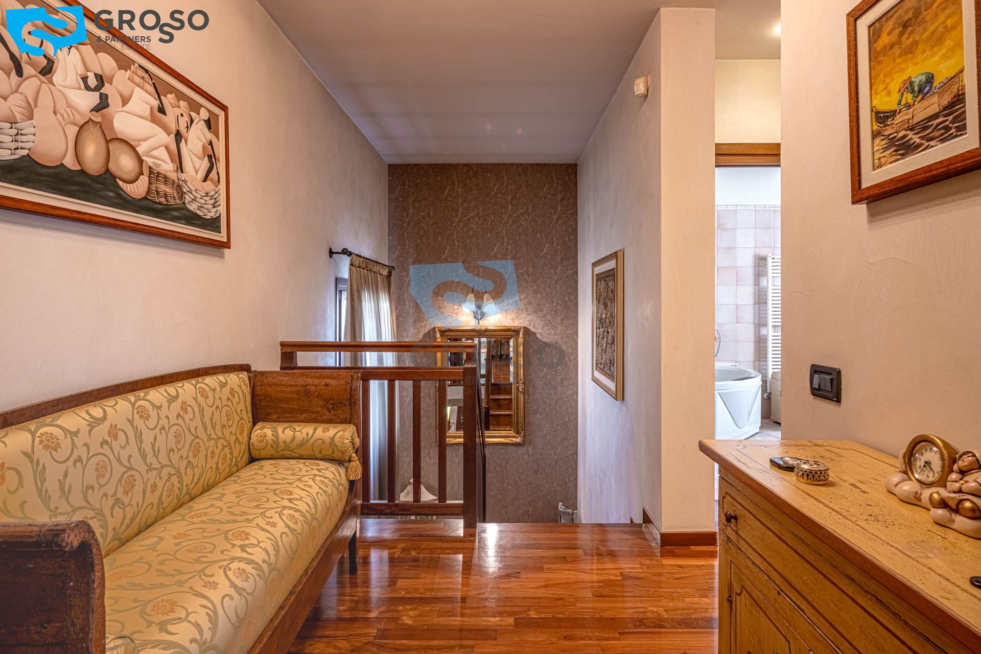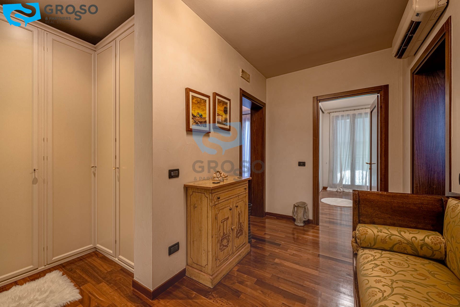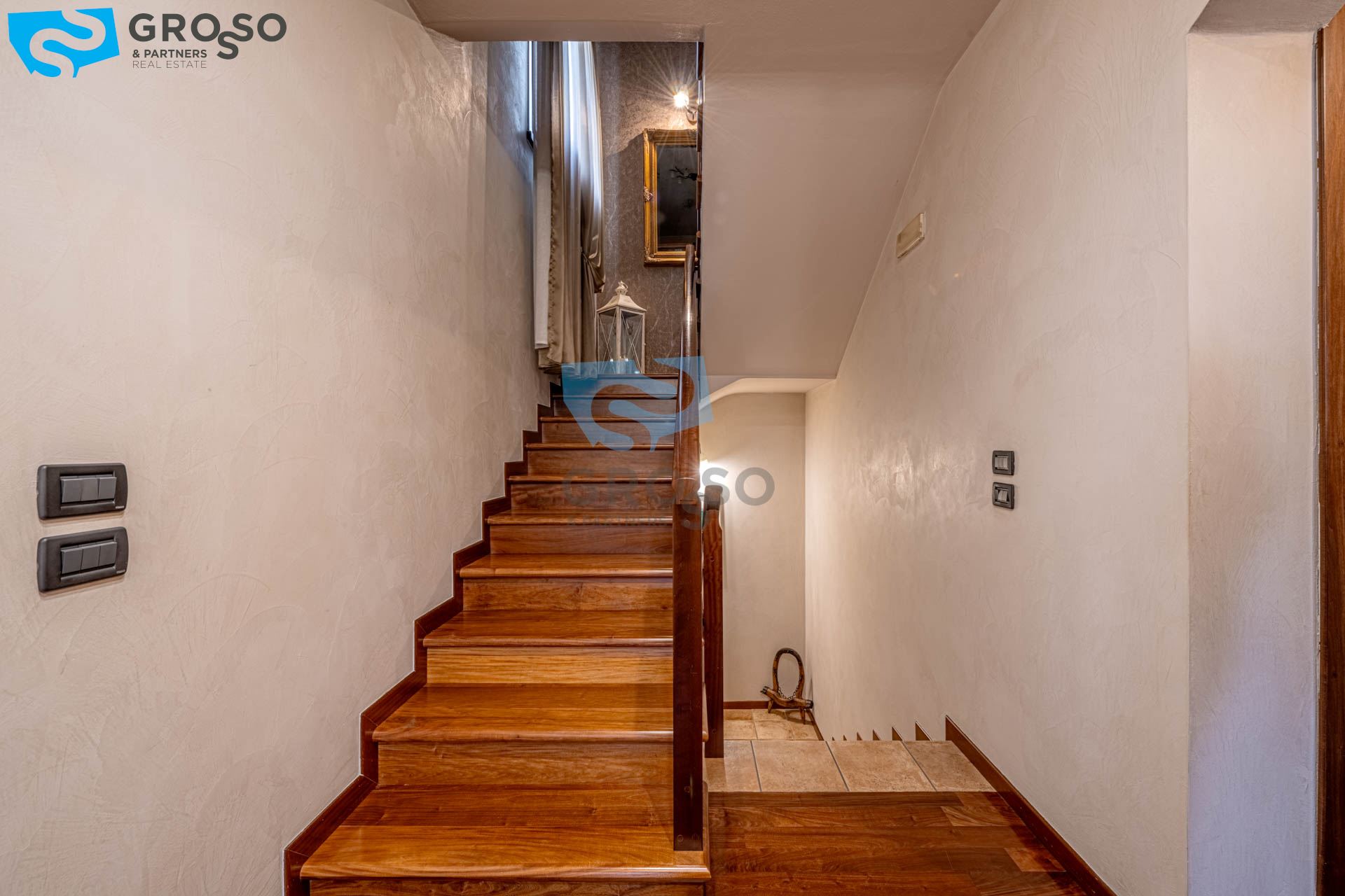 Salendo al piano primo si sviluppa la zona notte, composta da tre camere da letto di cui due matrimoniali e una doppia, ideali per famiglie. A servizio del reparto notte è presente un bagno finestrato, oltre a due pratici guardaroba che aggiungono ulteriore comodità e organizzazione degli spazi.