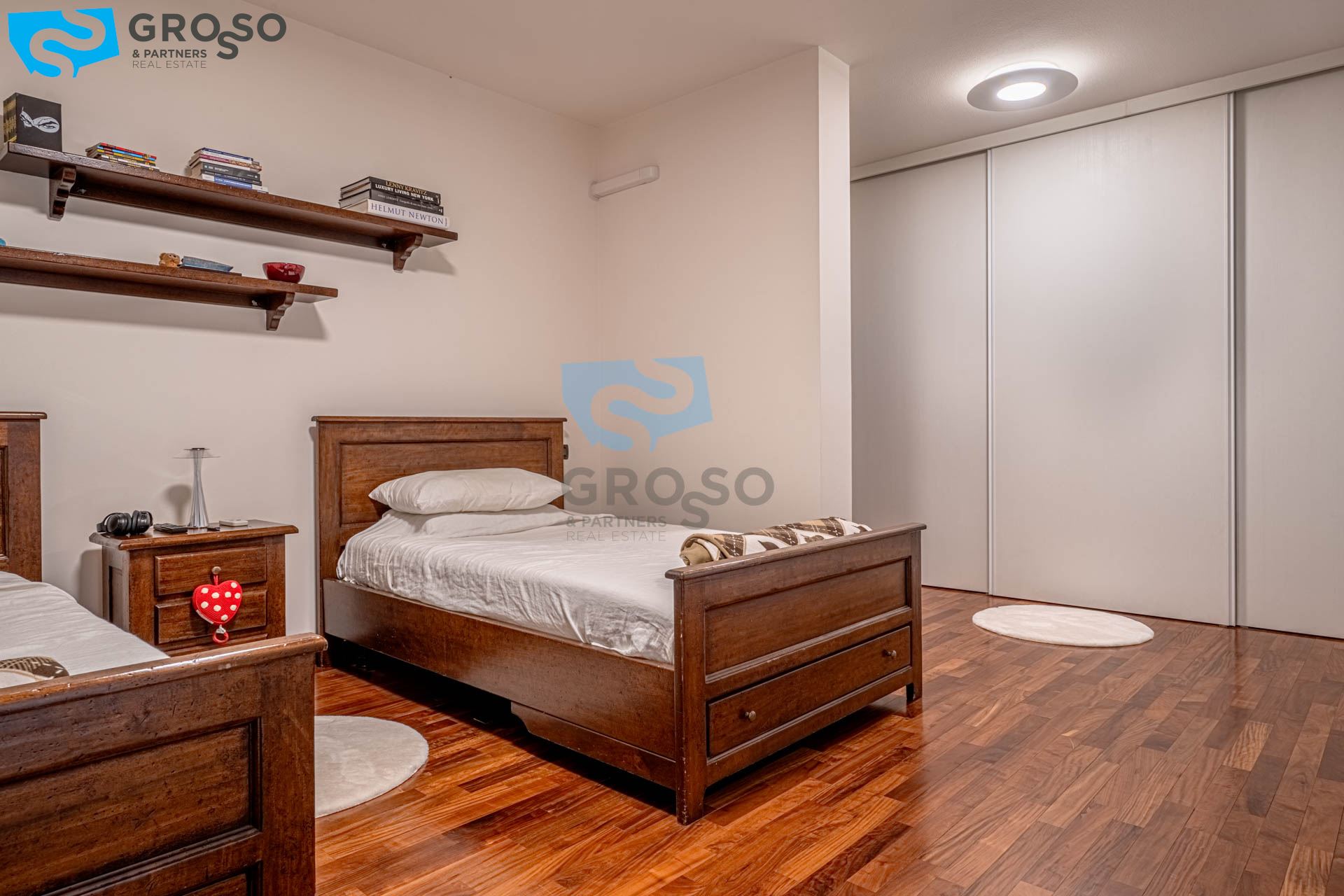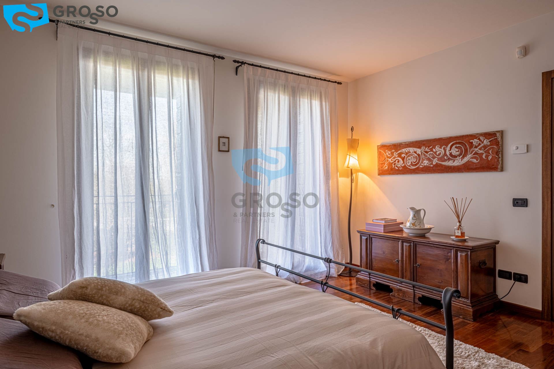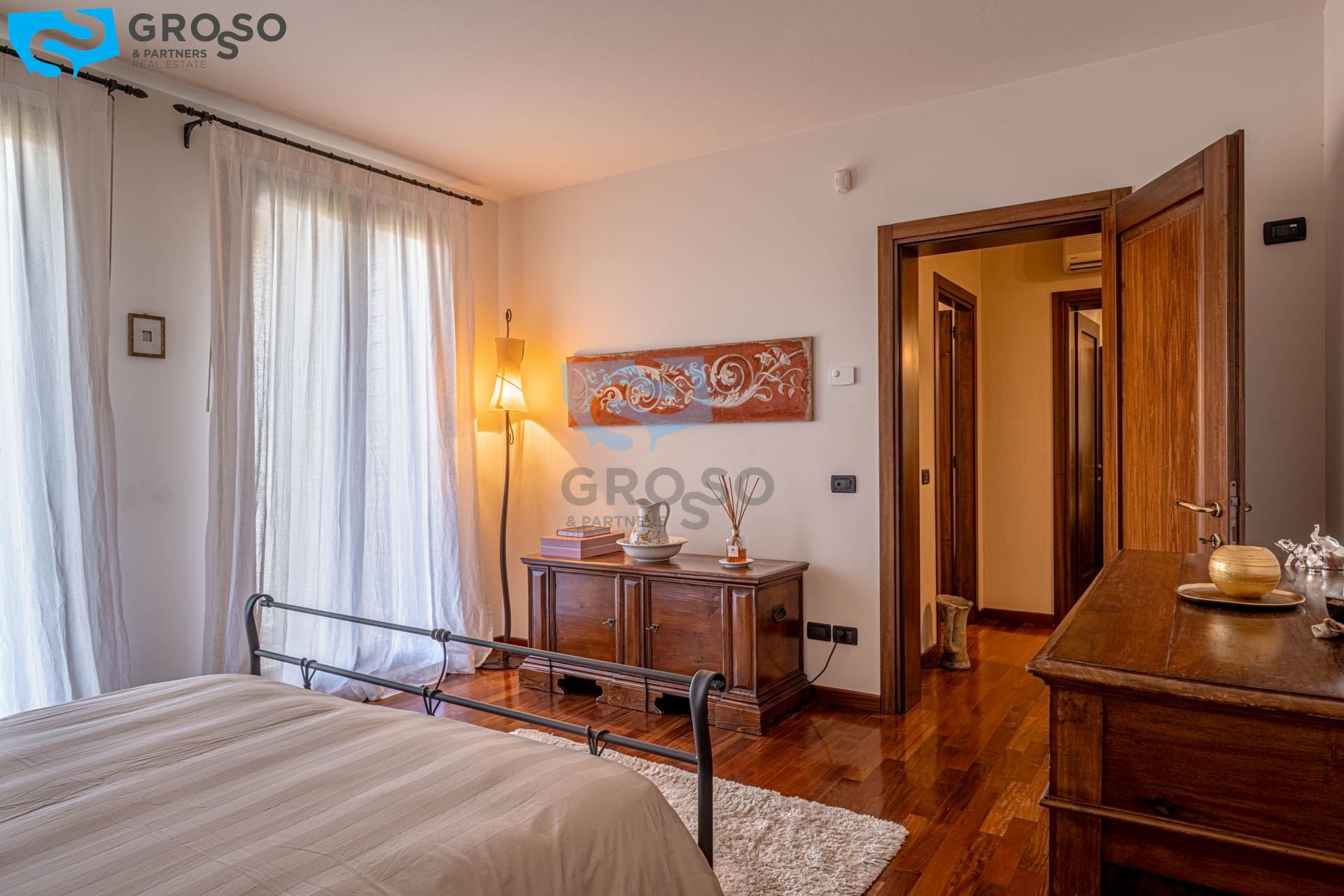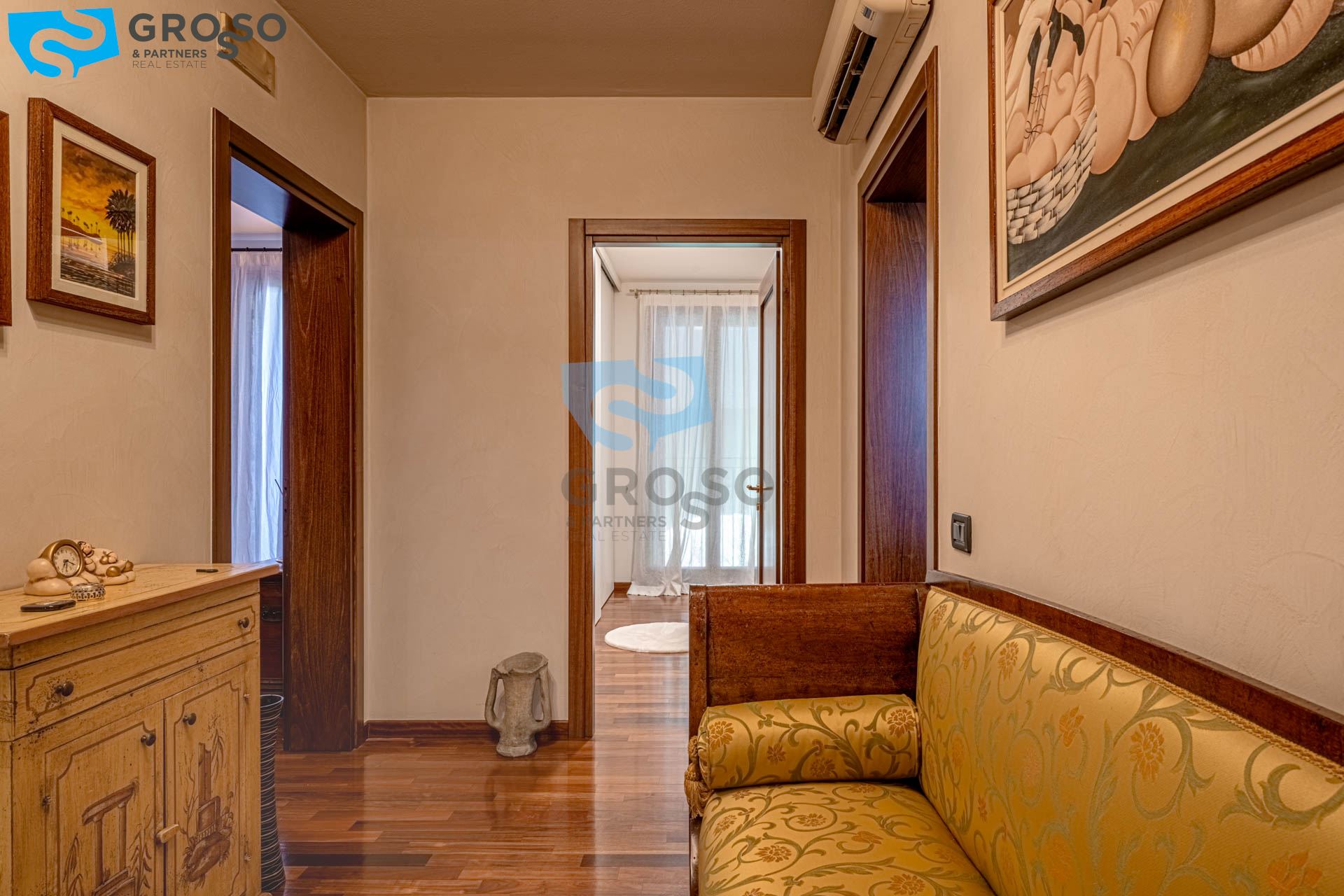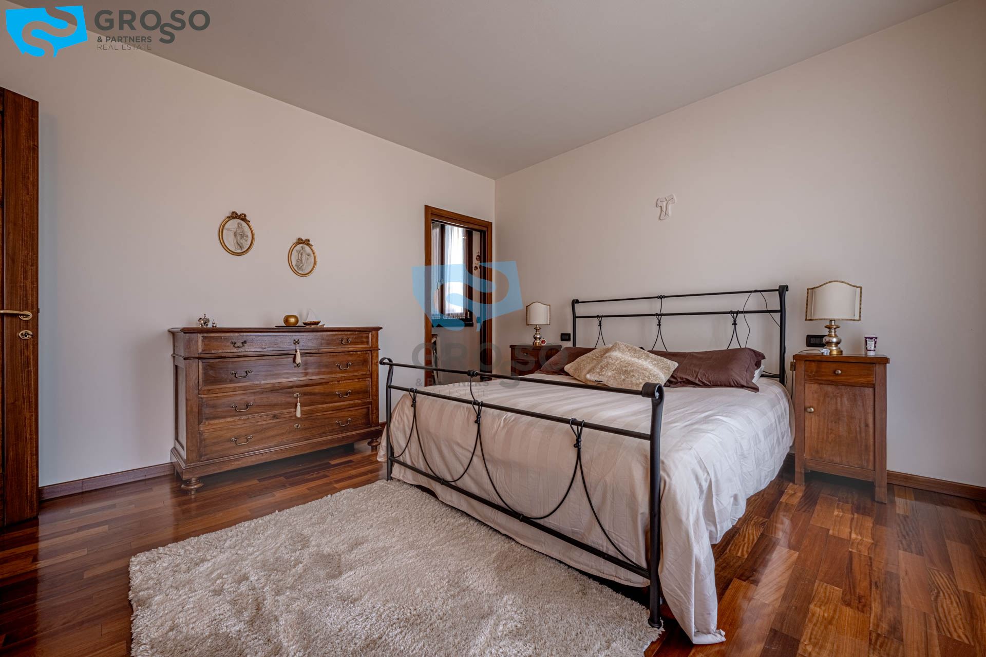 Salendo al piano primo si sviluppa la zona notte, composta da tre camere da letto di cui due matrimoniali e una doppia, ideali per famiglie. A servizio del reparto notte è presente un bagno finestrato, oltre a due pratici guardaroba che aggiungono ulteriore comodità e organizzazione degli spazi.
