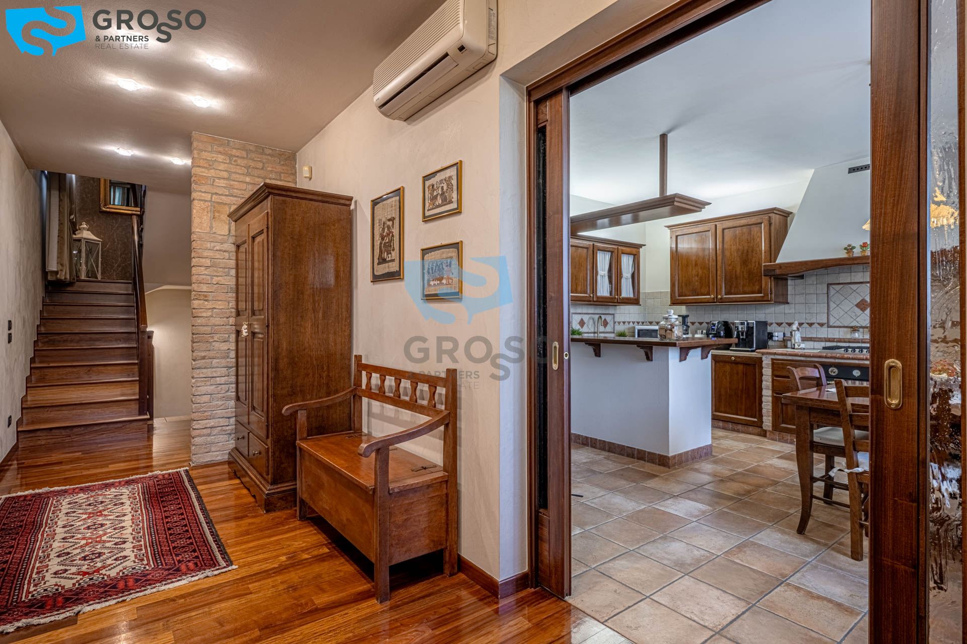 L'ingresso al piano terra si apre su un luminoso soggiorno, ambiente accogliente e ben distribuito, affiancato da una cucina separata che garantisce funzionalità e riservatezza. Sempre al piano troviamo un bagno per gli ospiti, una comoda lavanderia e un ampio garage doppio di circa 50 mq, perfetto per ospitare due auto e offrire ulteriore spazio di deposito.