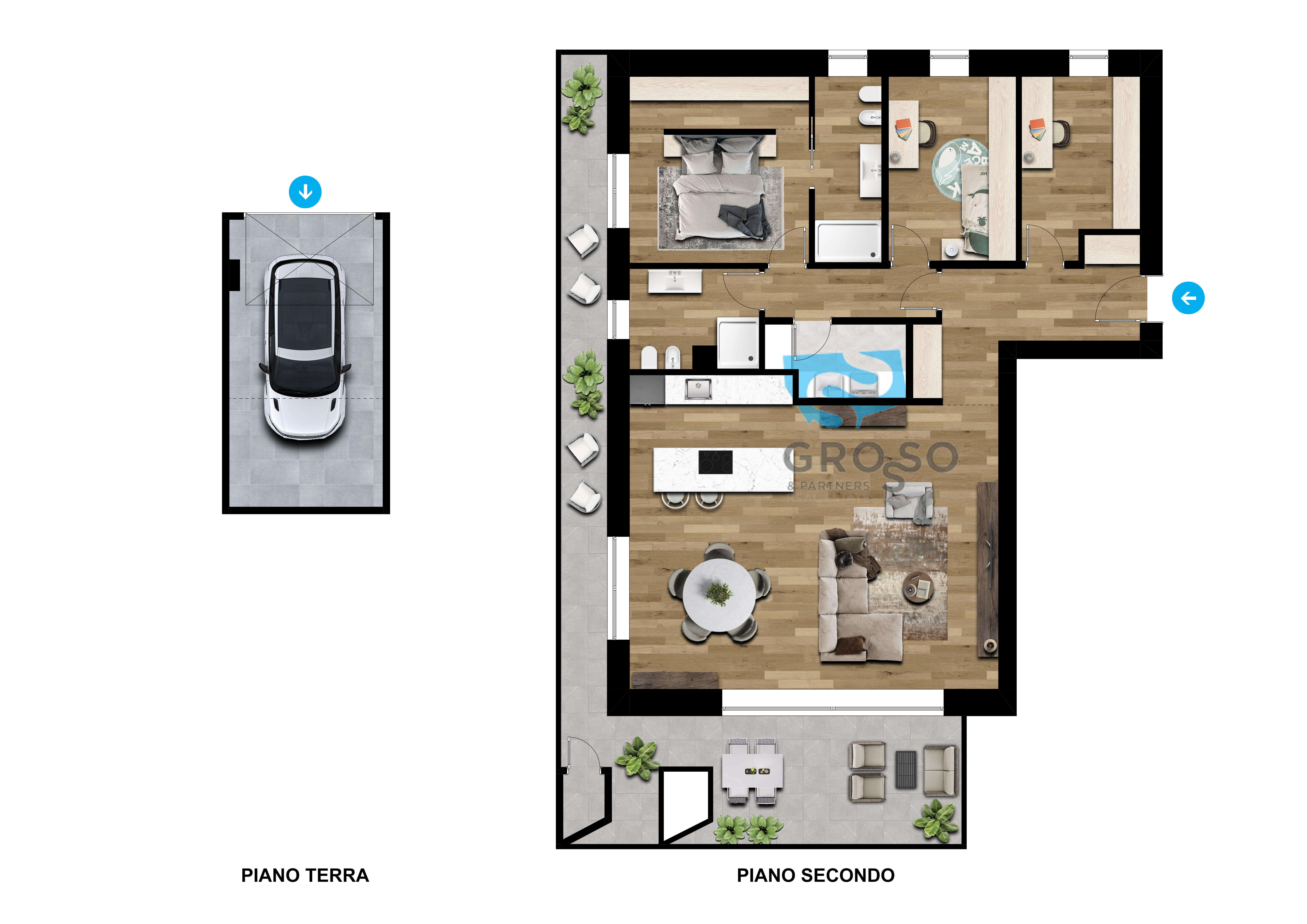 La grande terrazza di 48 mq si affaccia sul verde rigoglioso del fiume e della Restera, regalando ogni giorno un quadro diverso, tra riflessi d'acqua e silenzi rigeneranti. La zona notte si compone di una suite matrimoniale, una camera doppia, una singola, due bagni e una comoda lavanderia. Ogni spazio è stato studiato per offrire bellezza e funzionalità, senza compromessi.