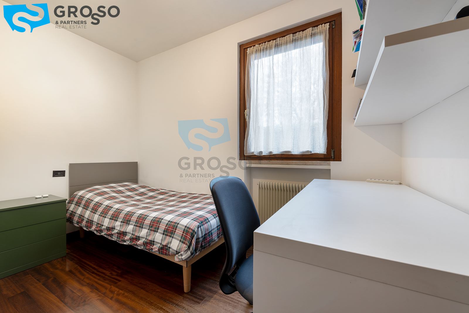 L'immobile si trova al piano terra e gode di un ampio giardino privato disposto su tre lati, ideale per momenti di relax all'aperto. L'abitazione è composta da luminoso soggiorno-pranzo, cucina separata, tre camere da letto, comodo ripostiglio e due bagni.
