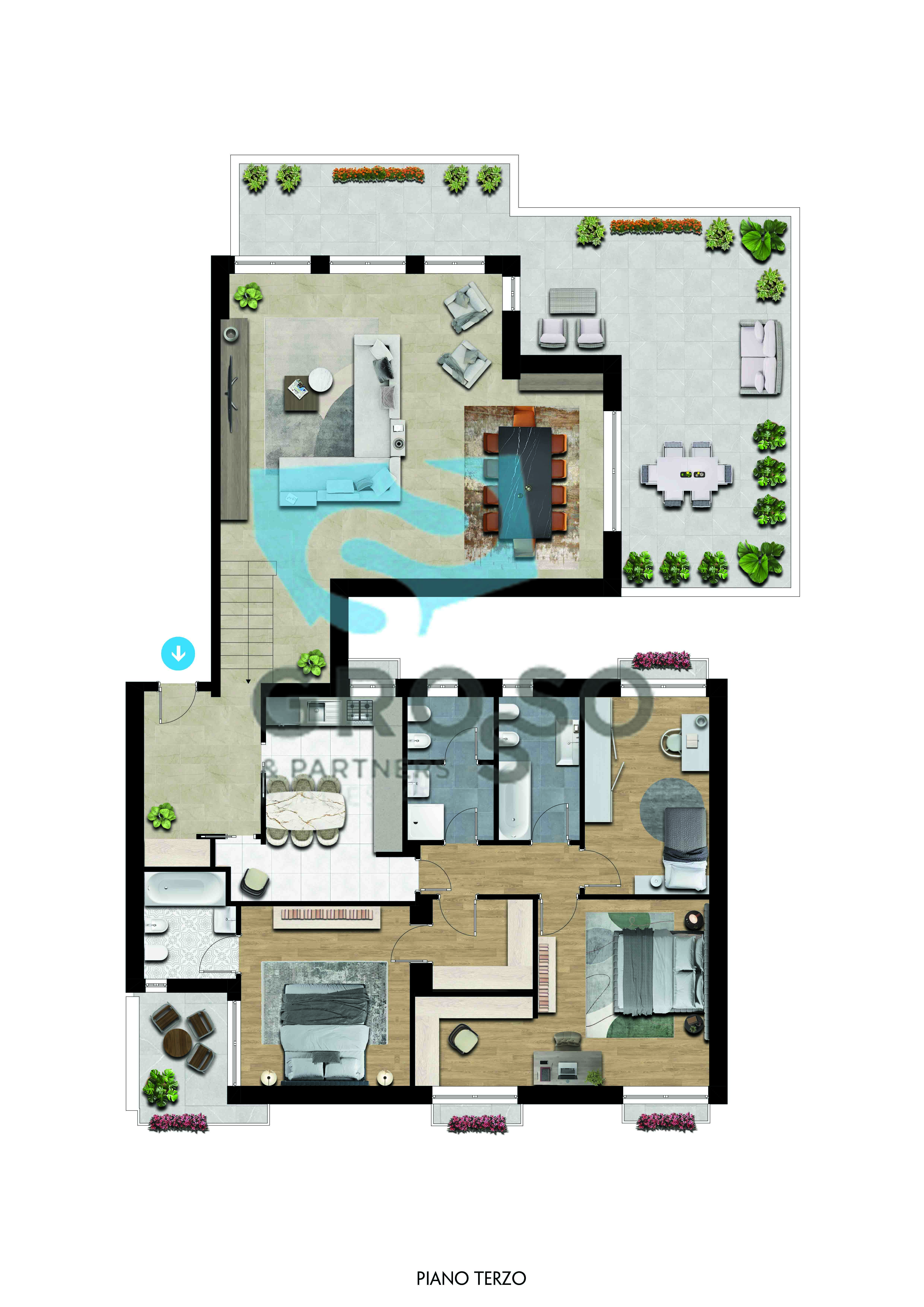 Dall'ingresso una scala interna accompagna al livello inferiore dove si apre un ampio soggiorno caratterizzato da grandi superfici finestrate che garantiscono una splendida luminosità durante tutto l'arco della giornata. Da questo ambiente si accede direttamente a una terrazza di ampia metratura, perfetta per momenti di relax all'aperto, pranzi e cene conviviali o semplicemente per godere di uno spazio esterno riservato nel pieno centro cittadino.