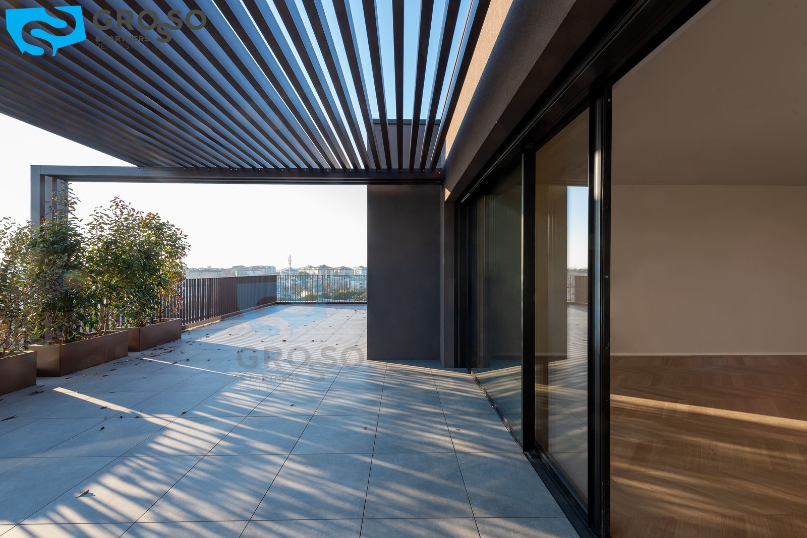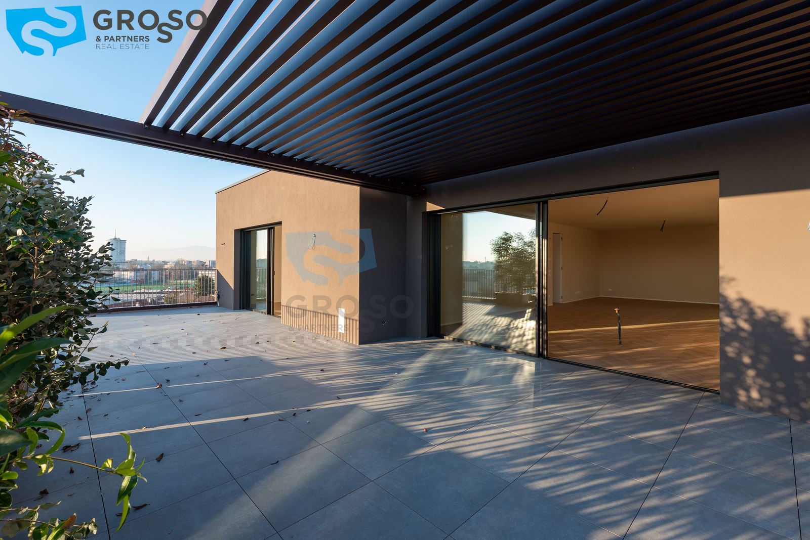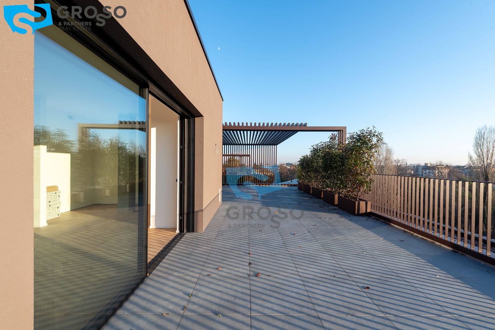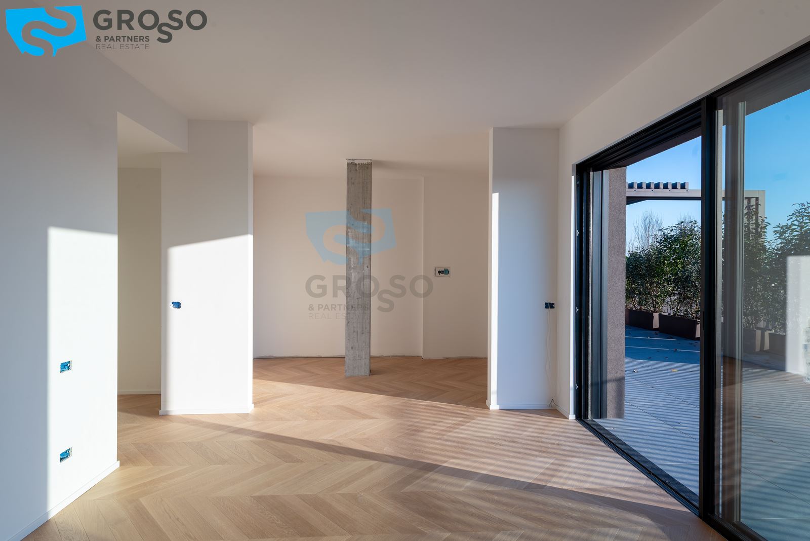 L'attico si compone di un ampio salotto con angolo cottura, tre camere, di cui due matrimoniali e una singola, e tre bagni. Completa l'immobile un'ampia terrazza abitabile, un garage doppio.