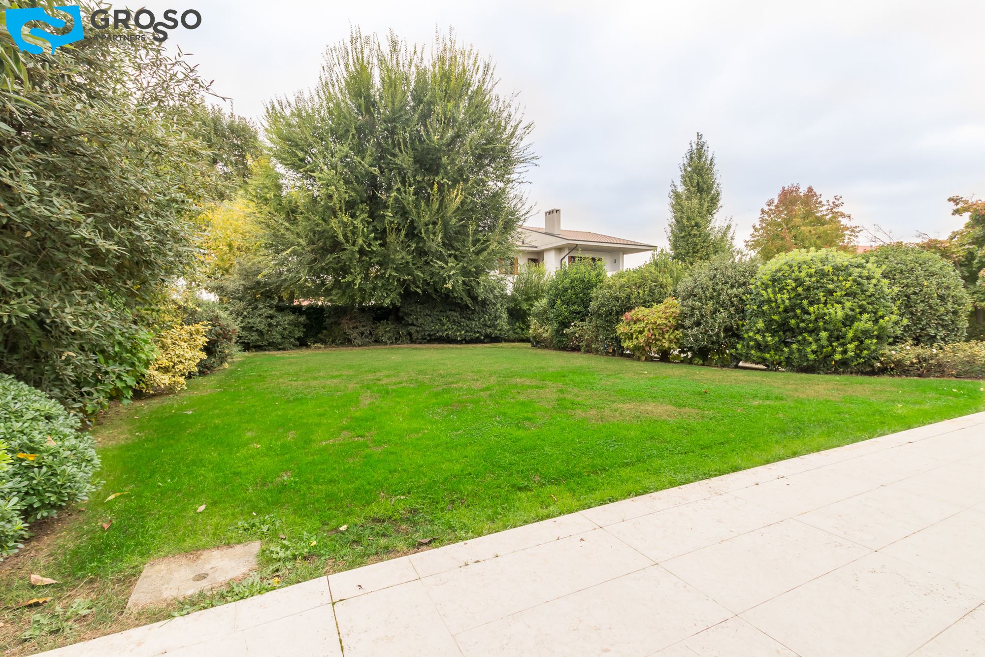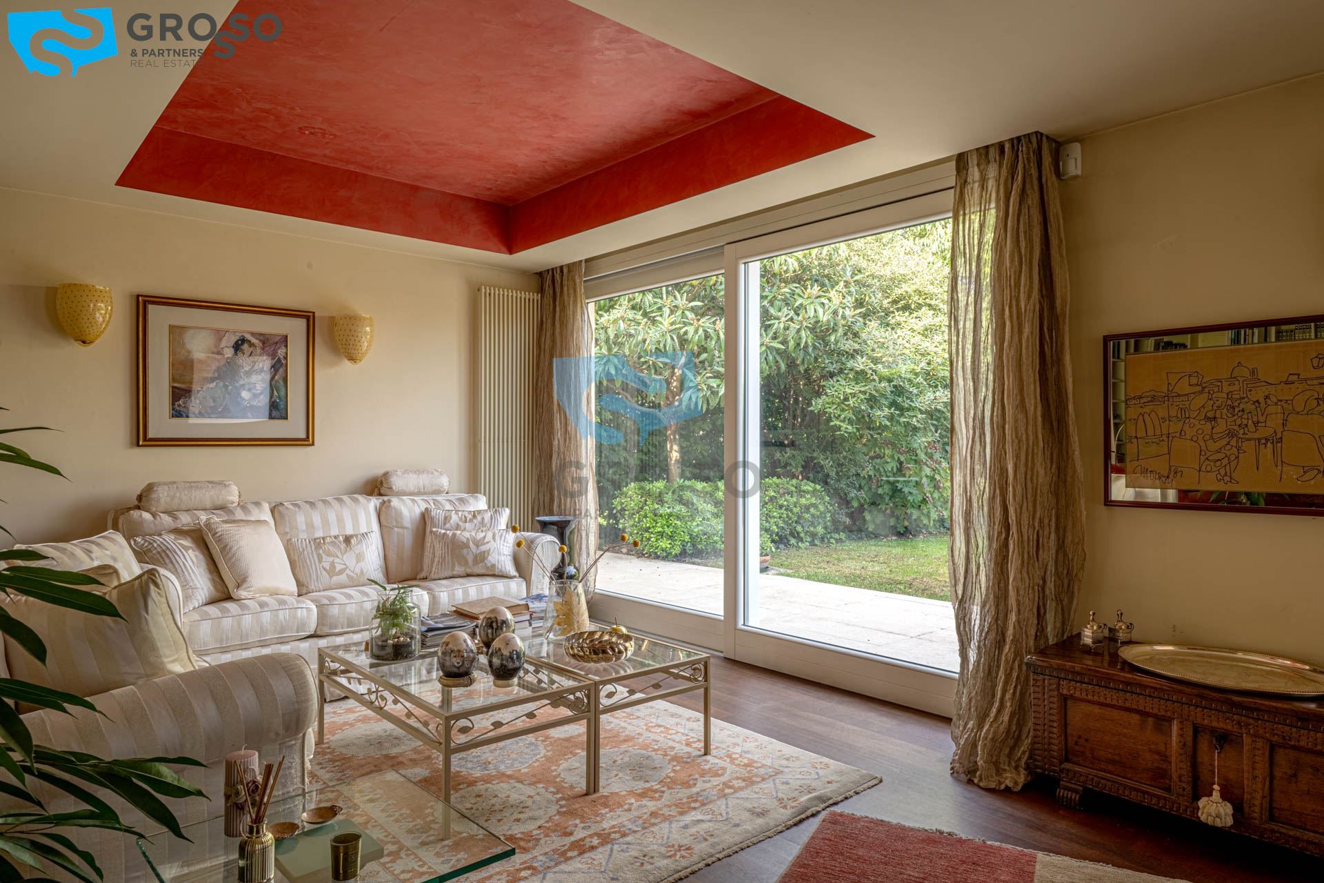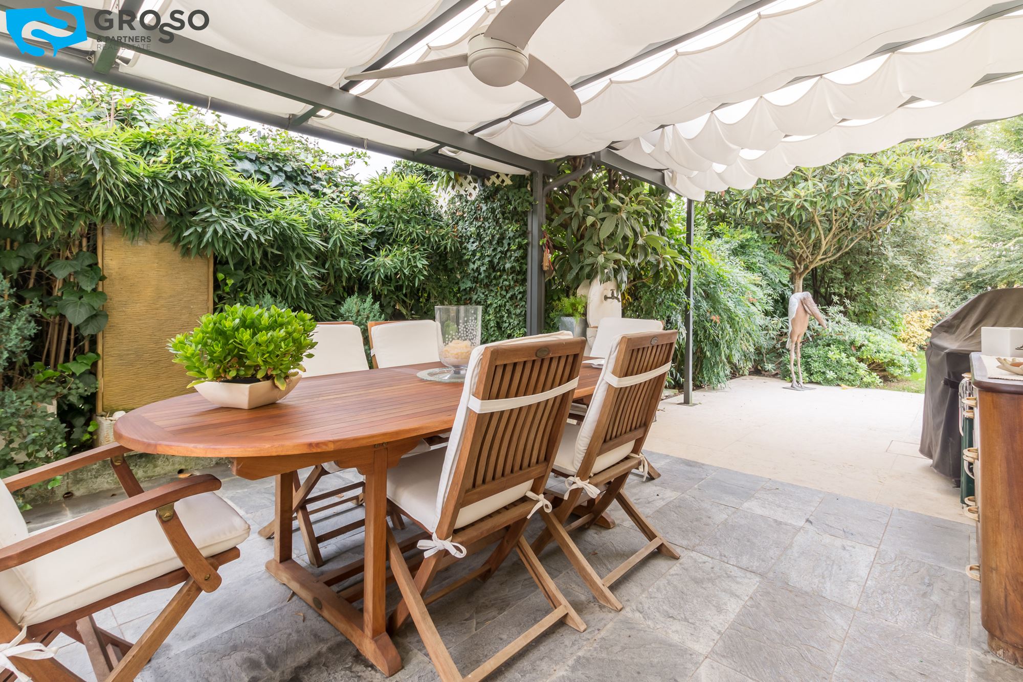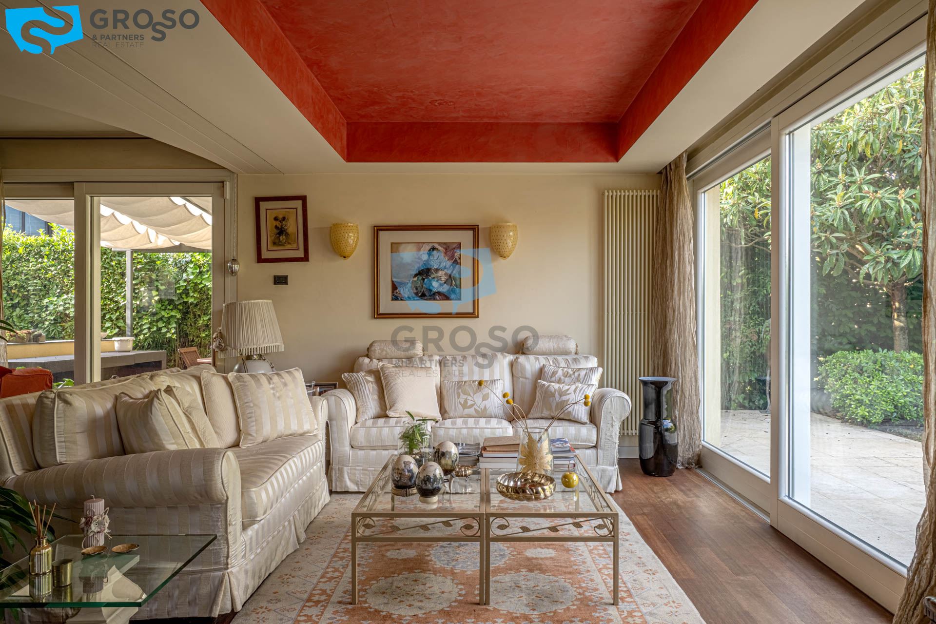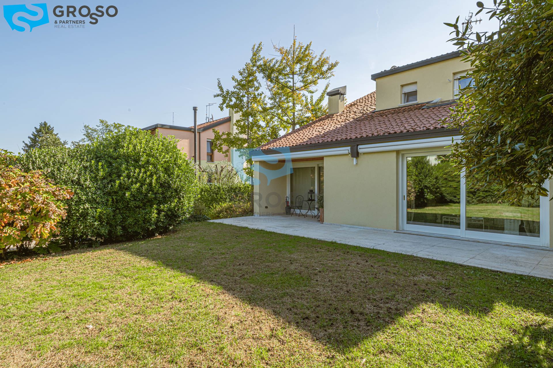 Strepitoso giardino piantumato, dal salotto si accede con un ampia vetrata scorrevole ad un plateatico coperto per le cene estive.
