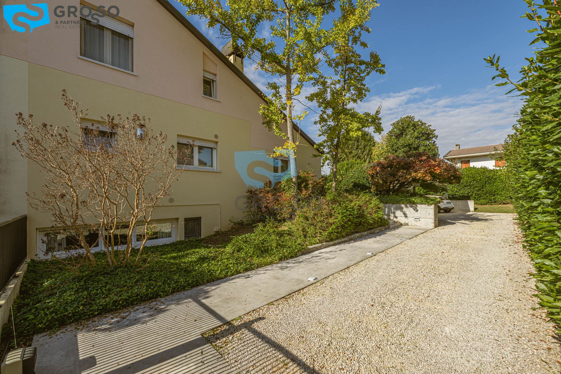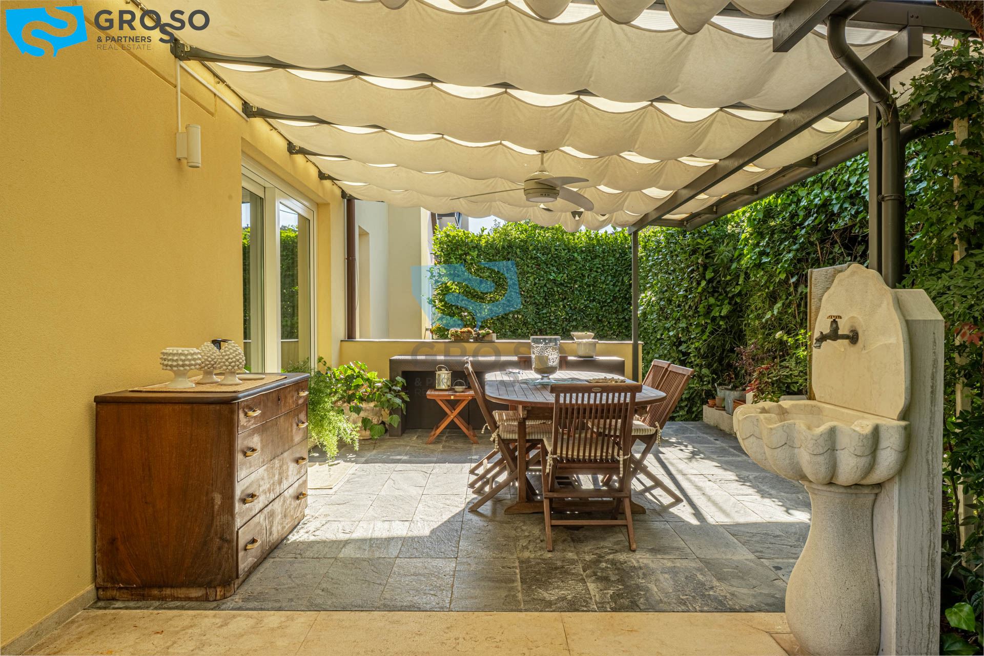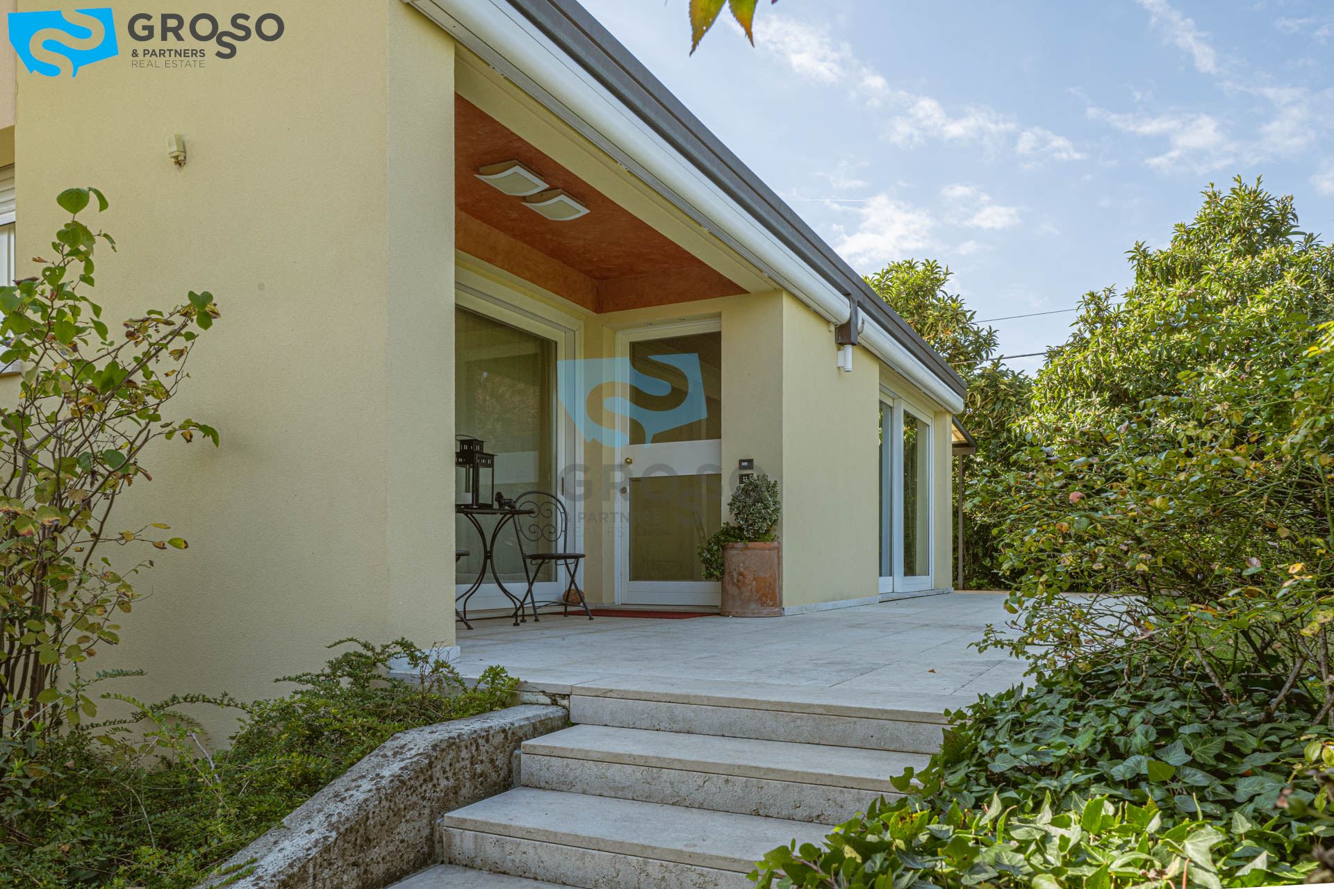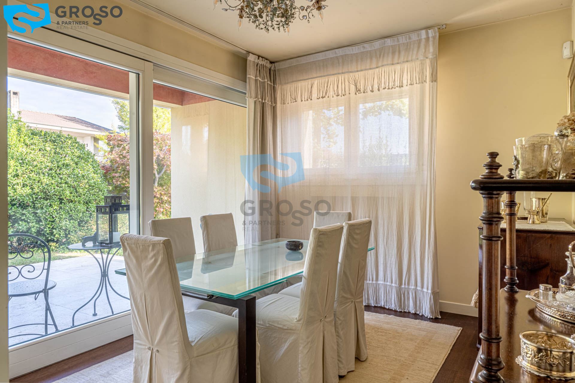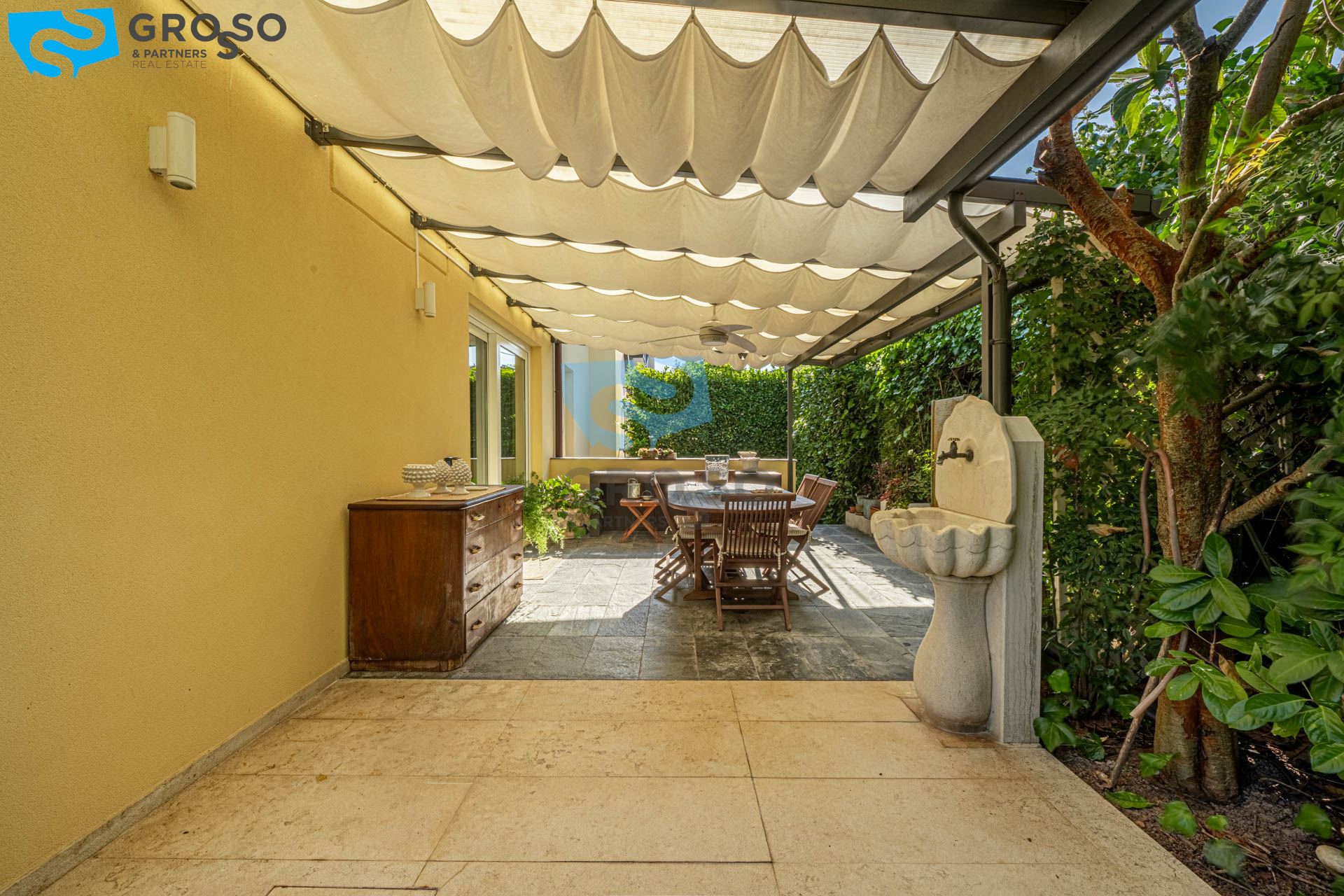 Strepitoso giardino piantumato, dal salotto si accede con un ampia vetrata scorrevole ad un plateatico coperto per le cene estive.