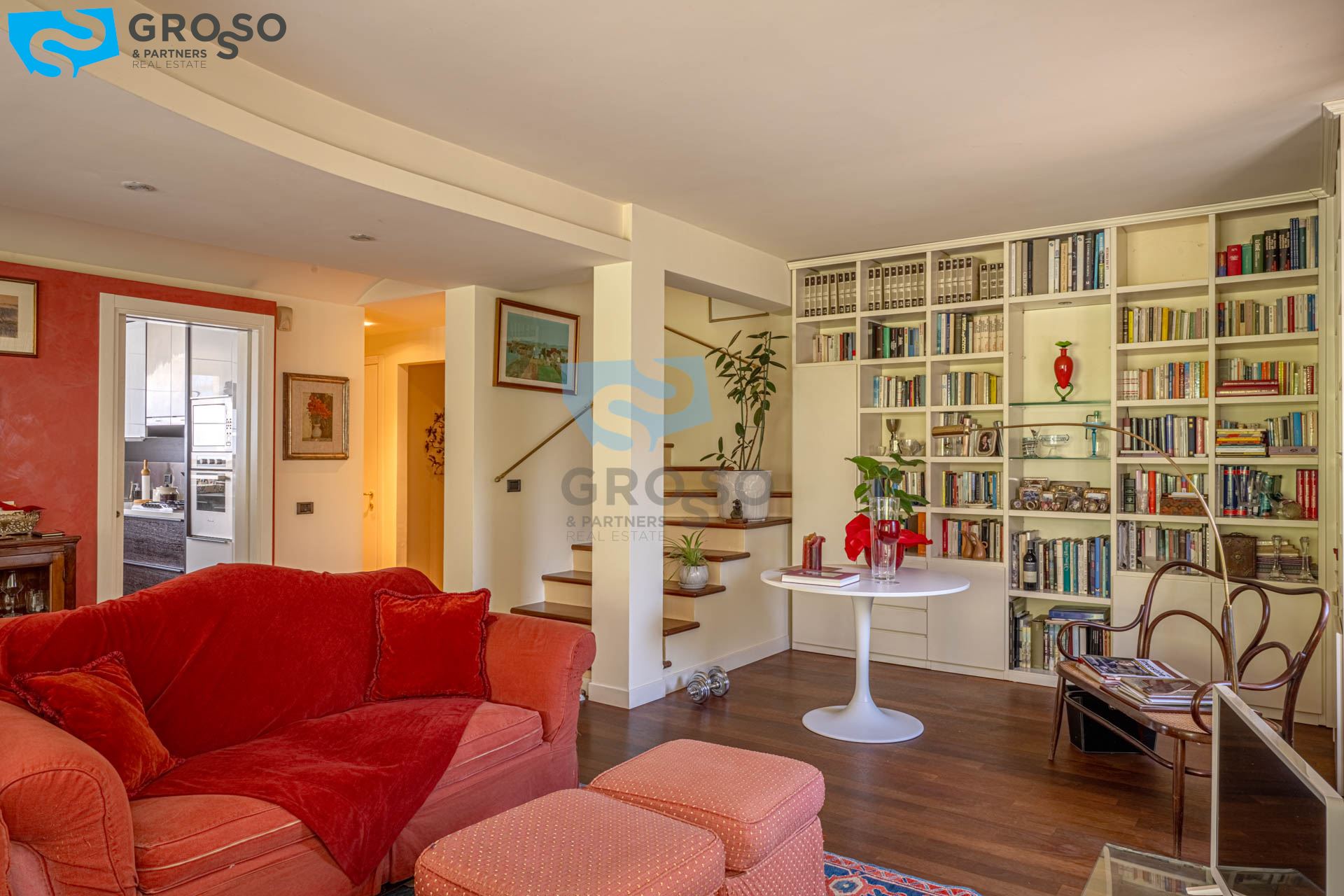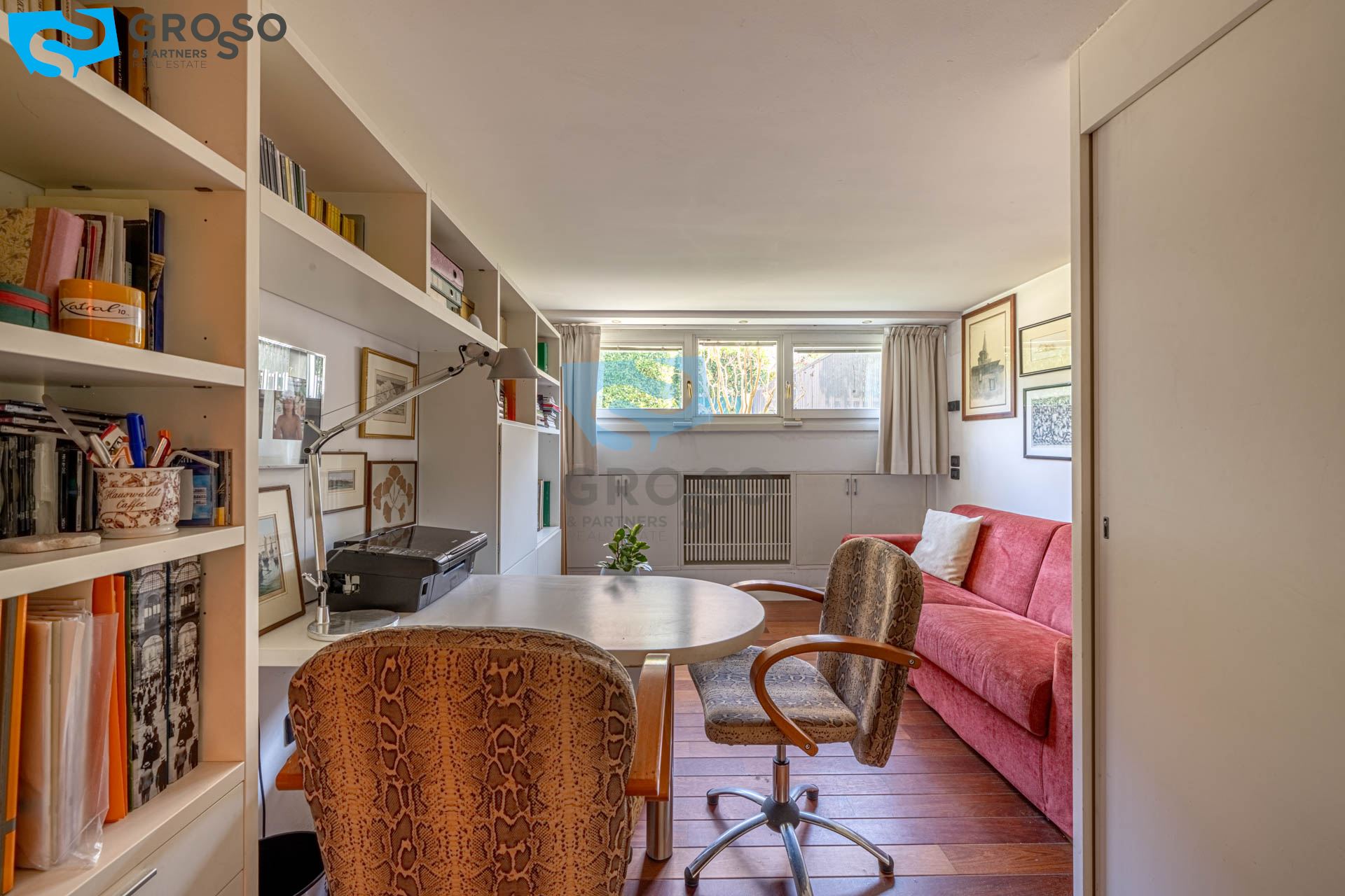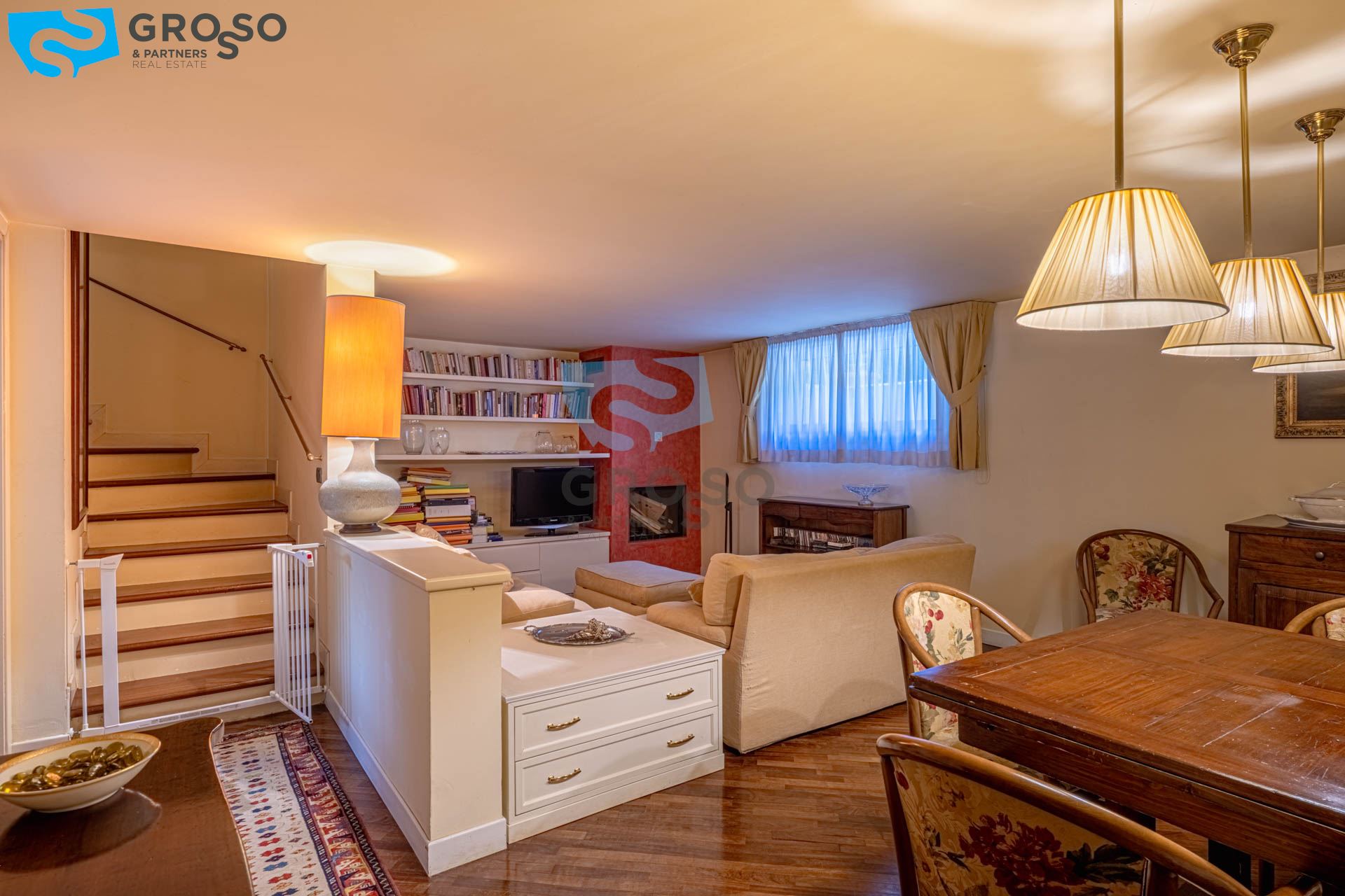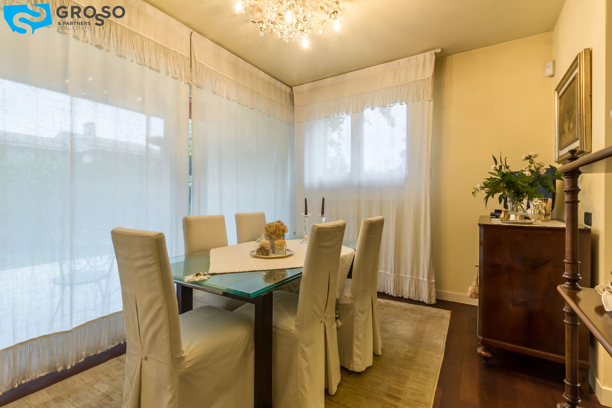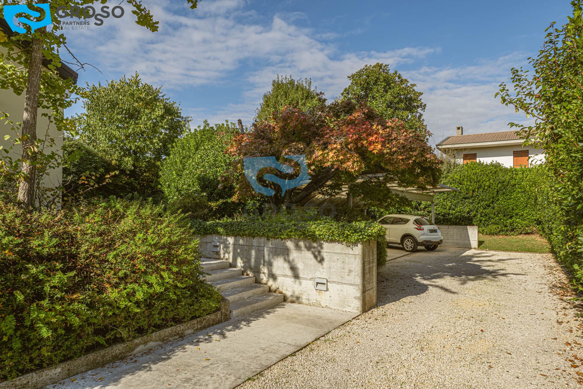 Strepitoso giardino piantumato, dal salotto si accede con un ampia vetrata scorrevole ad un plateatico coperto per le cene estive.