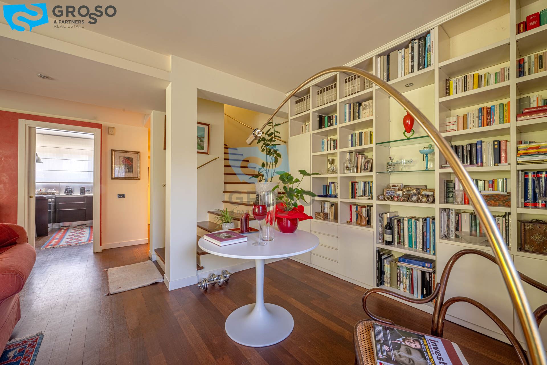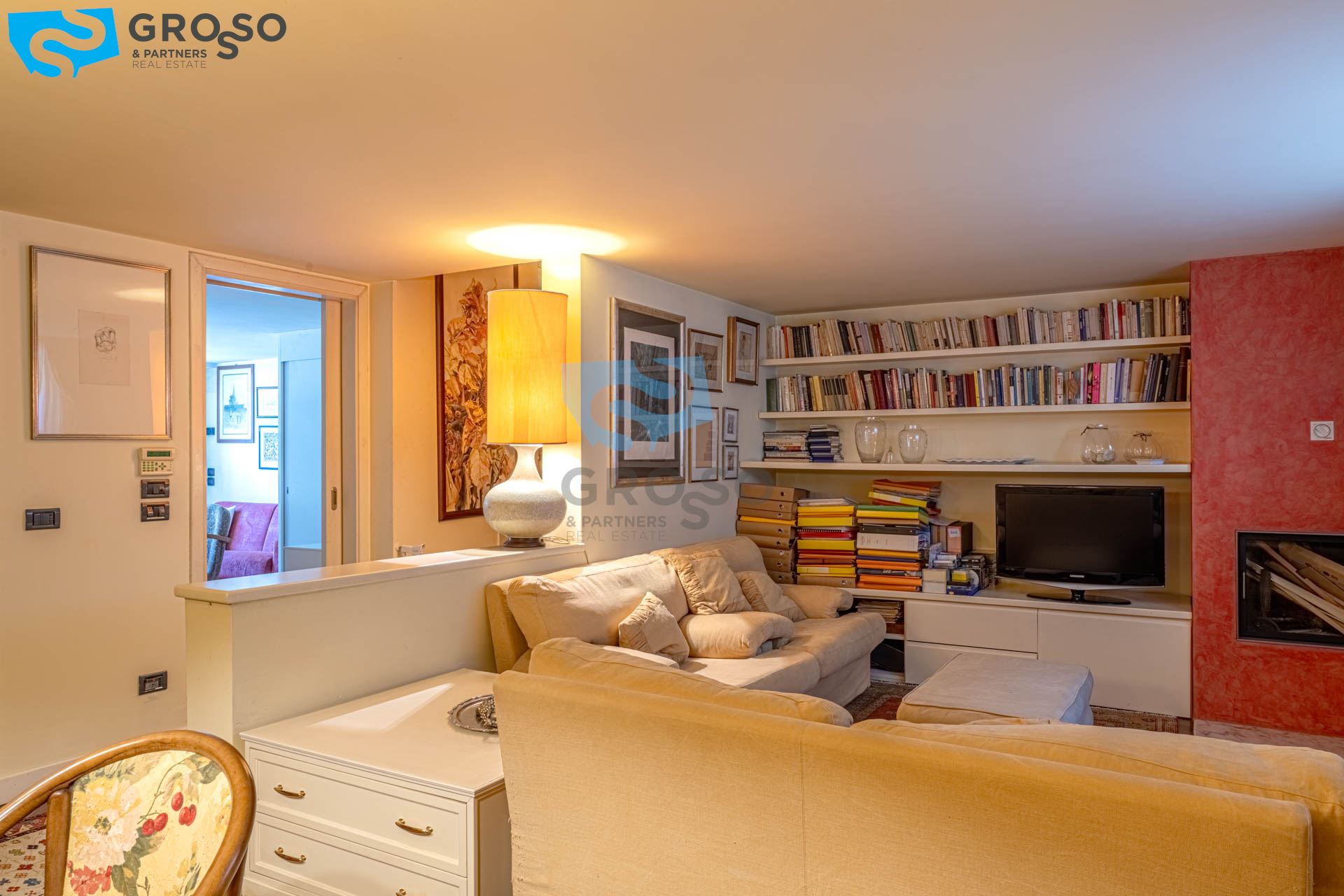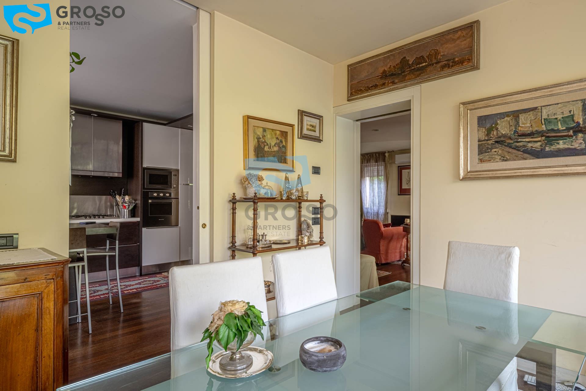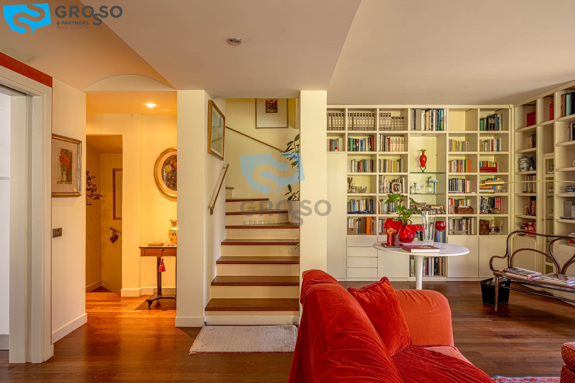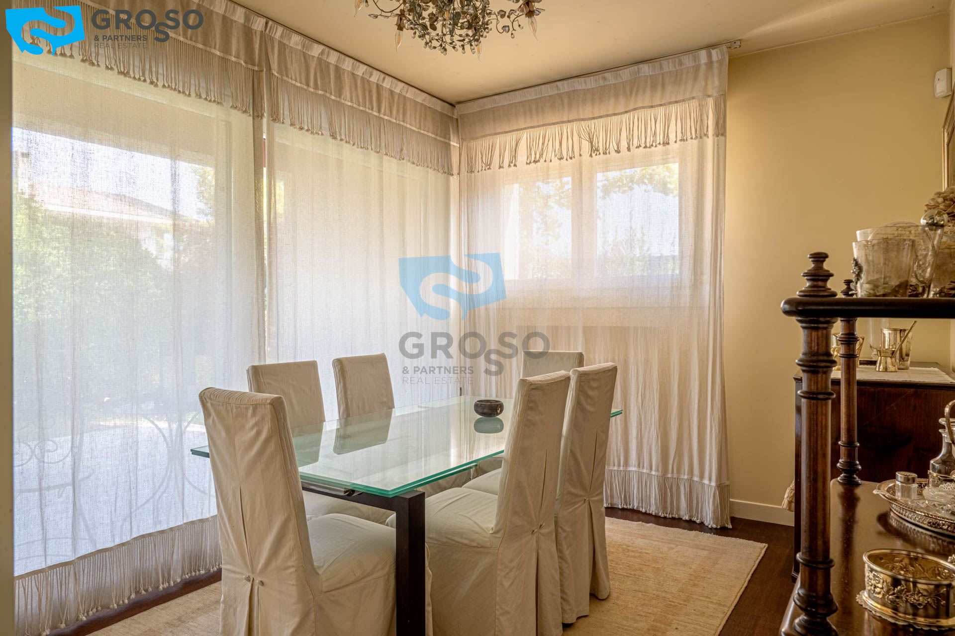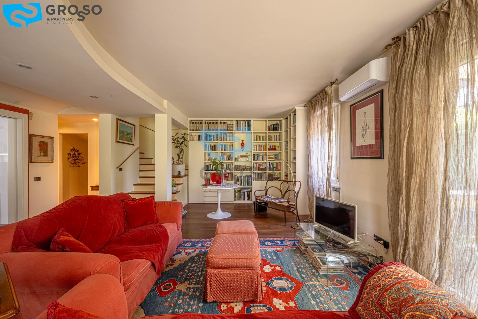 Strepitoso giardino piantumato, dal salotto si accede con un ampia vetrata scorrevole ad un plateatico coperto per le cene estive.
