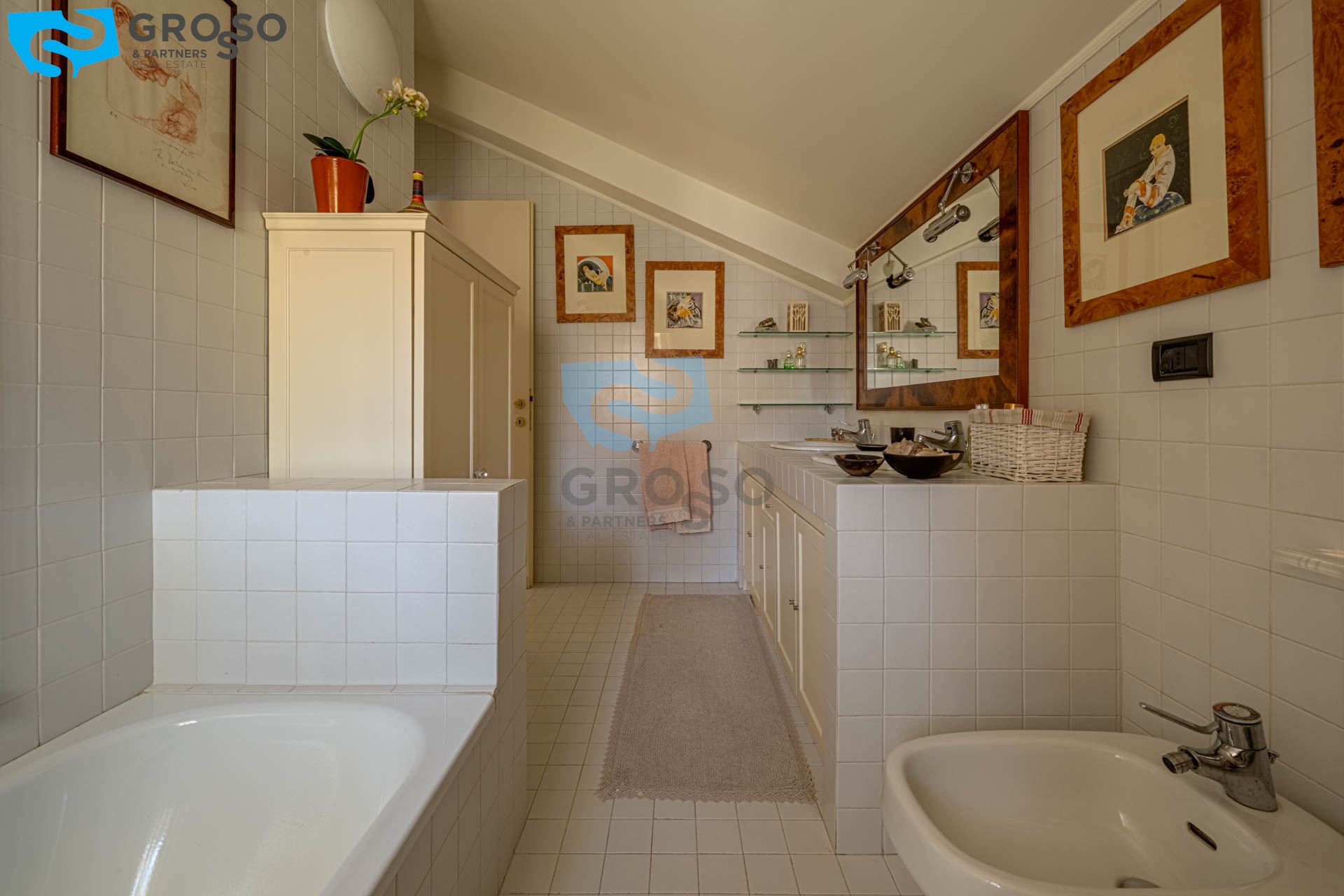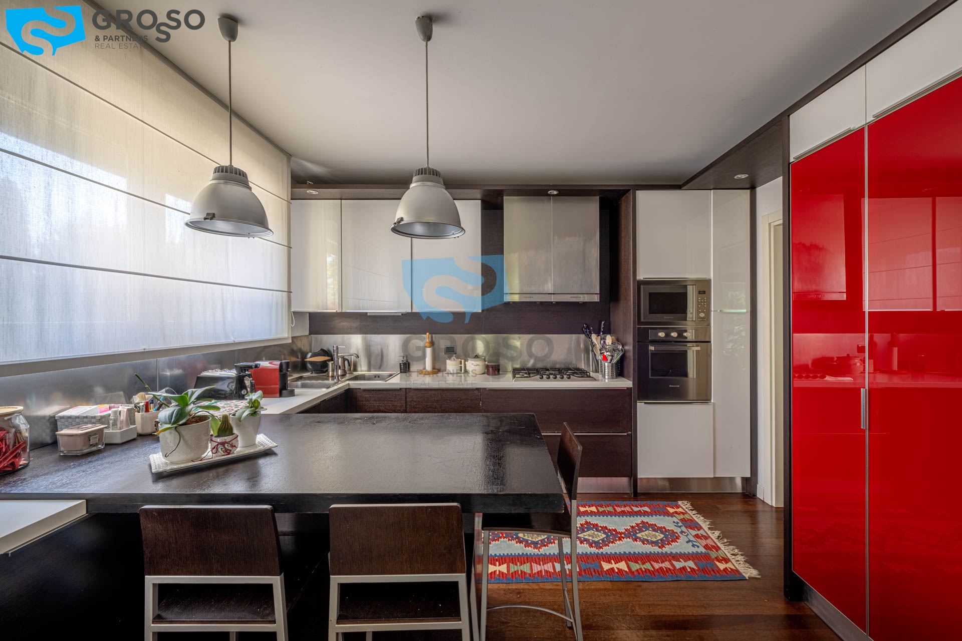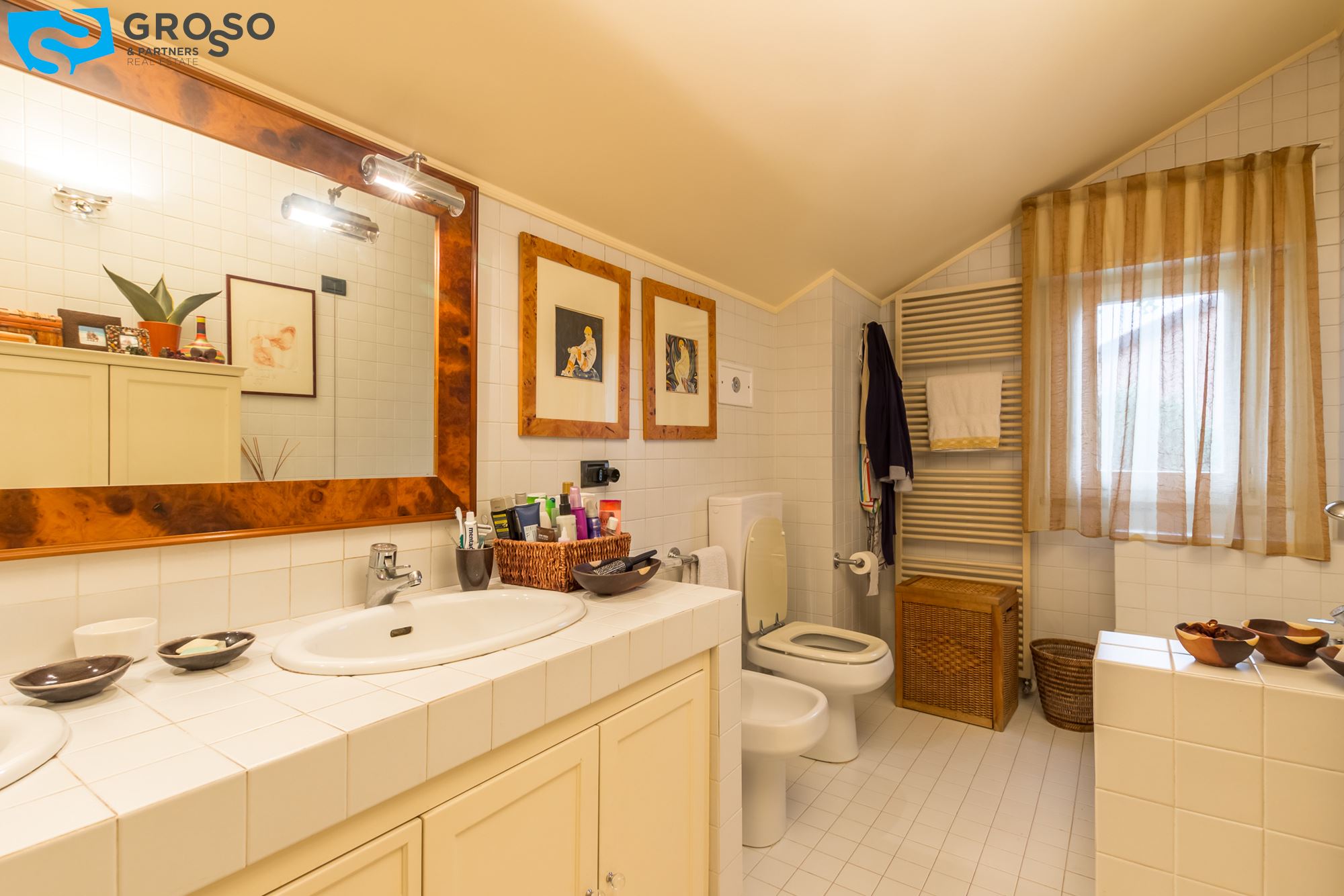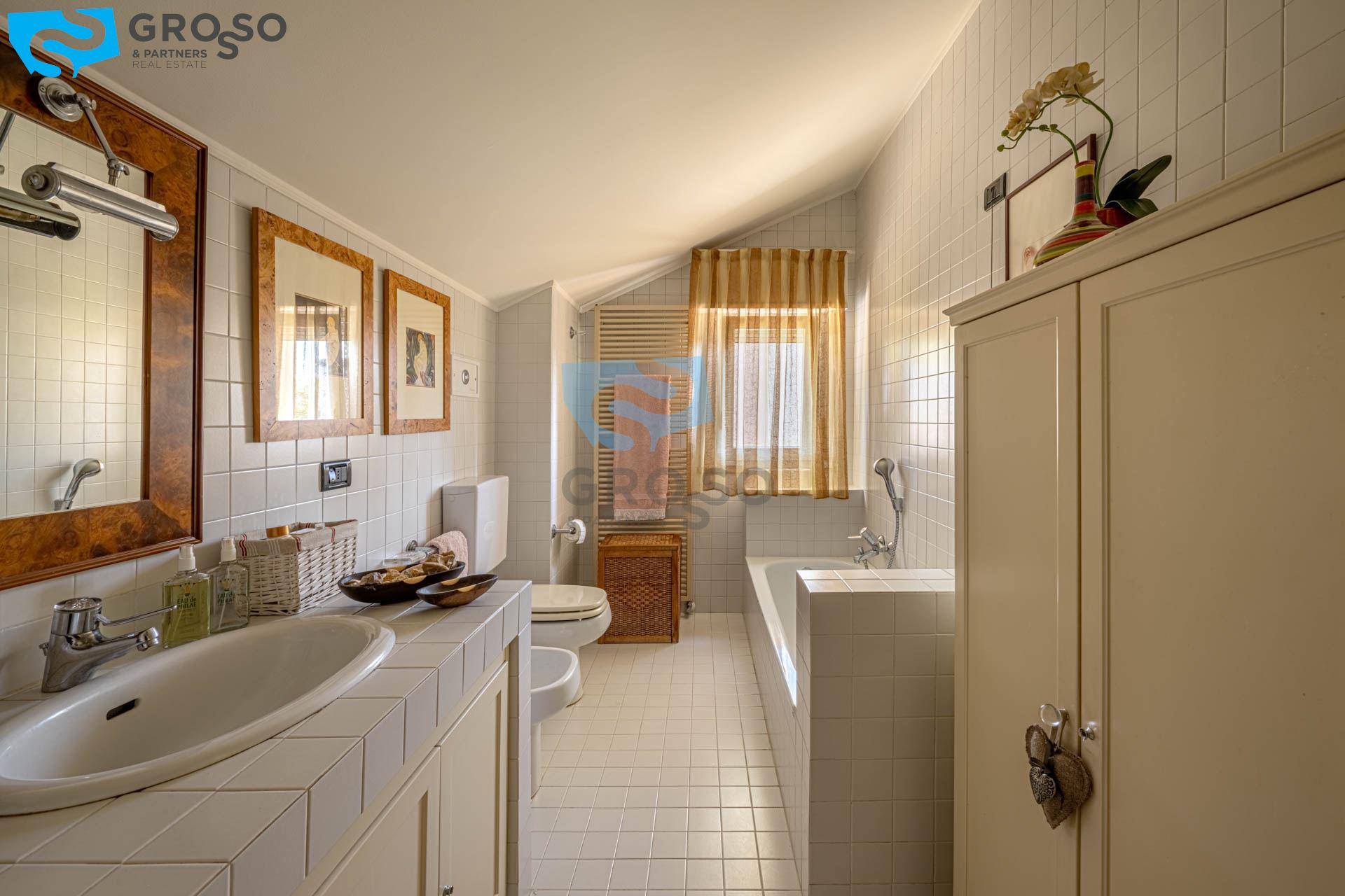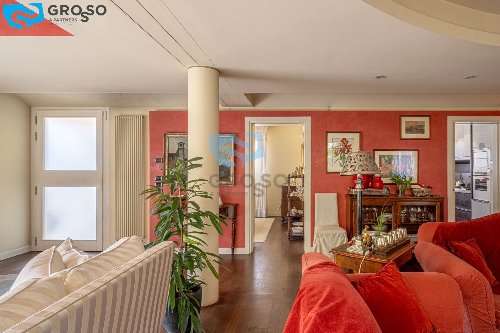 Strepitoso giardino piantumato, dal salotto si accede con un ampia vetrata scorrevole ad un plateatico coperto per le cene estive.