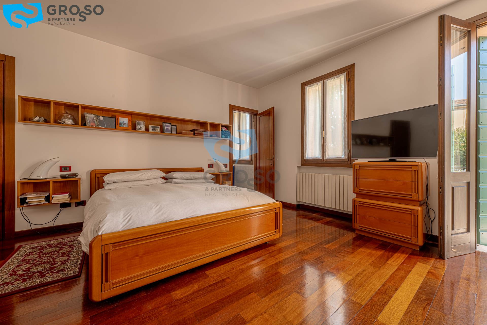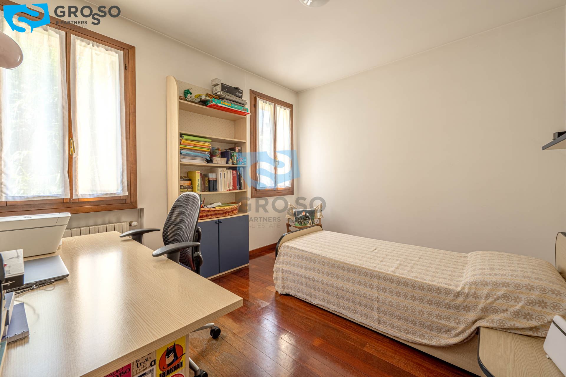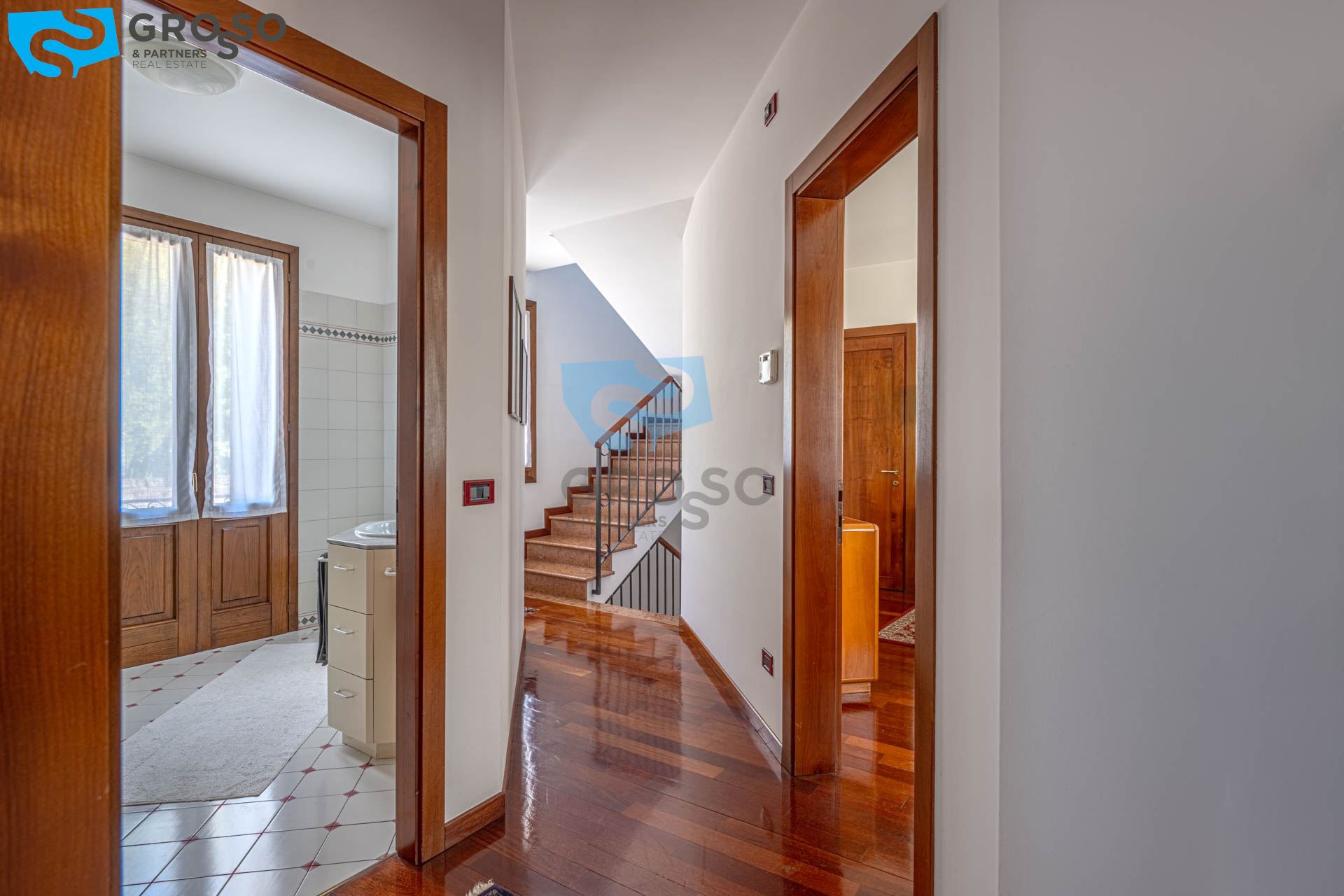 Al primo piano si sviluppa la zona notte, composta da una camera padronale con cabina armadio, bagno privato e terrazzino riservato, perfetto per i momenti di quiete. Completano il piano due ulteriori camere matrimoniali e un secondo bagno a servizio, ideali per accogliere una famiglia numerosa con comfort e privacy.
