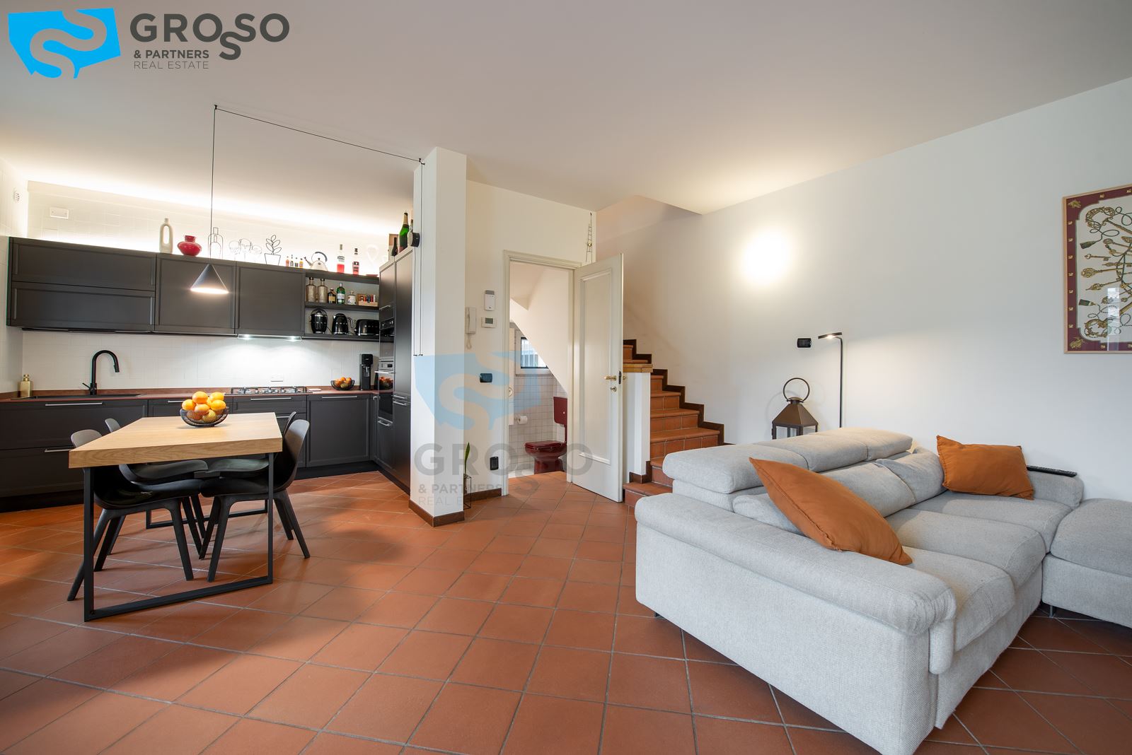L'abitazione accoglie al piano terra con un ingresso su soggiorno dotato di zona pranzo e cucina a vista, creando un ambiente funzionale e luminoso, oltre a un bagno di servizio.