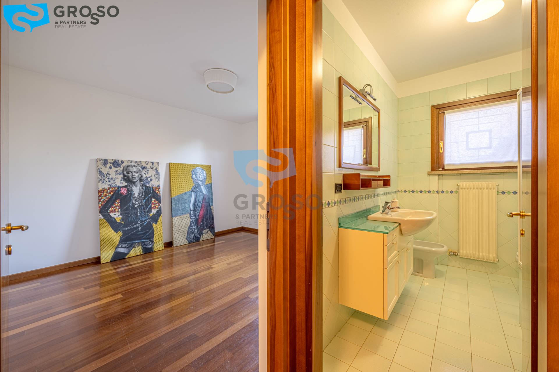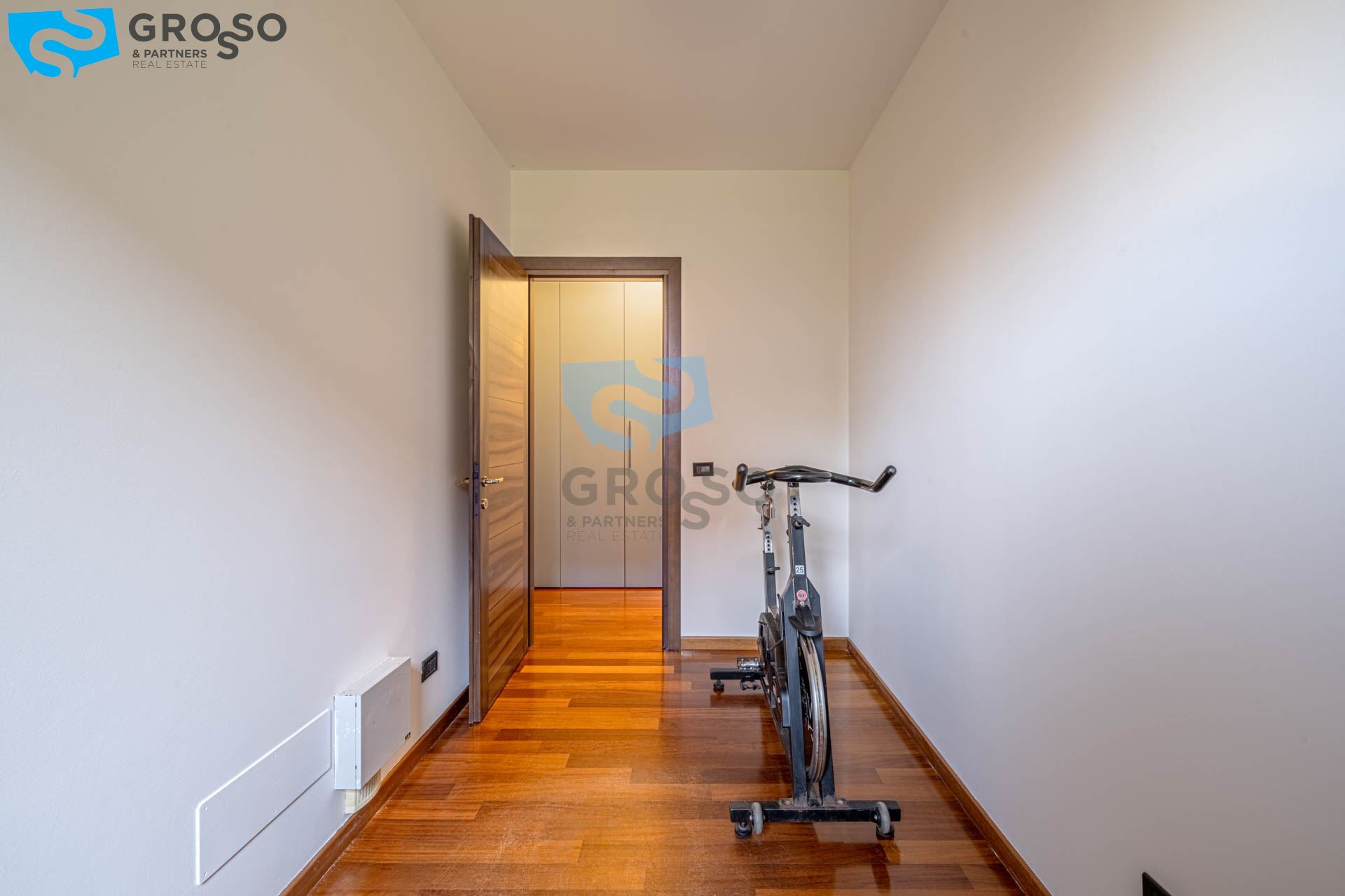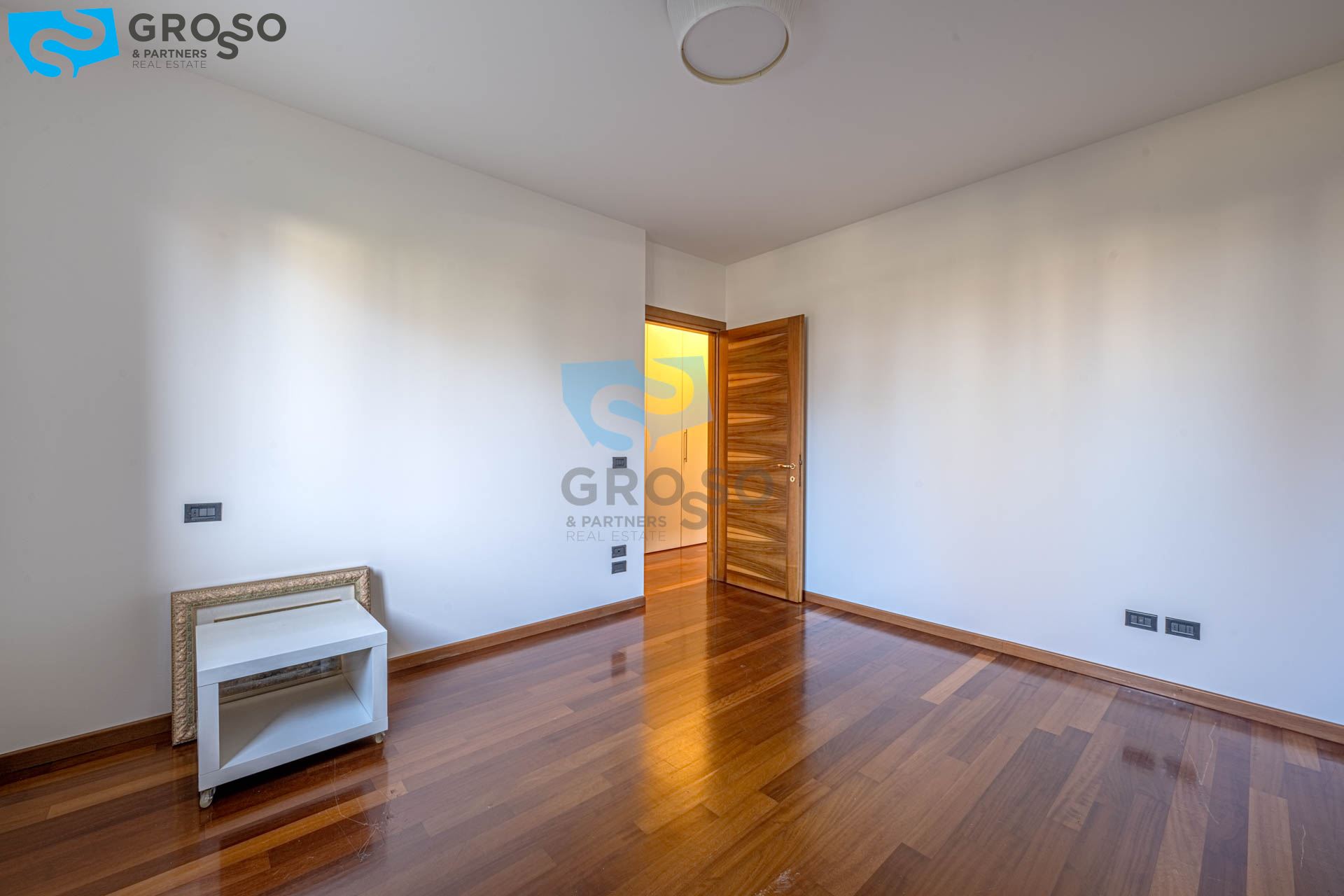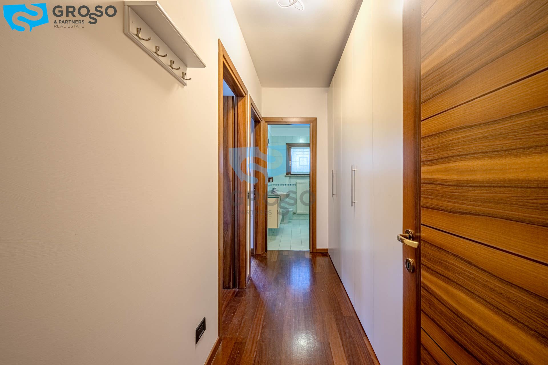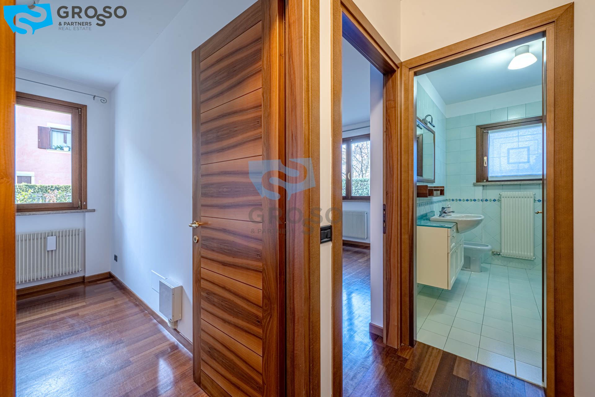 La zona notte offre un ampio disimpegno con armadio a muro e spazio per lavatrice e asciugatrice, una camera singola/studio, una camera matrimoniale e un bagno finestrato.