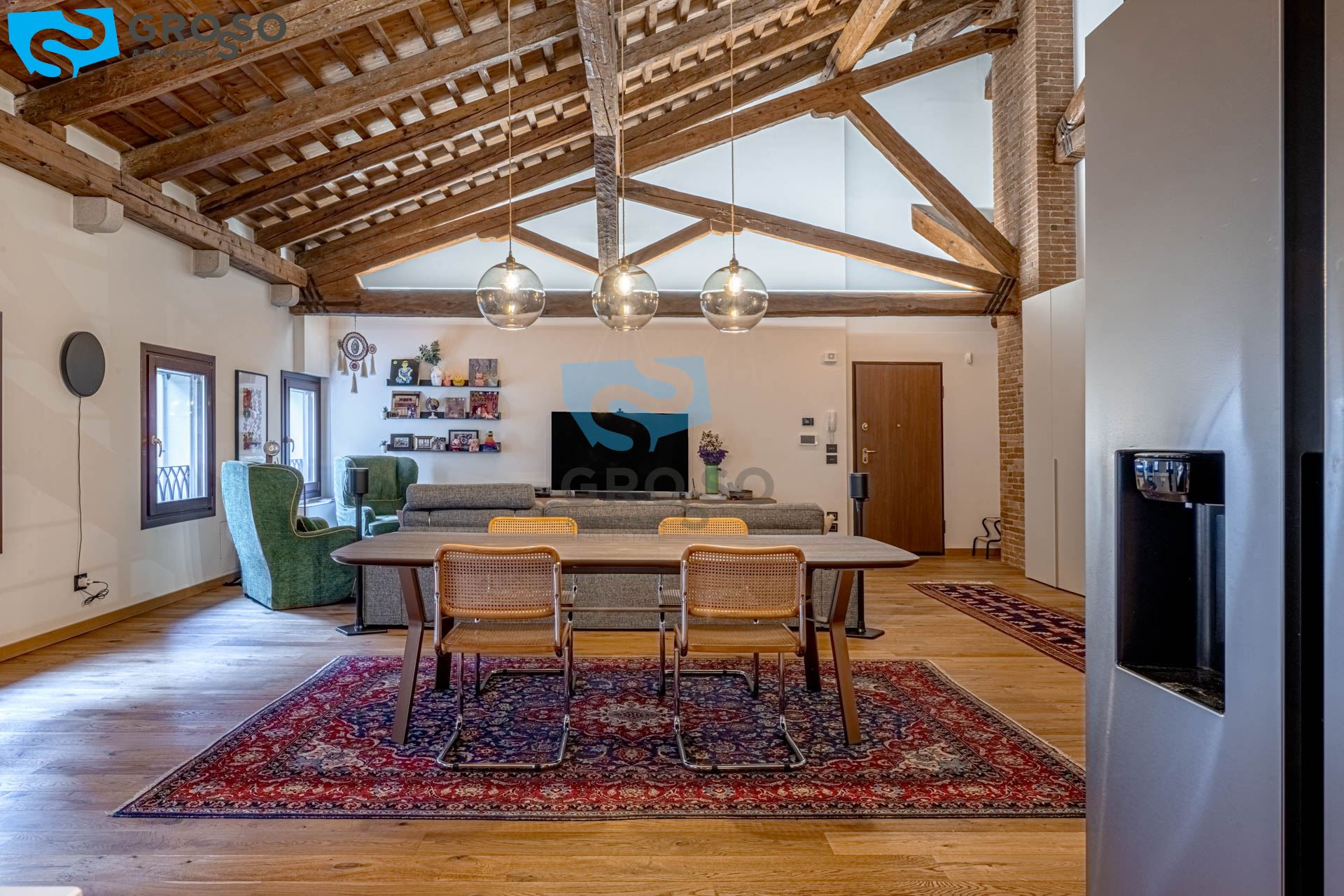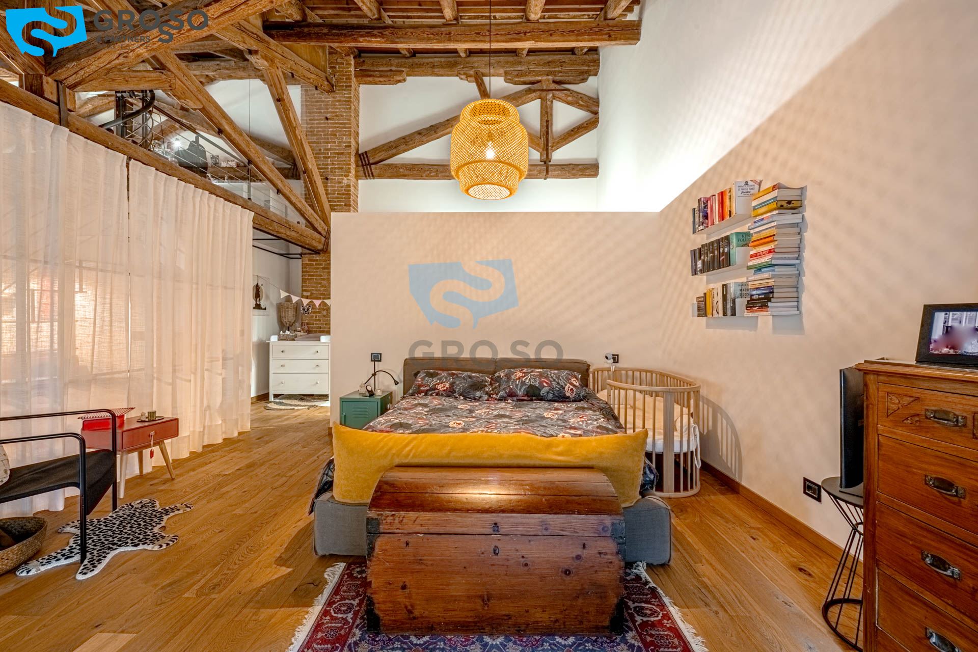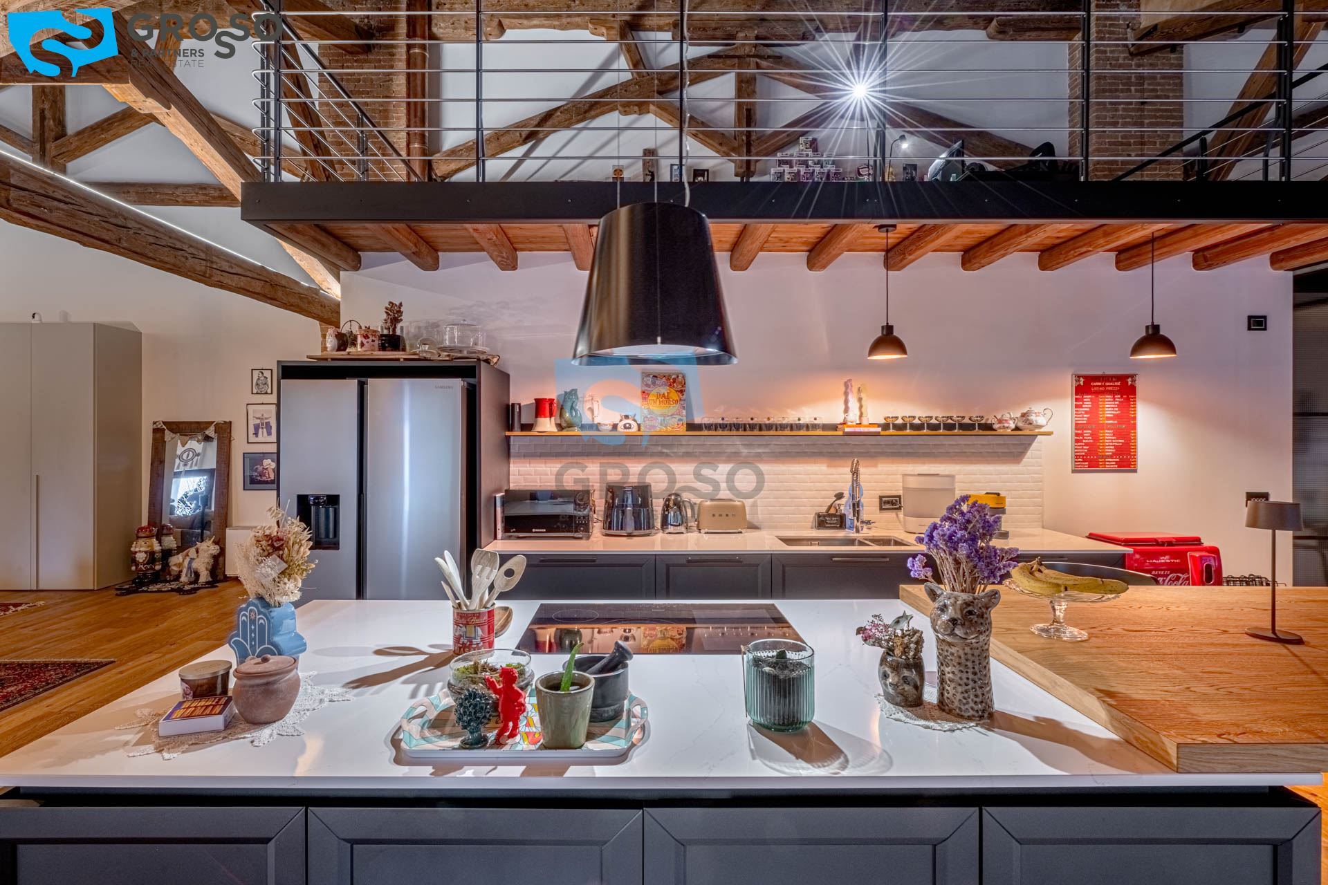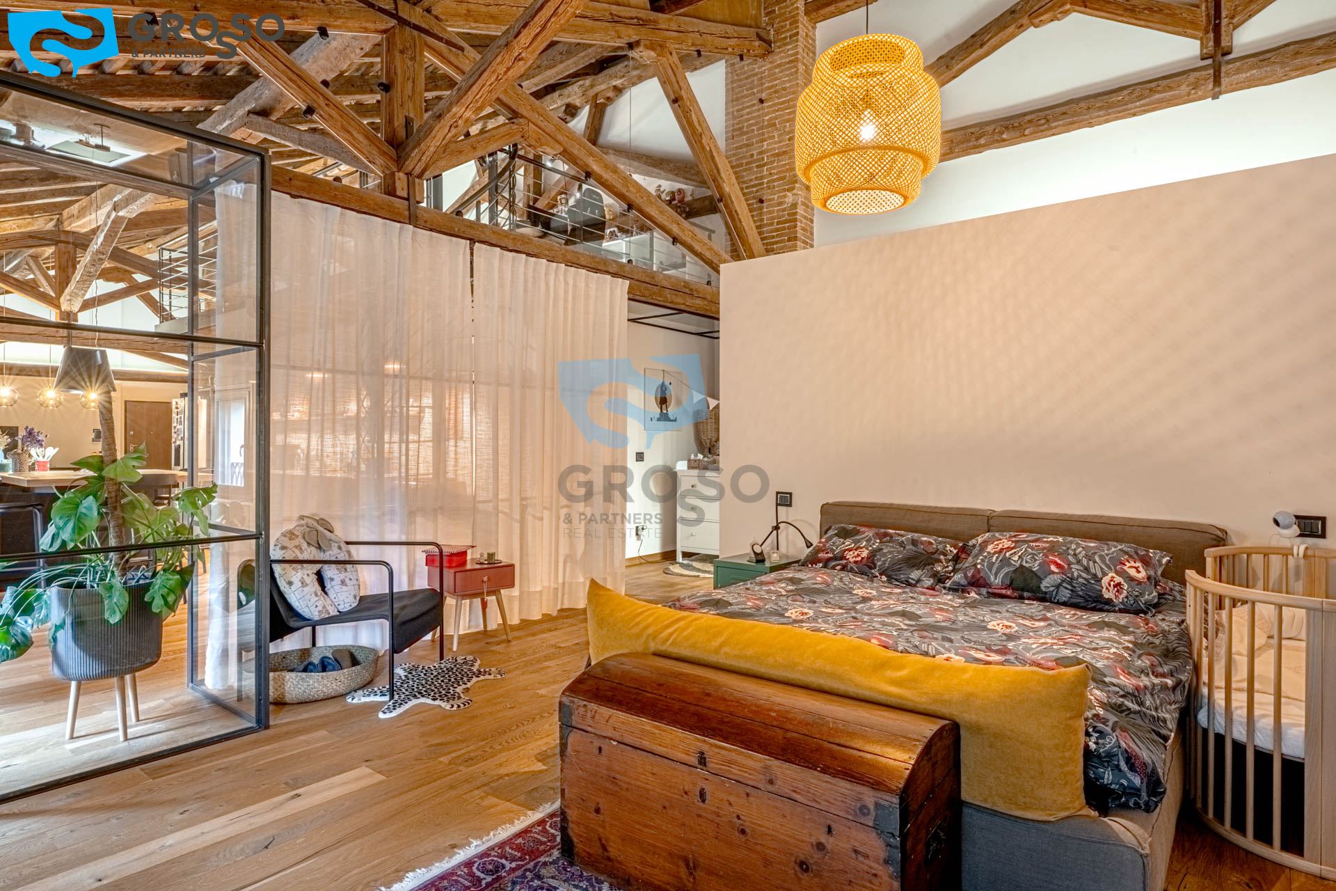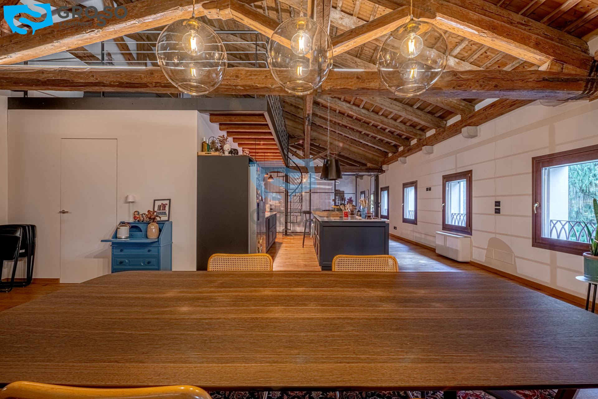 L'appartamento si sviluppa su una superficie calpestabile di 165 mq calpestabili, al primo piano della bellissima barchessa del '700. L'ingresso è sulla scenografica zona giorno open space con salotto e cucina a vista, bagno completo. Una parete vetrata divide la zona living dalla camera matrimoniale con cabina armadio e secondo bagno. Completa l'immobile il soppalco mansardato che può essere adibito a seconda cameretta o studio. Al piano terra troviamo un magazzino e due comodi posti auto scoperti. Riscaldamento autonomo a pavimento e aria condizionata.