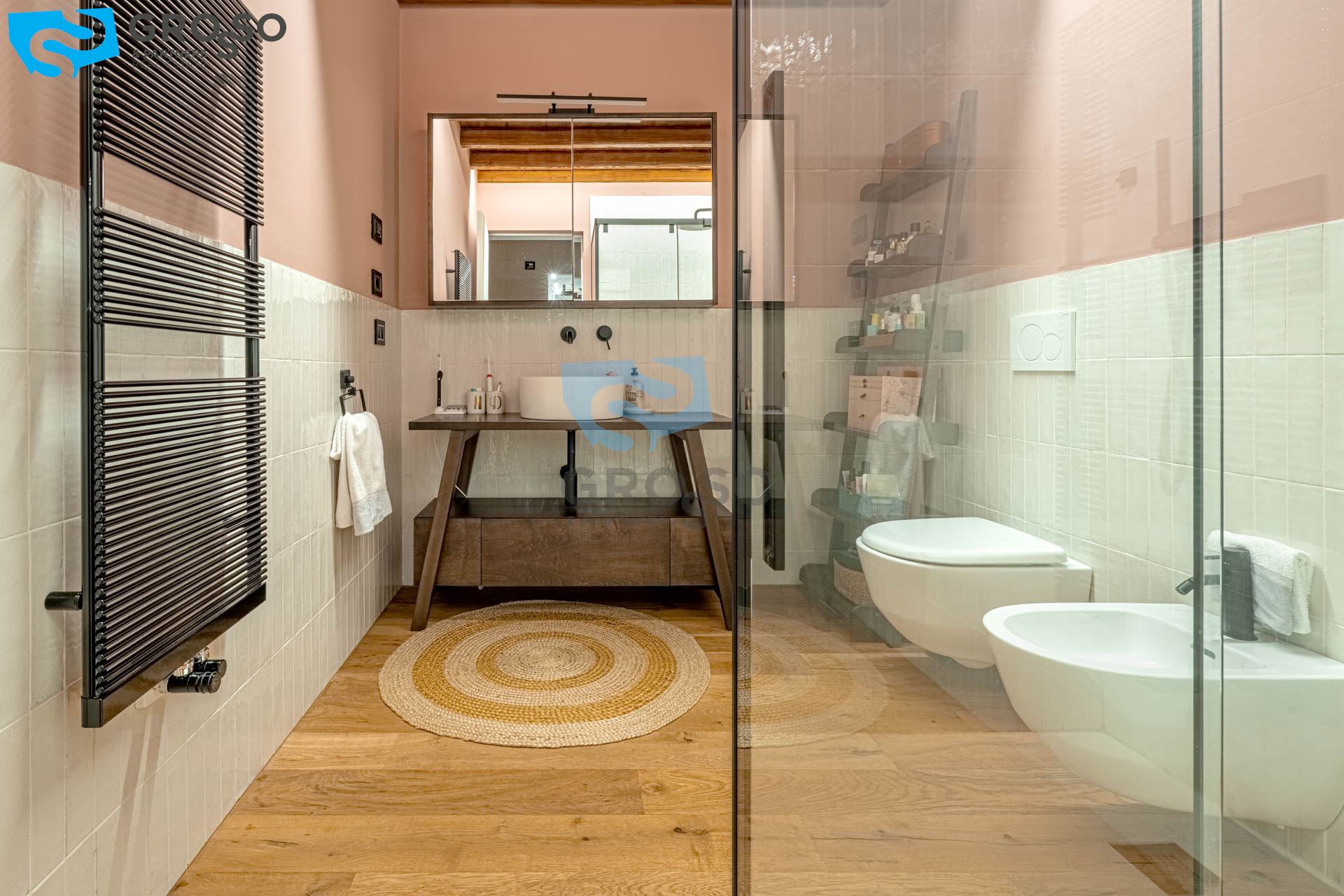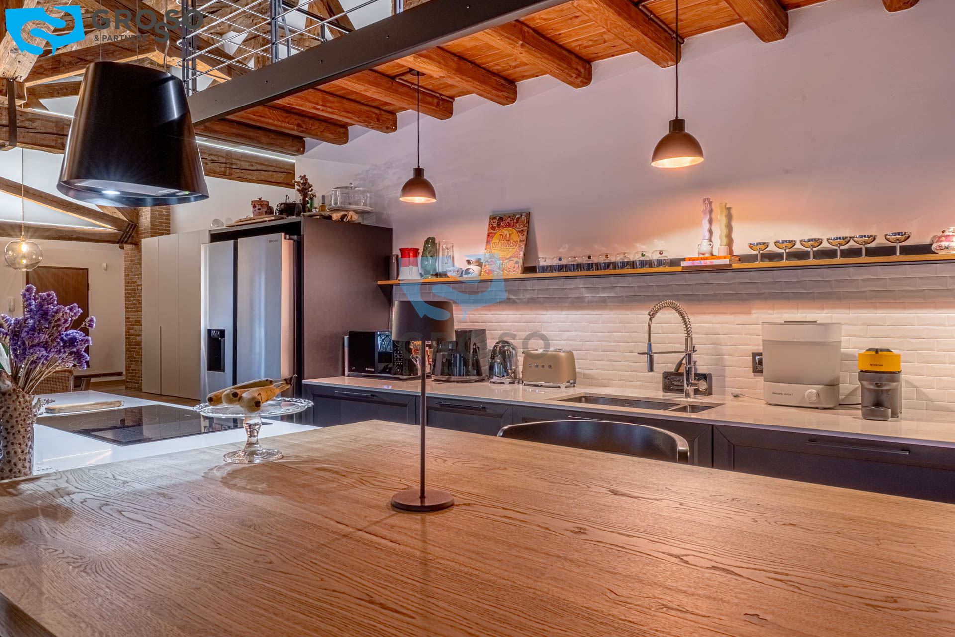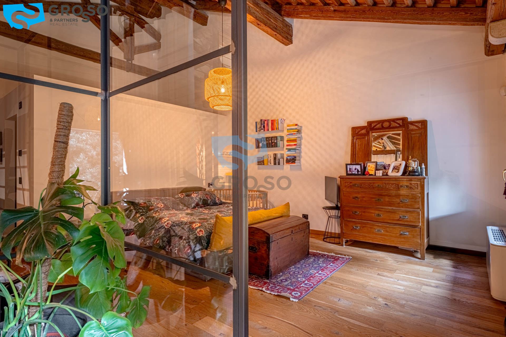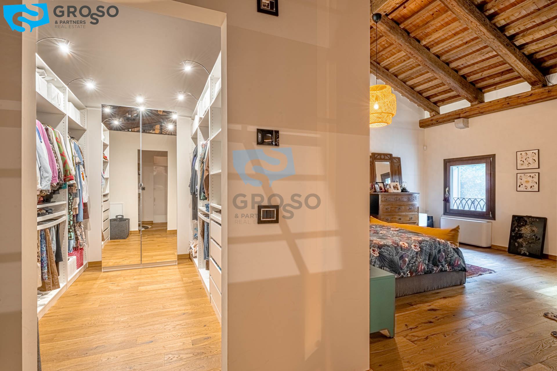 L'appartamento si sviluppa su una superficie calpestabile di 165 mq calpestabili, al primo piano della bellissima barchessa del '700. L'ingresso è sulla scenografica zona giorno open space con salotto e cucina a vista, bagno completo. Una parete vetrata divide la zona living dalla camera matrimoniale con cabina armadio e secondo bagno. Completa l'immobile il soppalco mansardato che può essere adibito a seconda cameretta o studio. Al piano terra troviamo un magazzino e due comodi posti auto scoperti. Riscaldamento autonomo a pavimento e aria condizionata.