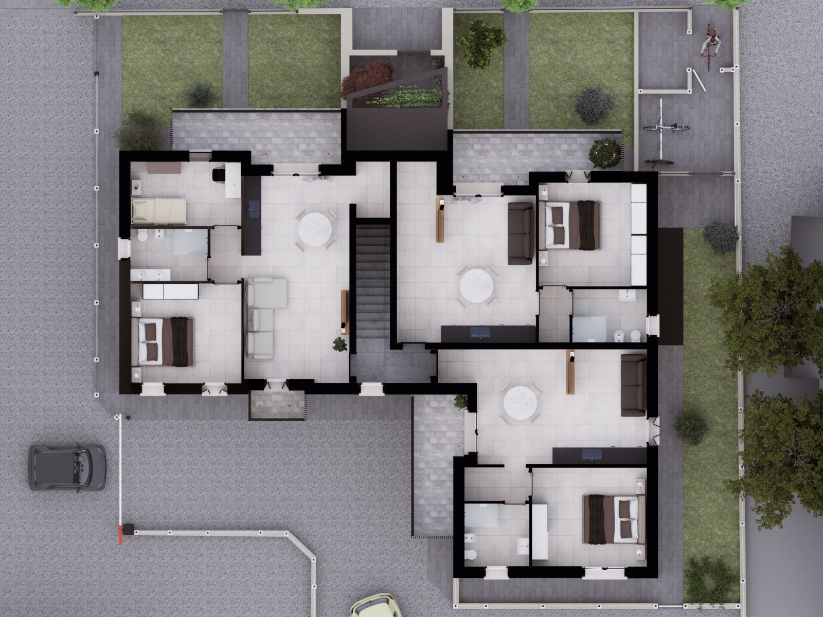 La disposizione esterna delle "Residenze Cesare" è studiata per garantire la massima fruibilità degli spazi, con un'area parcheggio esterna dotata di chiusura automatica, un'isola ecologica e uno stallo per biciclette ad uso esclusivo dei condomini.