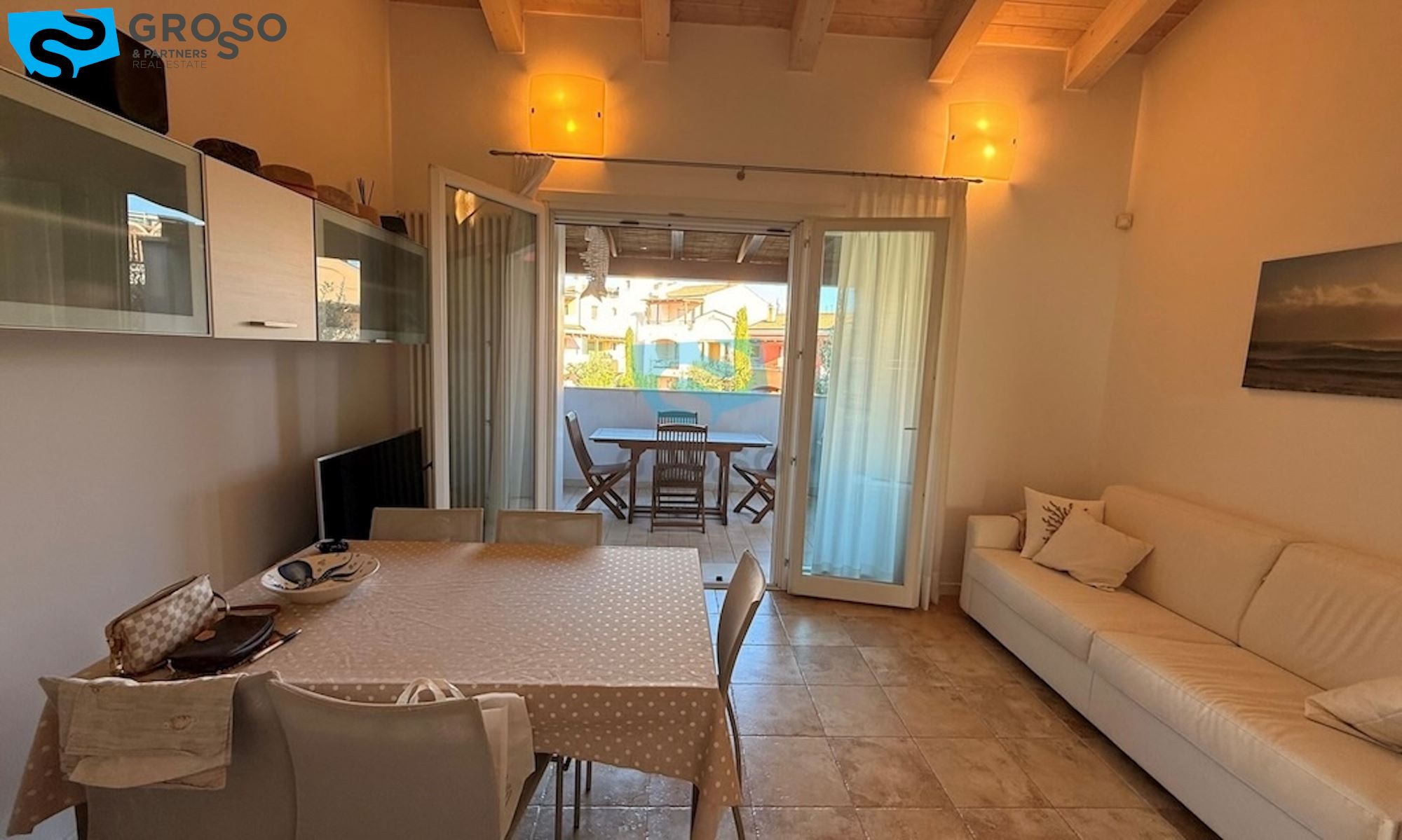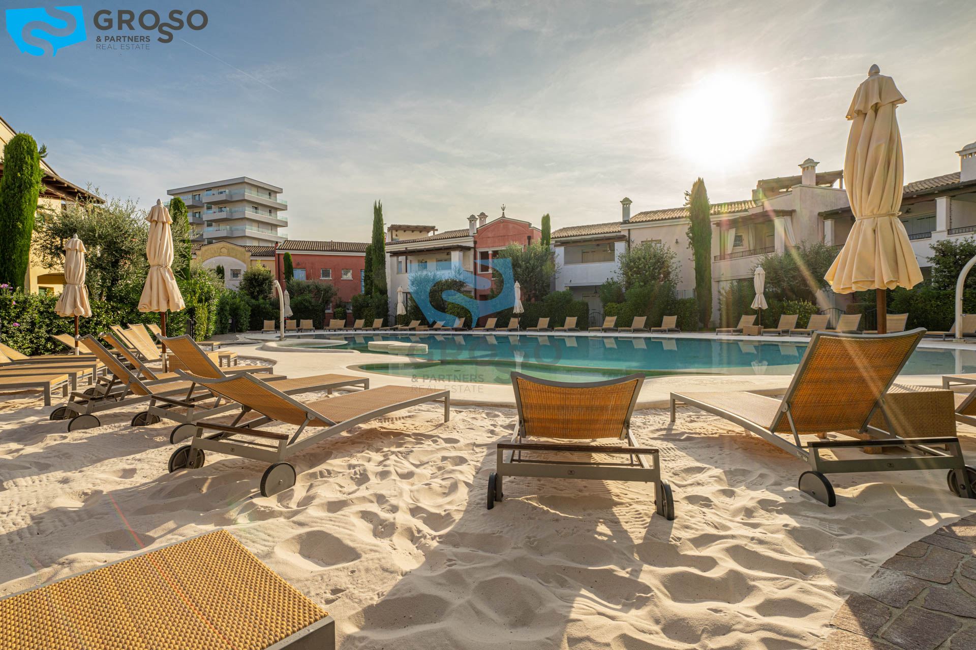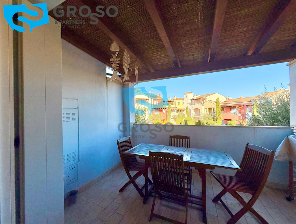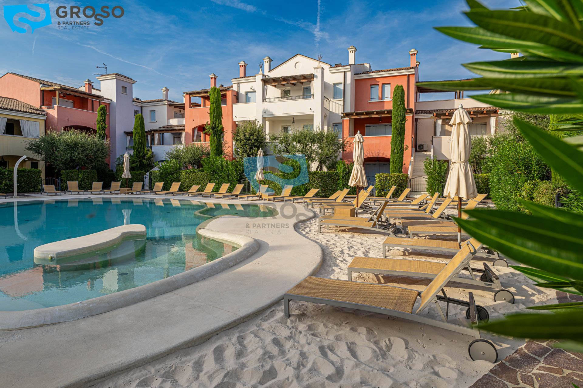 L' immobile è composto da un ampio soggiorno con angolo cottura, perfettamente integrato nella zona living e con accesso diretto alla terrazza coperta, spazio ideale per pranzi e cene all'aperto con affaccio sulla splendida piscina condominiale. La zona notte comprende una camera matrimoniale, una cameretta e un bagno finestrato dotato di tutti i comfort.