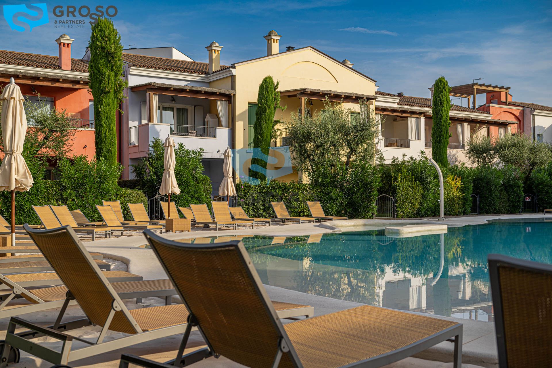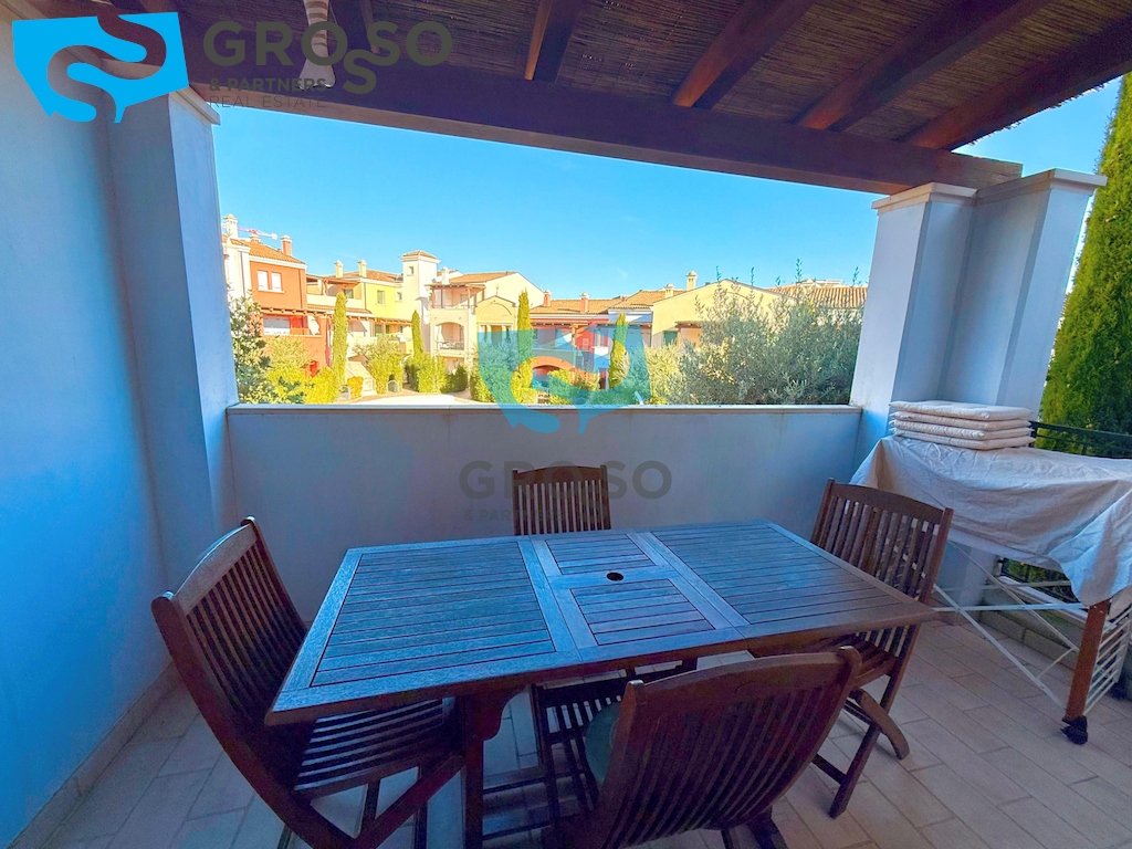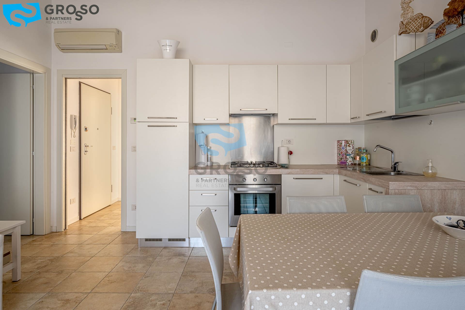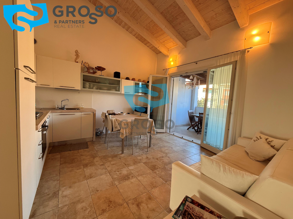 L' immobile è composto da un ampio soggiorno con angolo cottura, perfettamente integrato nella zona living e con accesso diretto alla terrazza coperta, spazio ideale per pranzi e cene all'aperto con affaccio sulla splendida piscina condominiale. La zona notte comprende una camera matrimoniale, una cameretta e un bagno finestrato dotato di tutti i comfort.