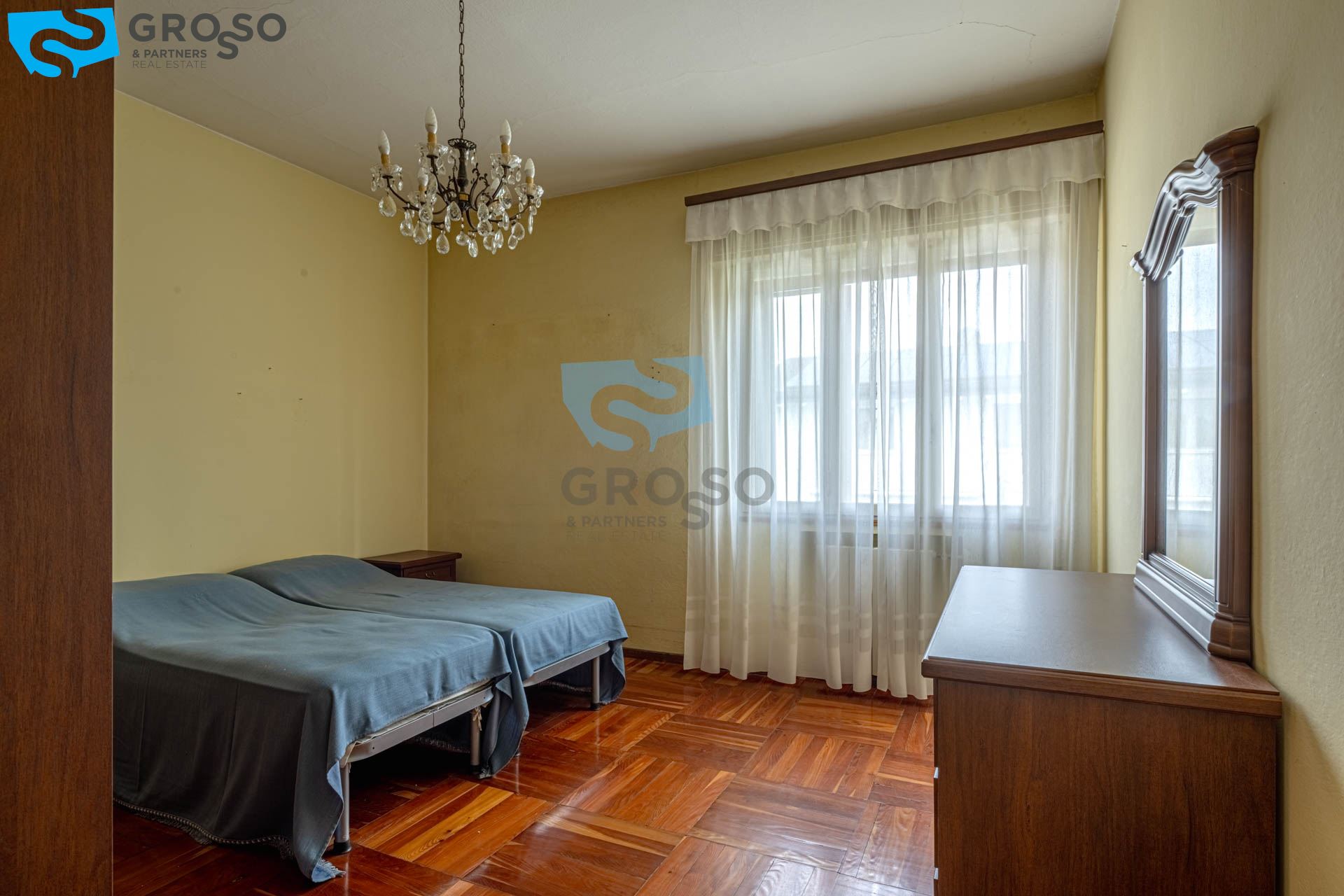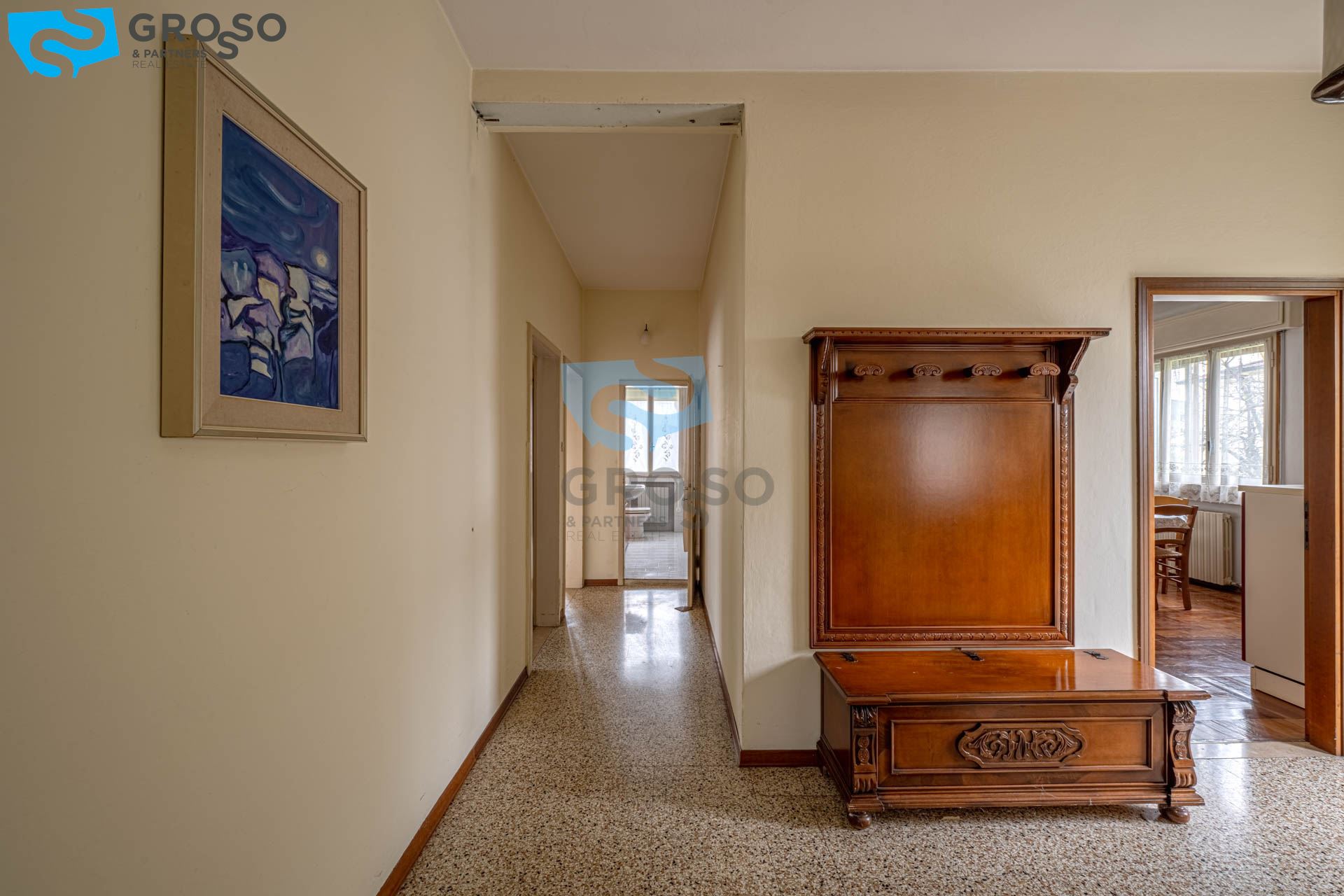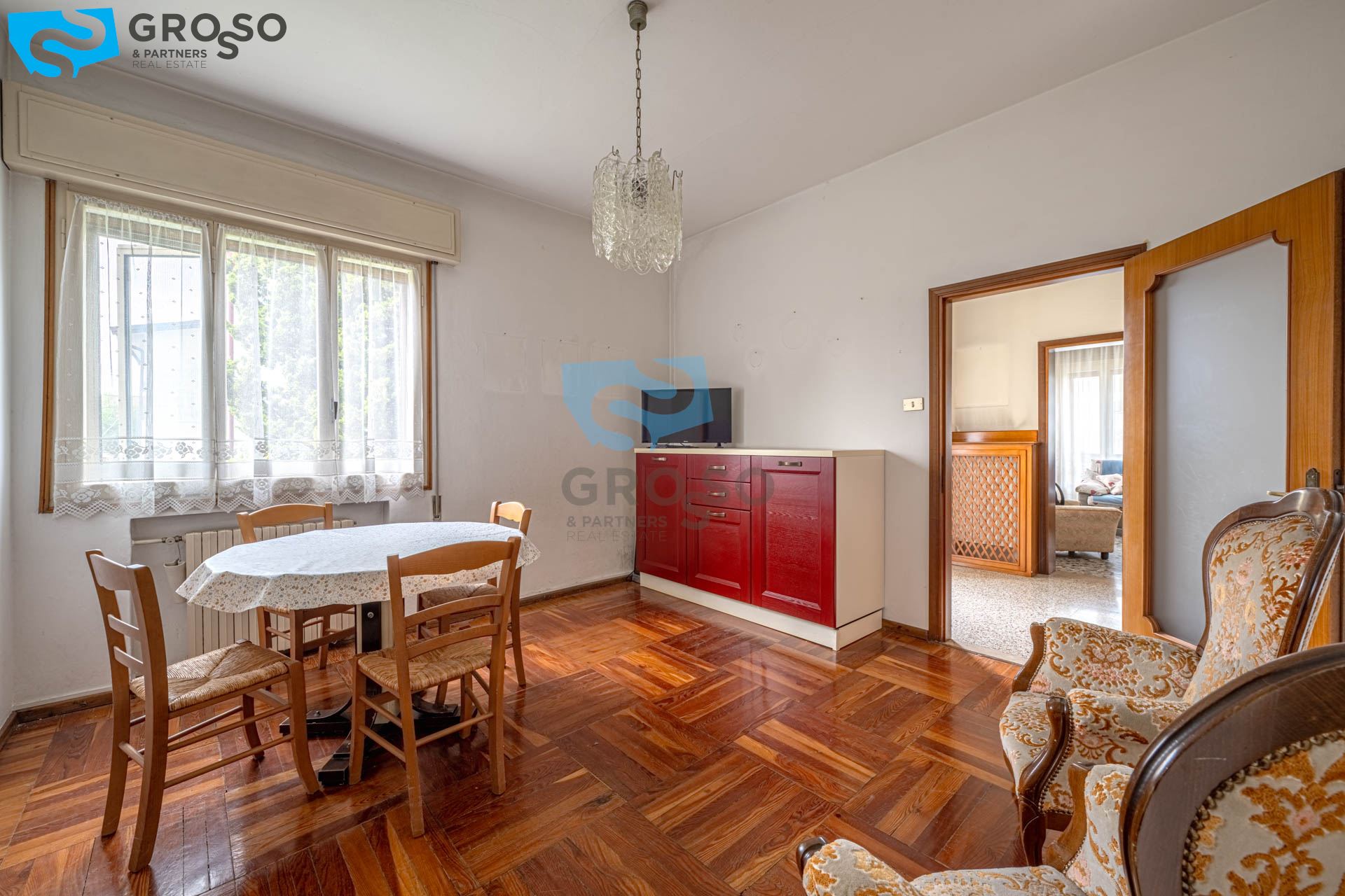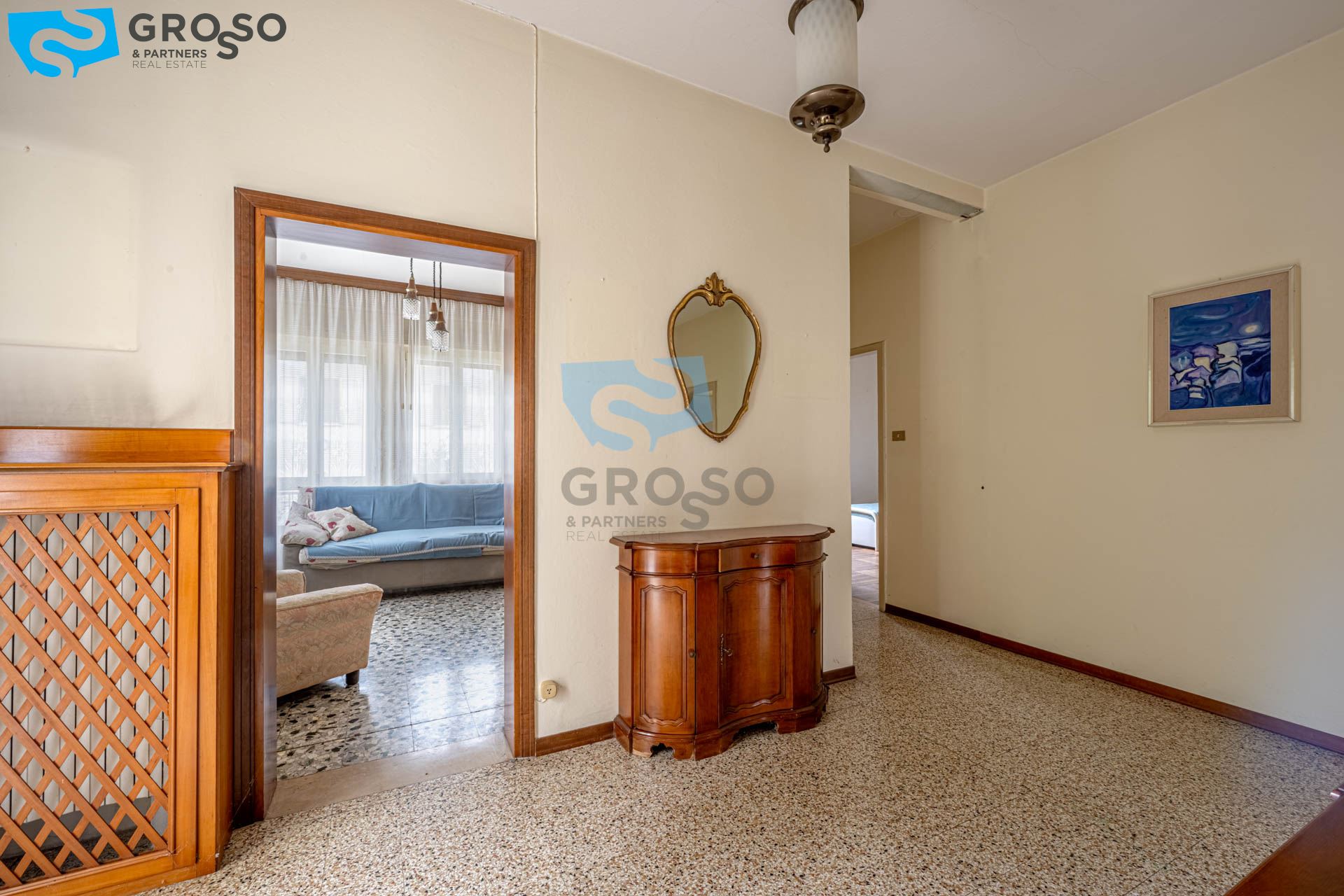 Il primo piano, luminoso e ben distribuito, è composto da ingresso, soggiorno, cucinotto separato, sala da pranzo, tre spaziose camere matrimoniali e un bagno.