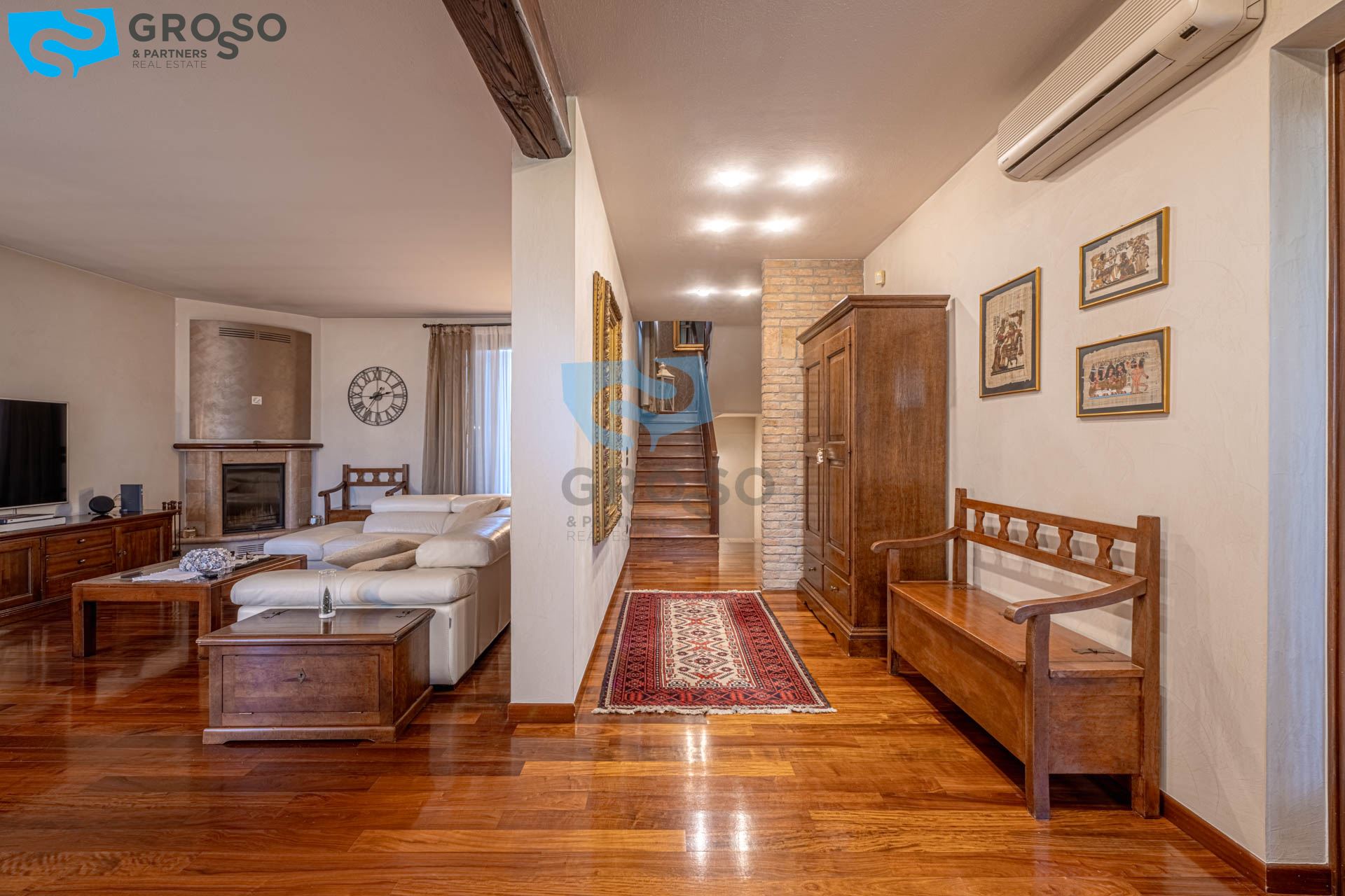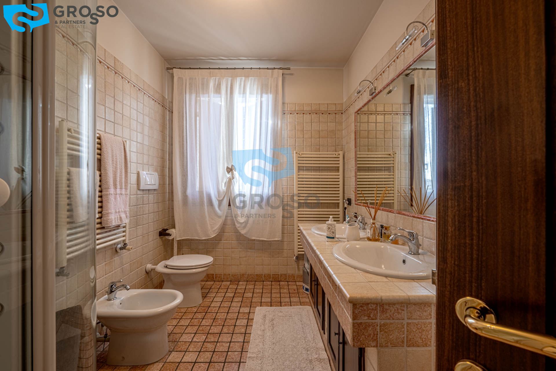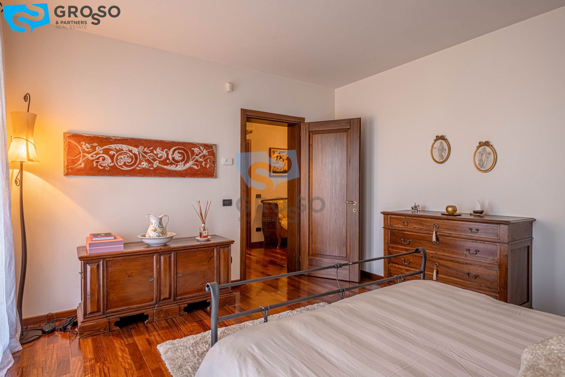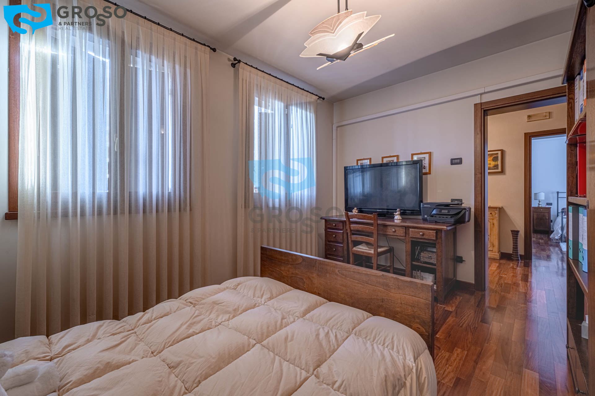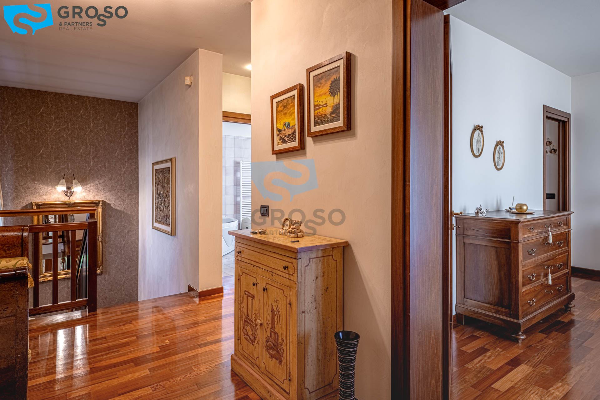 Salendo al piano primo si sviluppa la zona notte, composta da tre camere da letto di cui due matrimoniali e una doppia, ideali per famiglie. A servizio del reparto notte è presente un bagno finestrato, oltre a due pratici guardaroba che aggiungono ulteriore comodità e organizzazione degli spazi.