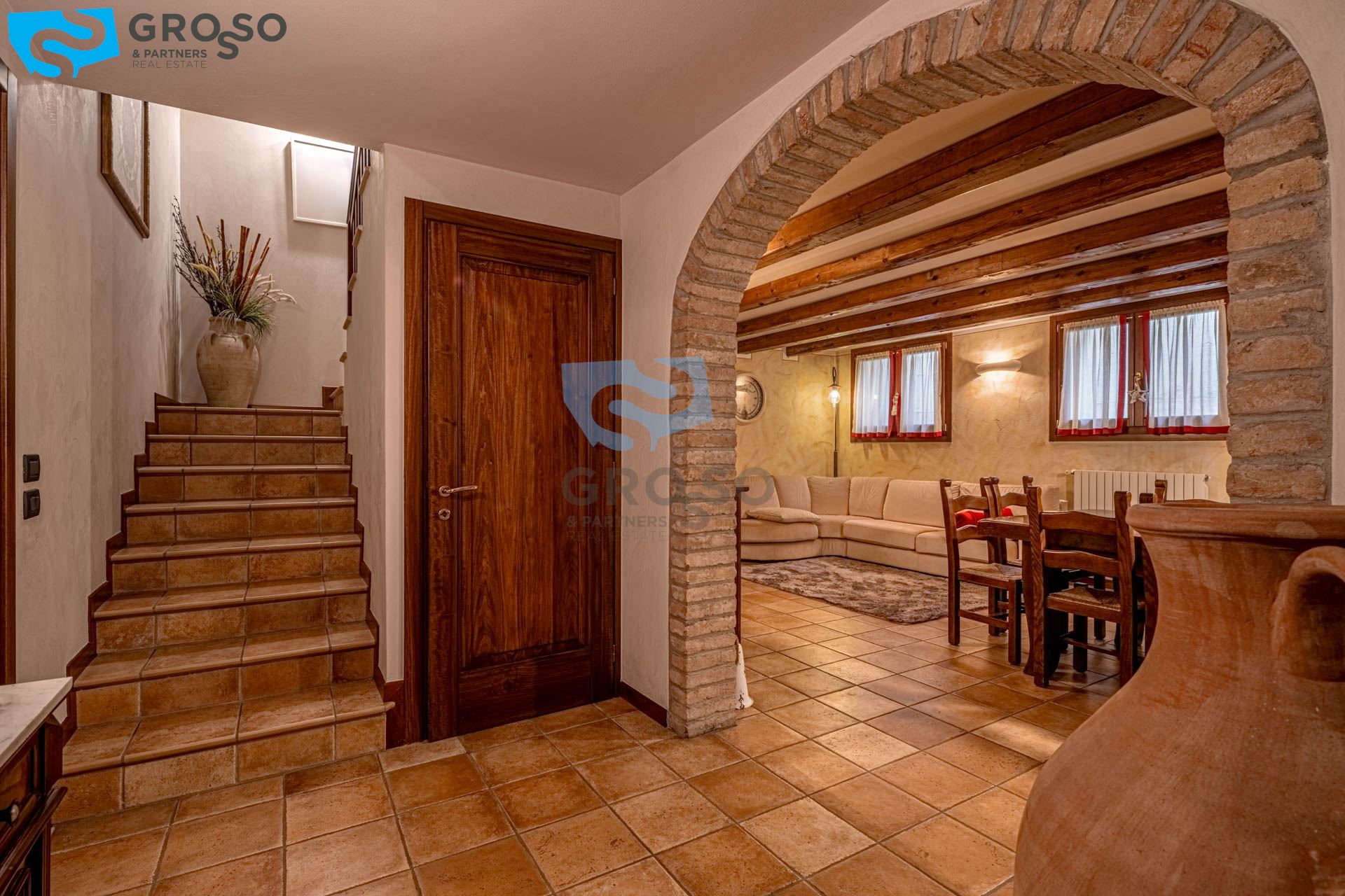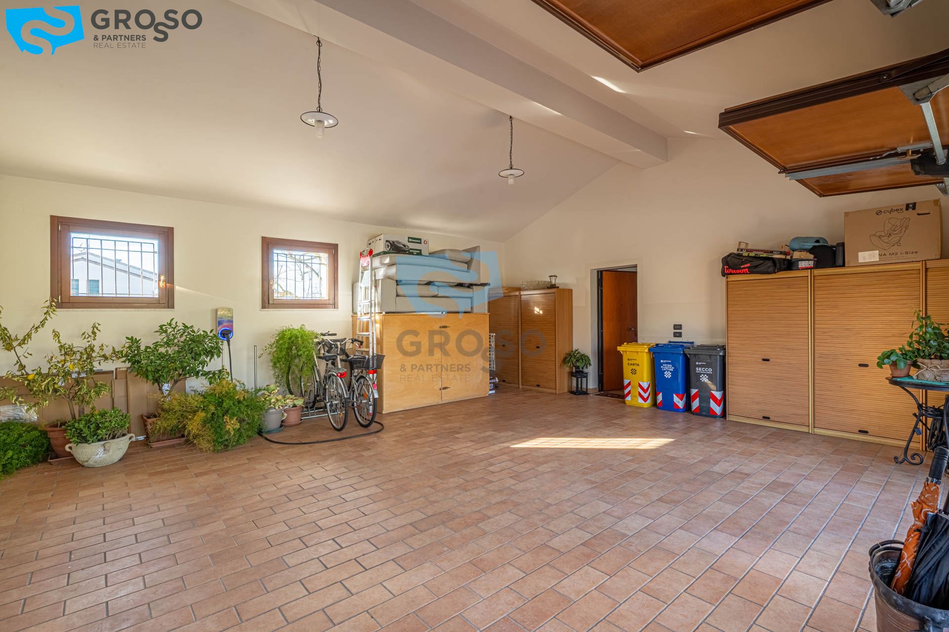 L'ingresso al piano terra si apre su un luminoso soggiorno, ambiente accogliente e ben distribuito, affiancato da una cucina separata che garantisce funzionalità e riservatezza. Sempre al piano troviamo un bagno per gli ospiti, una comoda lavanderia e un ampio garage doppio di circa 50 mq, perfetto per ospitare due auto e offrire ulteriore spazio di deposito.