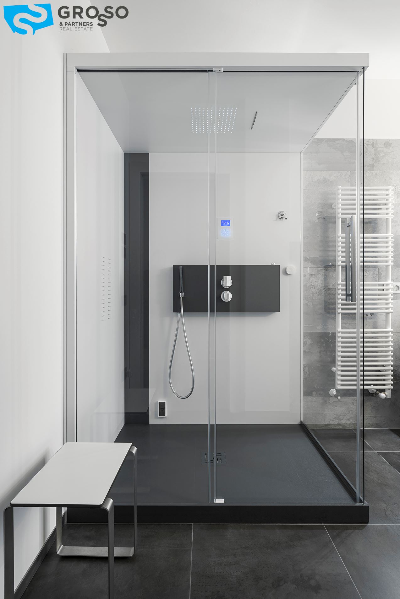 La zona notte è un'oasi di comfort e tranquillità, composta da tre camere spaziose e due bagni eleganti, uno dei quali arricchito da una cabina doccia con bagno turco e cromoterapia; un vero angolo benessere privato.