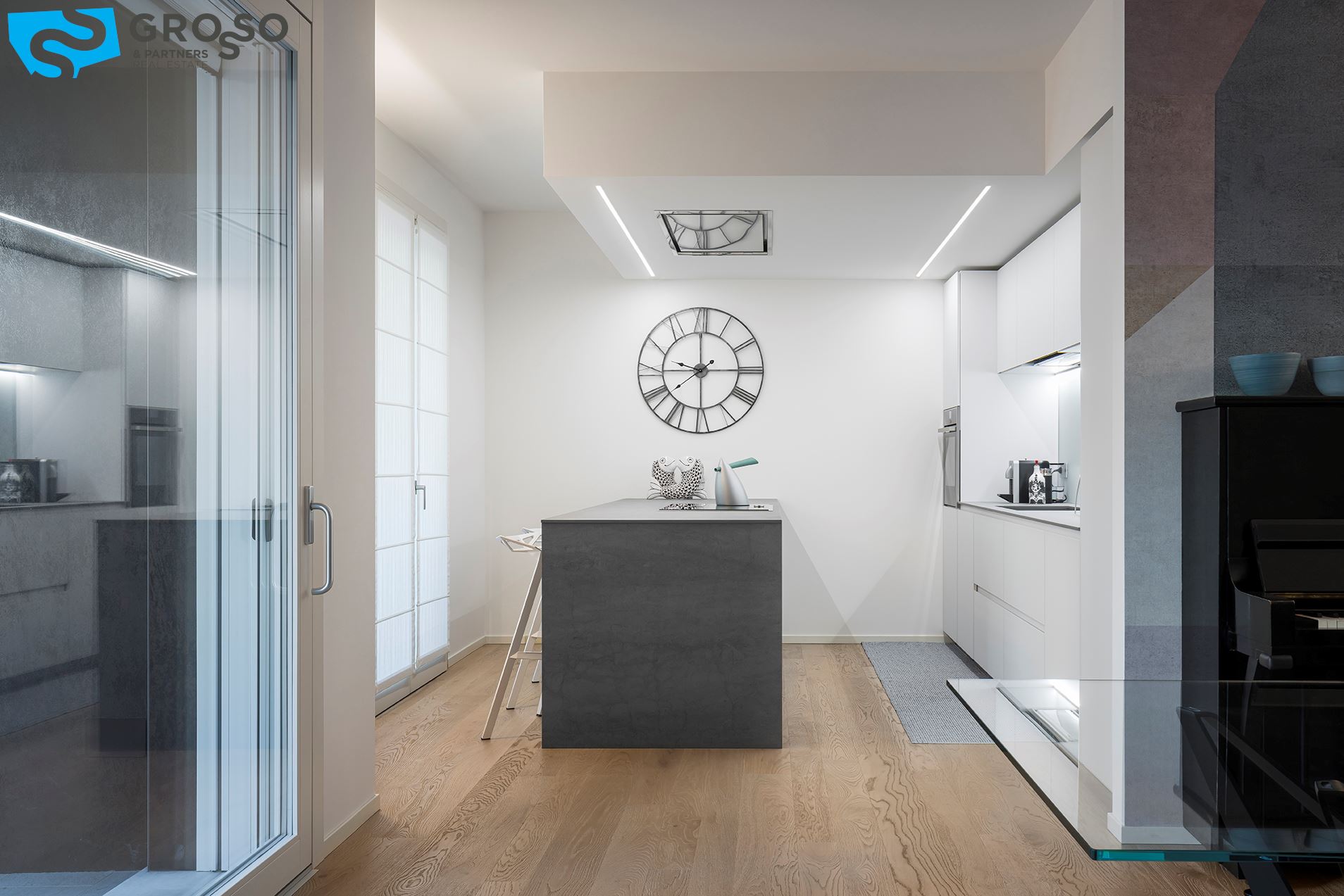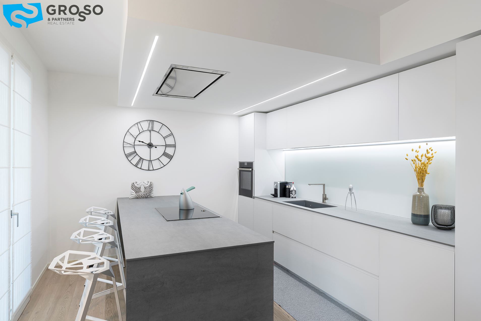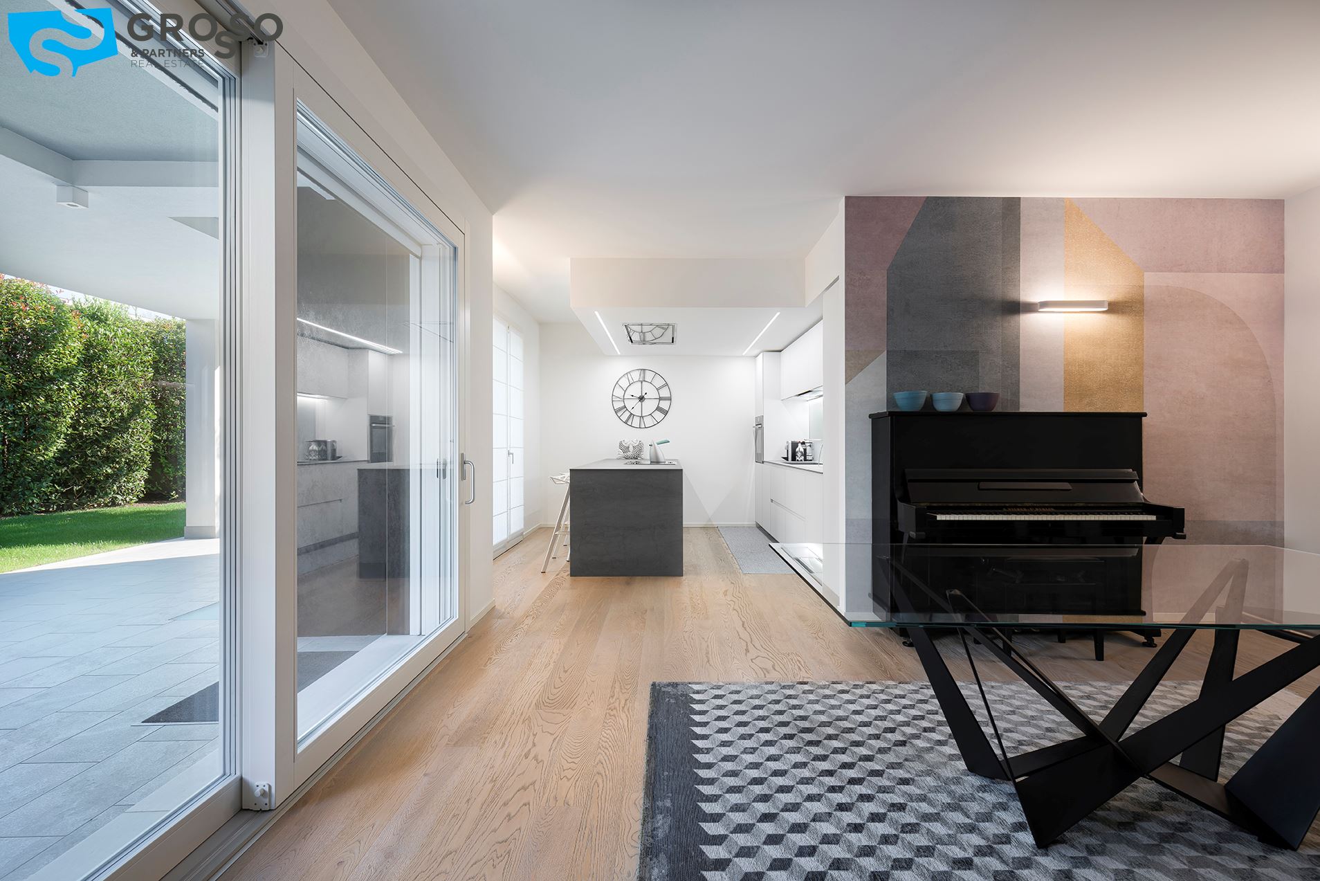 L'abitazione, situata al piano terra, accoglie gli ospiti in una zona giorno di oltre 50 mq, ampia e luminosa, dove grandi vetrate regalano una splendida luce naturale e una sensazione di continuità tra interno ed esterno. La cucina moderna, dal design raffinato e funzionale, è pensata per vivere ogni momento con stile e convivialità.
