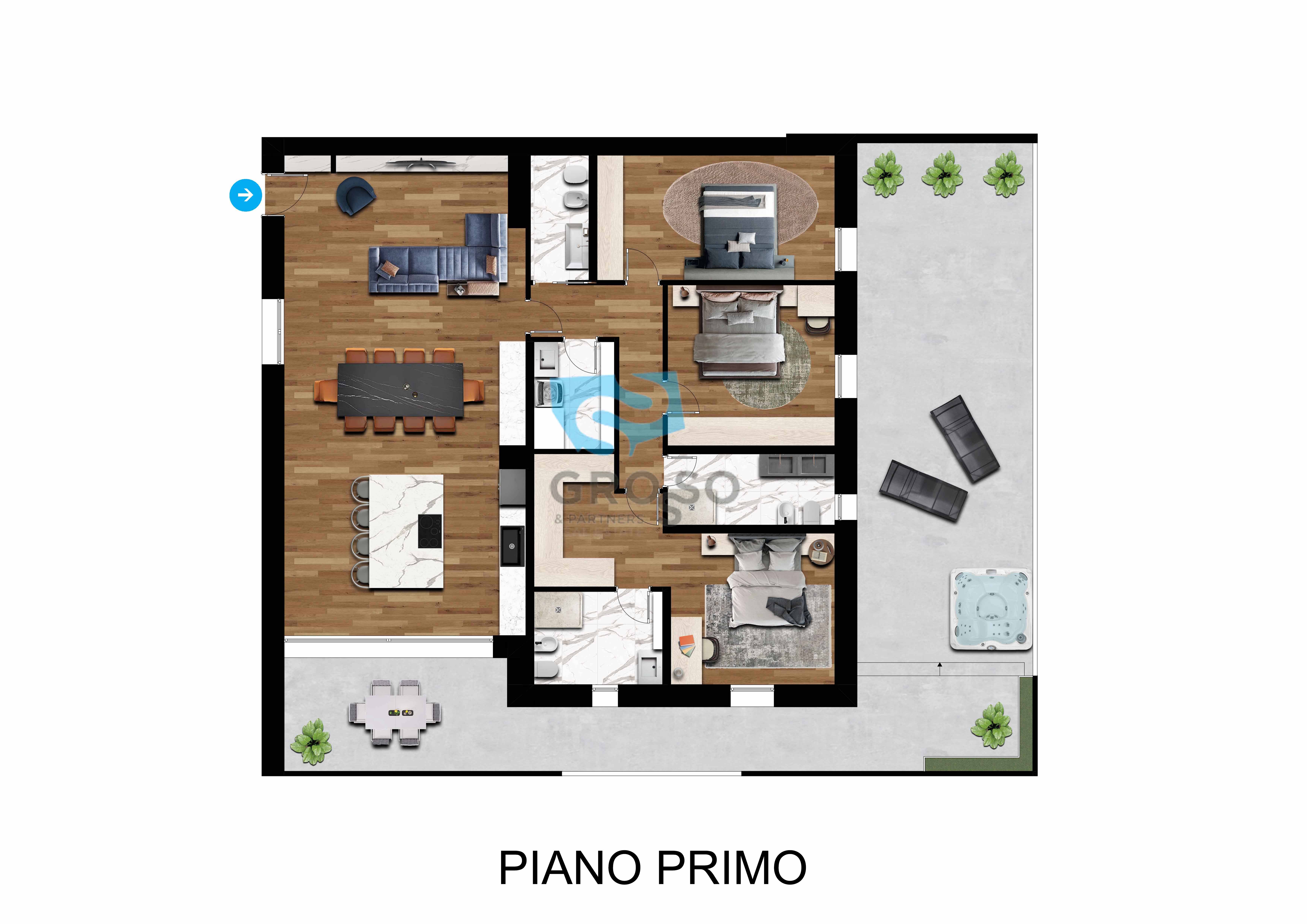 La zona notte comprende tre camere matrimoniali, di cui una padronale con stanza guardaroba dedicata, tre bagni finestrati e una comoda lavanderia di servizio, a garanzia di funzionalità e comfort per tutta la famiglia.
